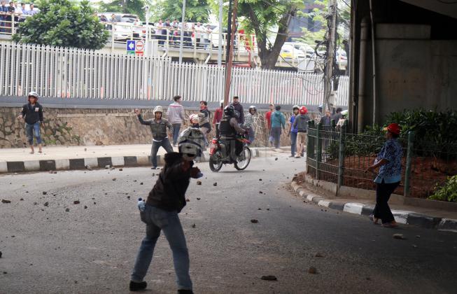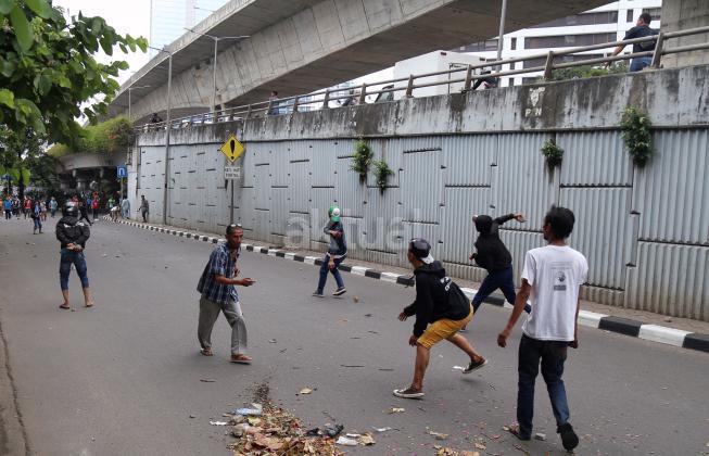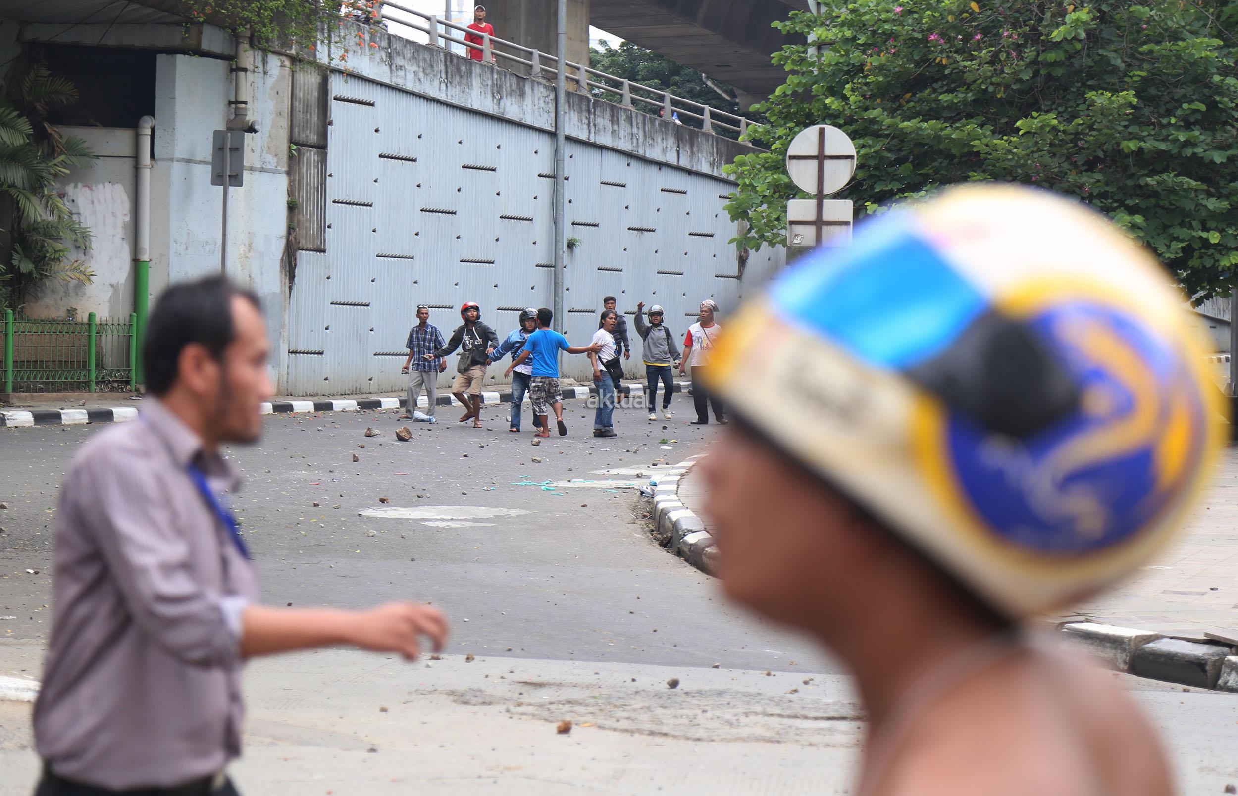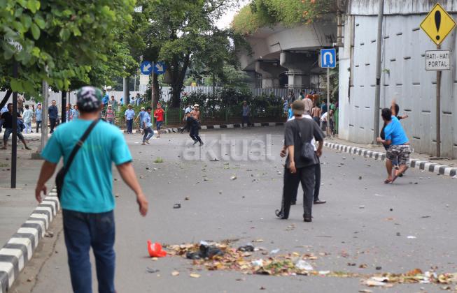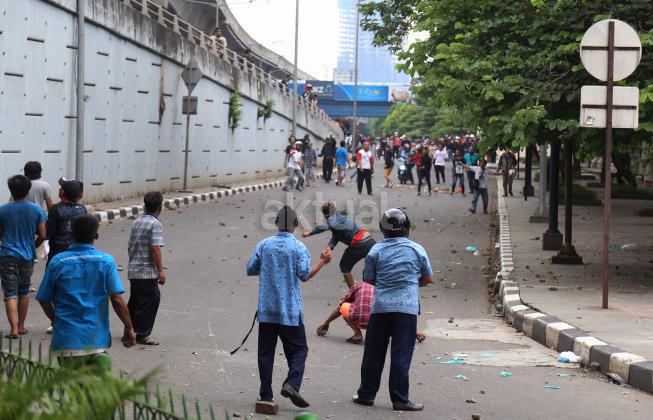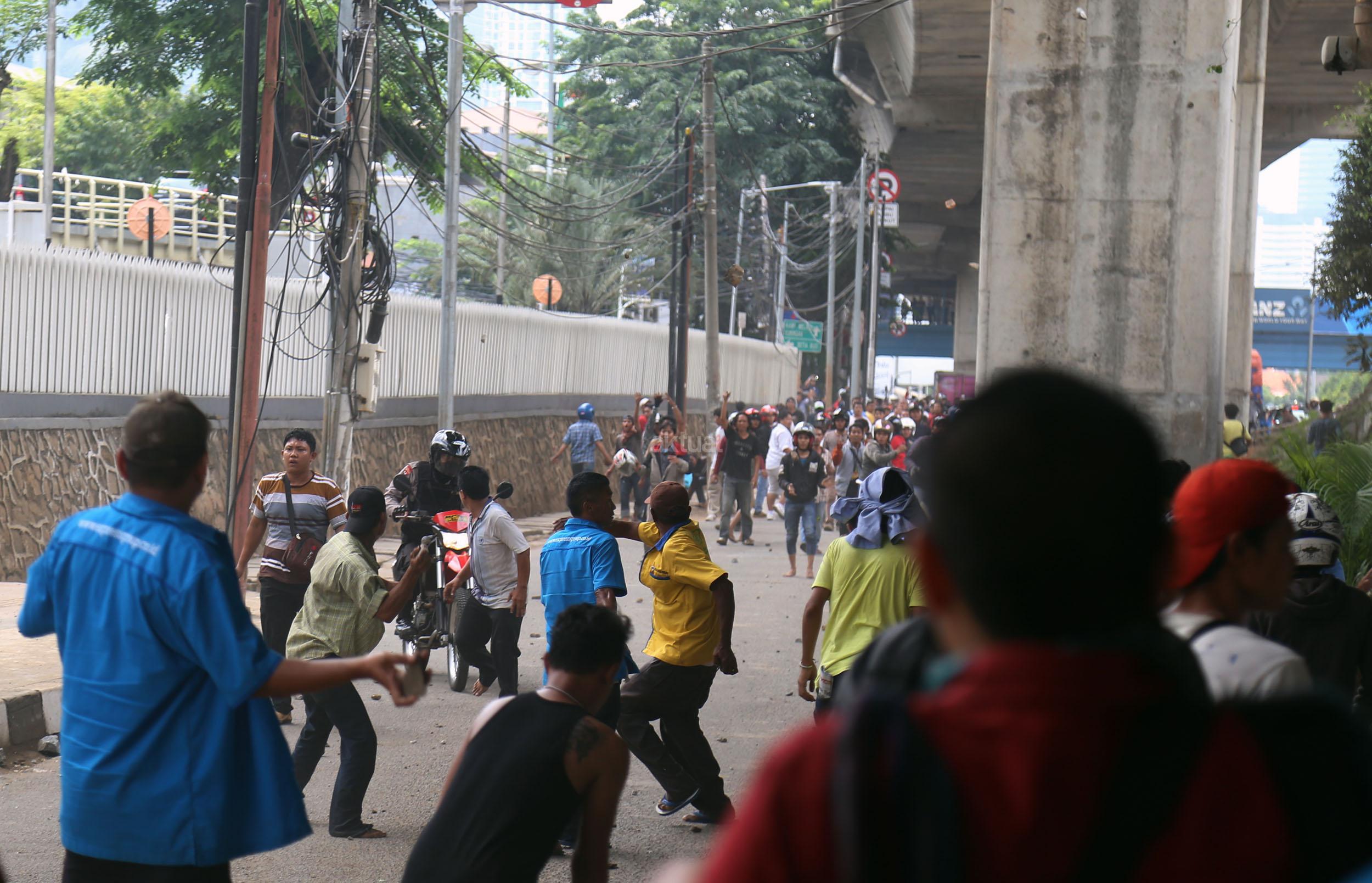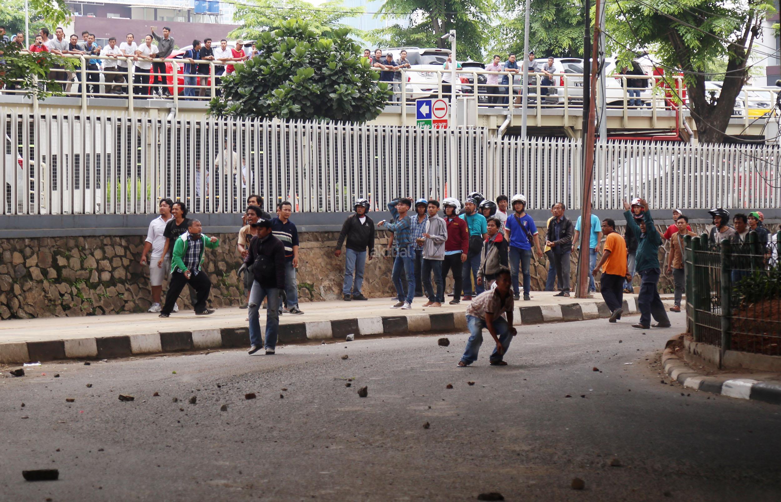 Supir taksi dan warga saling lempar batu saat aksi menolak keberadaan angkutan umum online di Jakarta, Selasa (22/3/2016). Ribuan sopir taksi, bajaj dan sejumlah angkutan umum lainnya melakukan mogok massal untuk menolak keberadaan transportasi umum berbasis aplikasi.