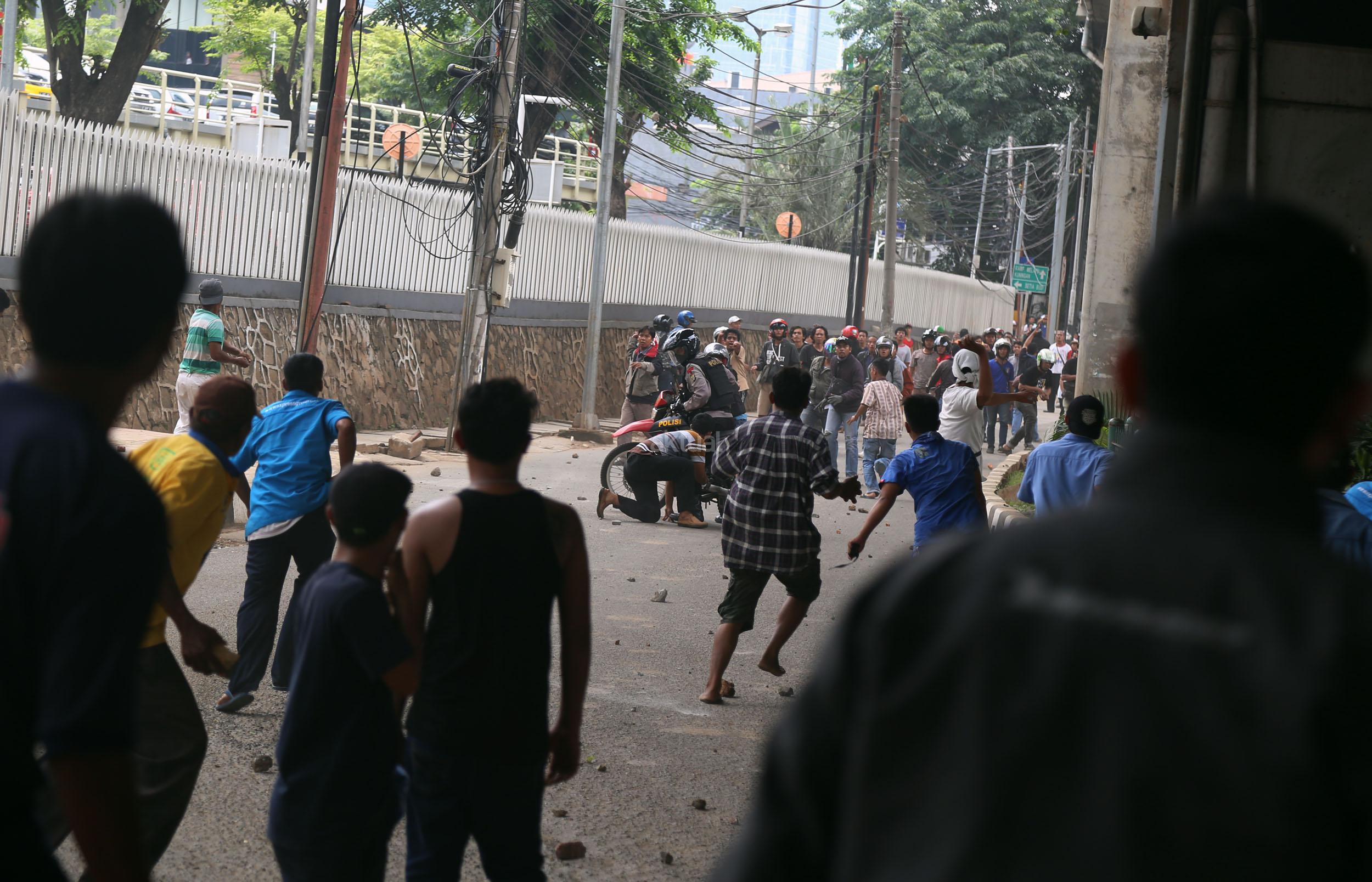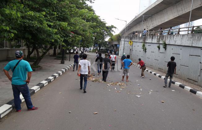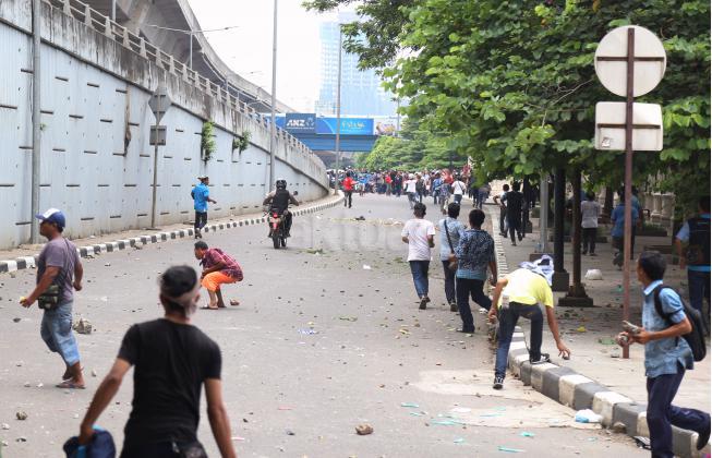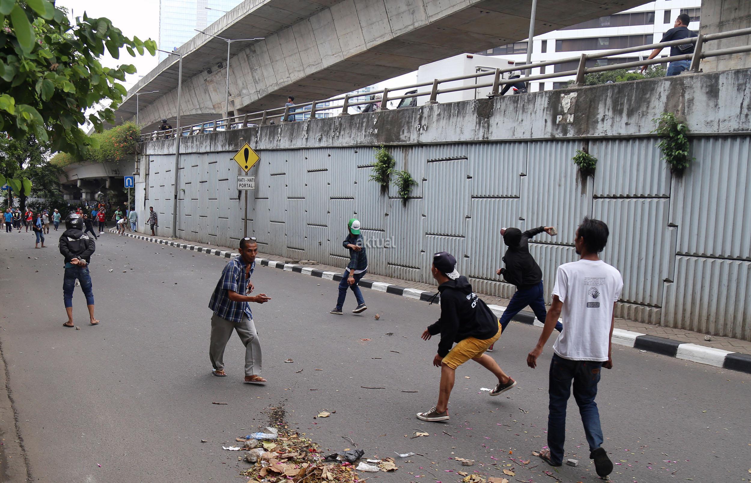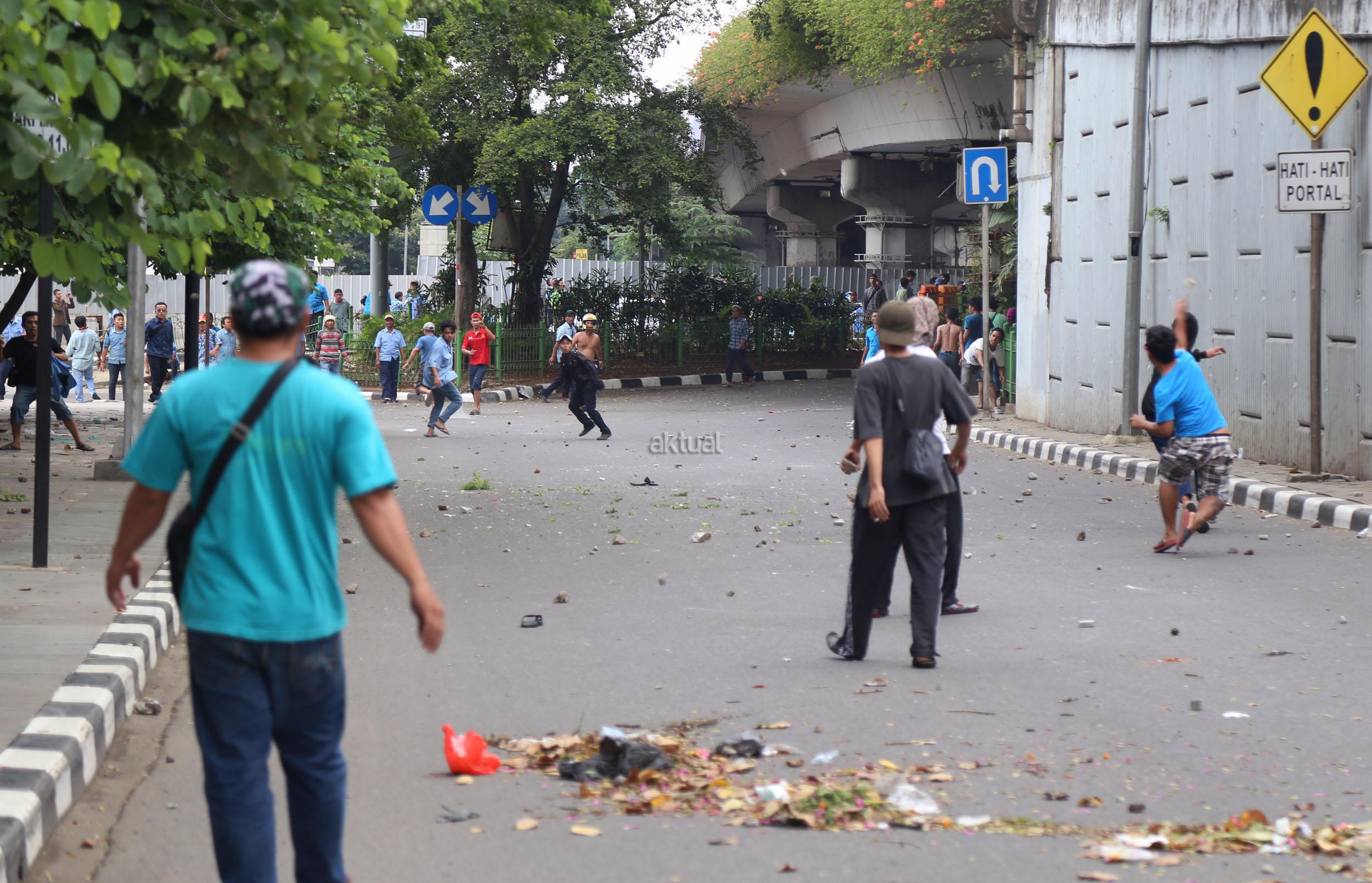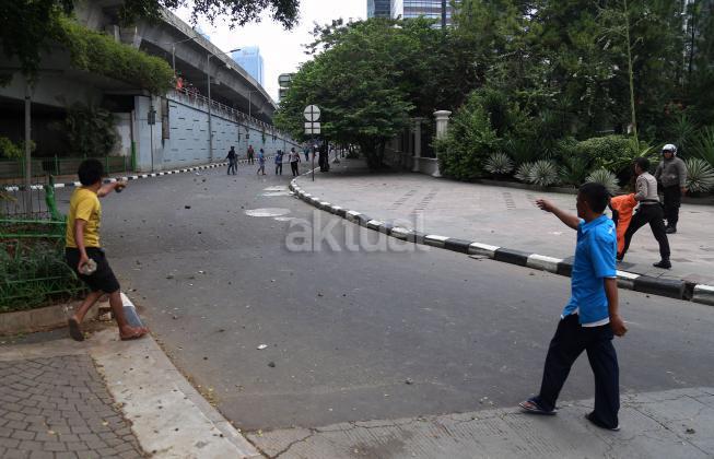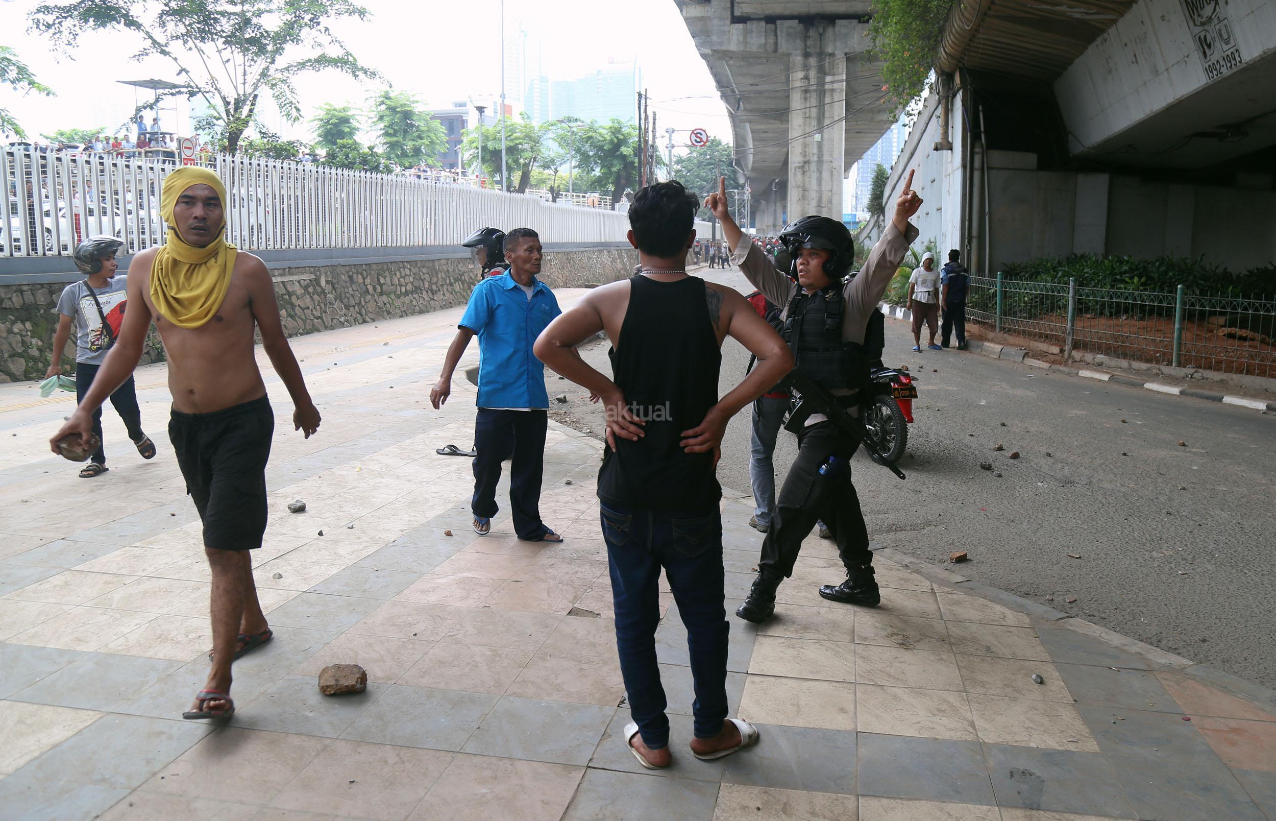 Supir taksi dan warga saling lempar batu saat aksi menolak keberadaan angkutan umum online di Jakarta, Selasa (22/3/2016). Ribuan sopir taksi, bajaj dan sejumlah angkutan umum lainnya melakukan mogok massal untuk menolak keberadaan transportasi umum berbasis aplikasi.