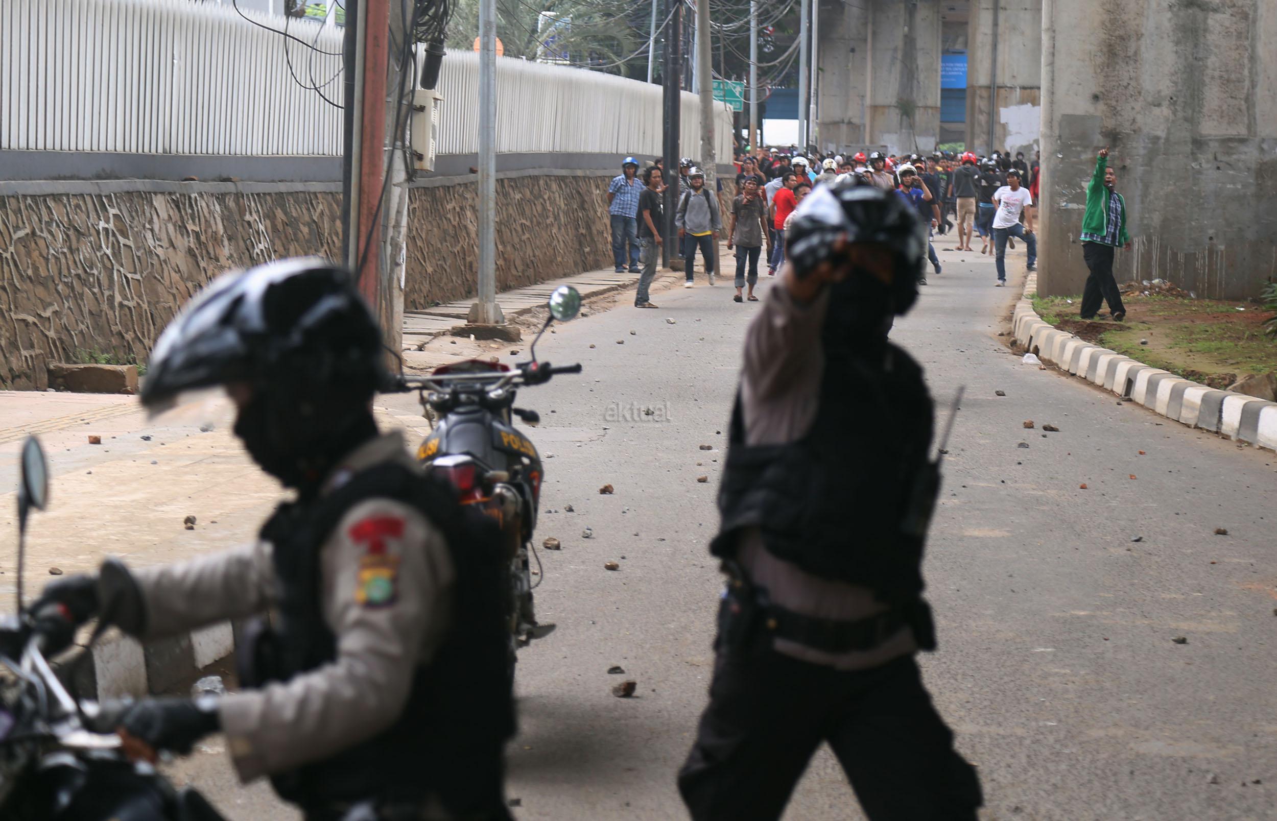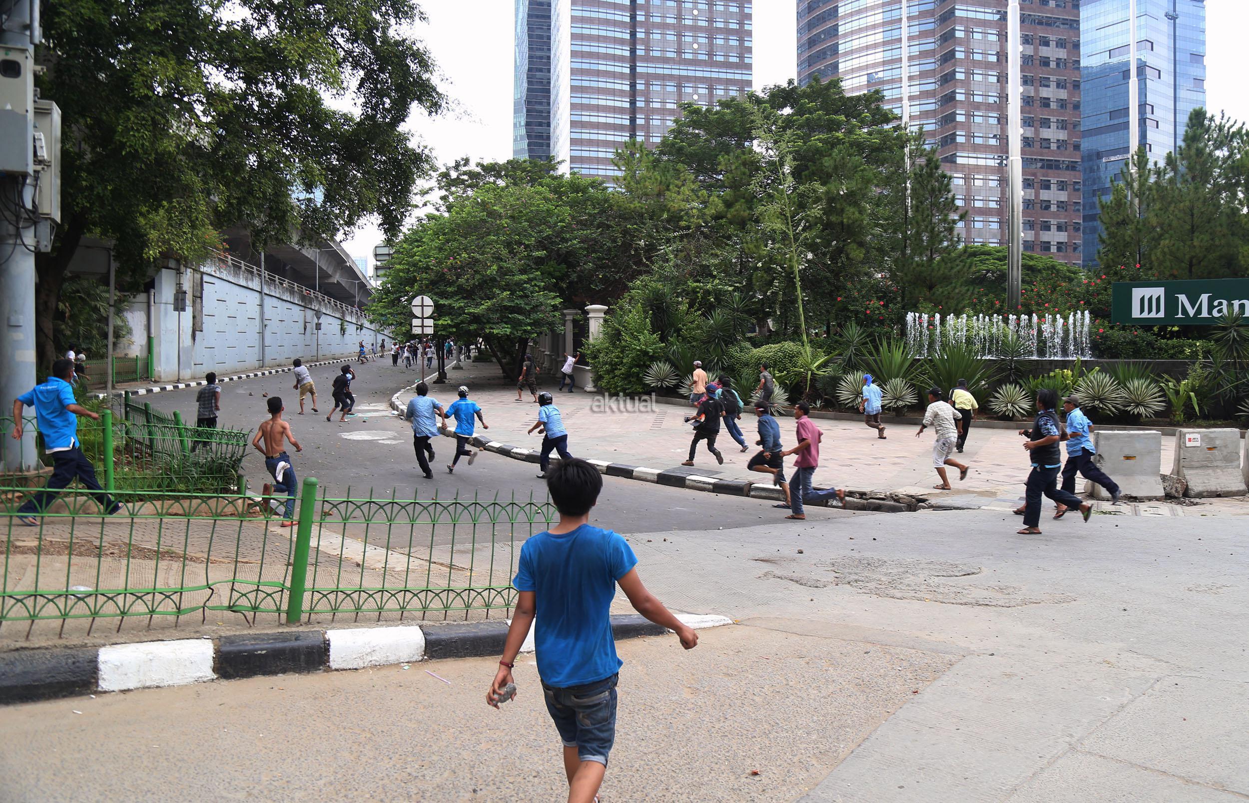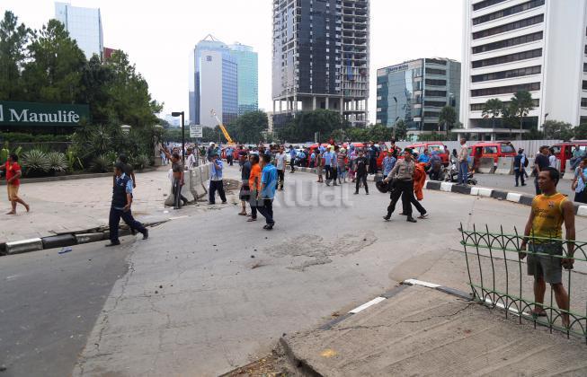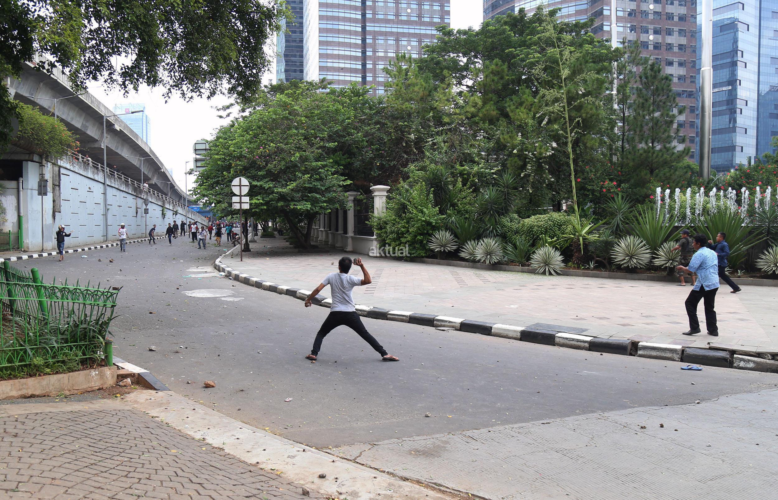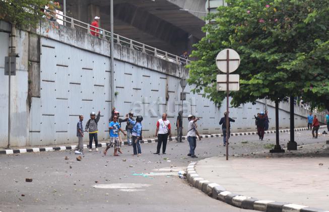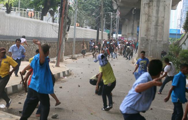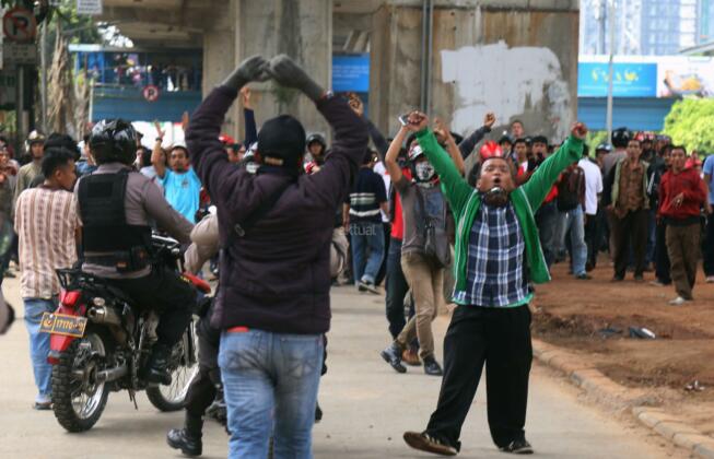 Supir taksi dan warga saling lempar batu saat aksi menolak keberadaan angkutan umum online di Jakarta, Selasa (22/3/2016). Ribuan sopir taksi, bajaj dan sejumlah angkutan umum lainnya melakukan mogok massal untuk menolak keberadaan transportasi umum berbasis aplikasi.