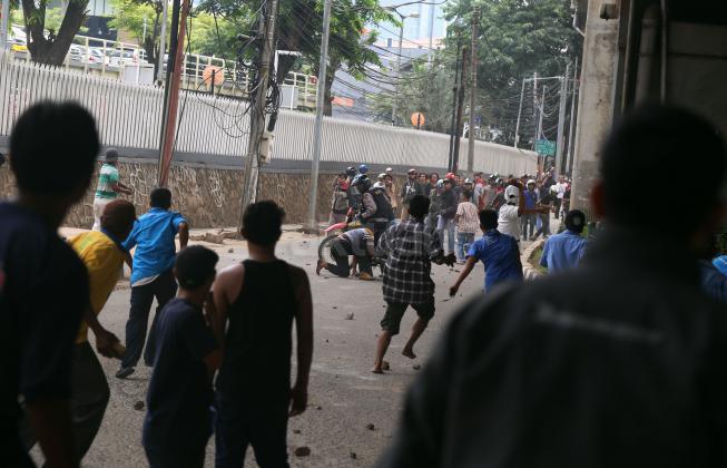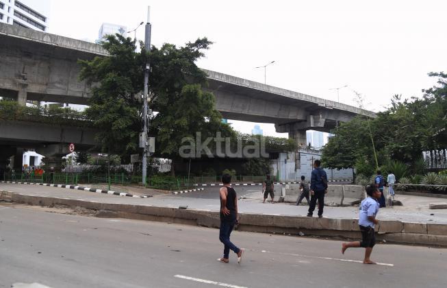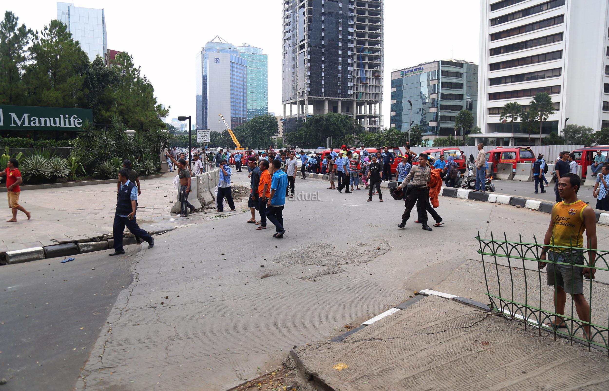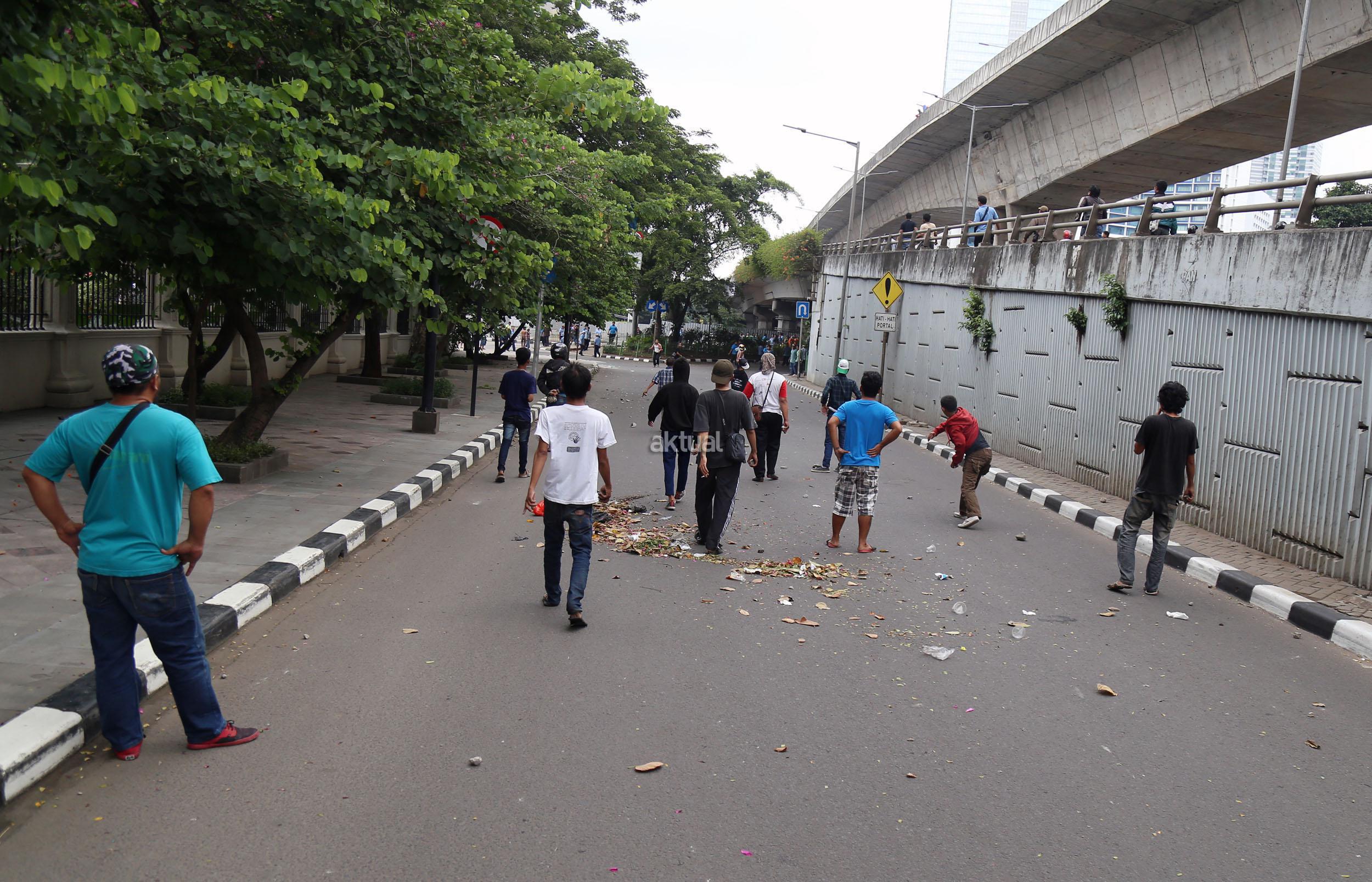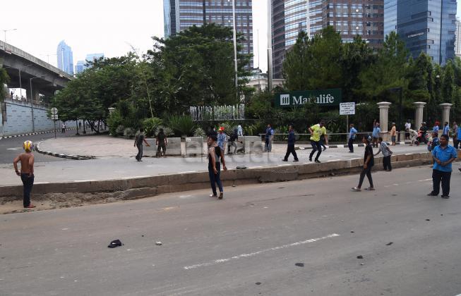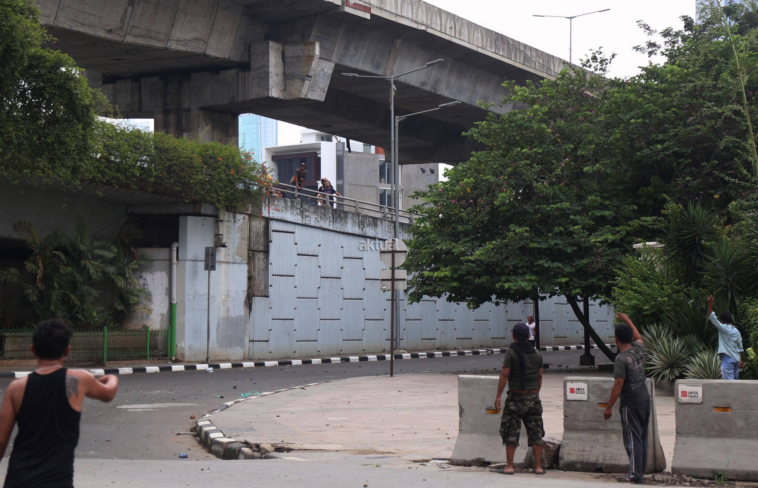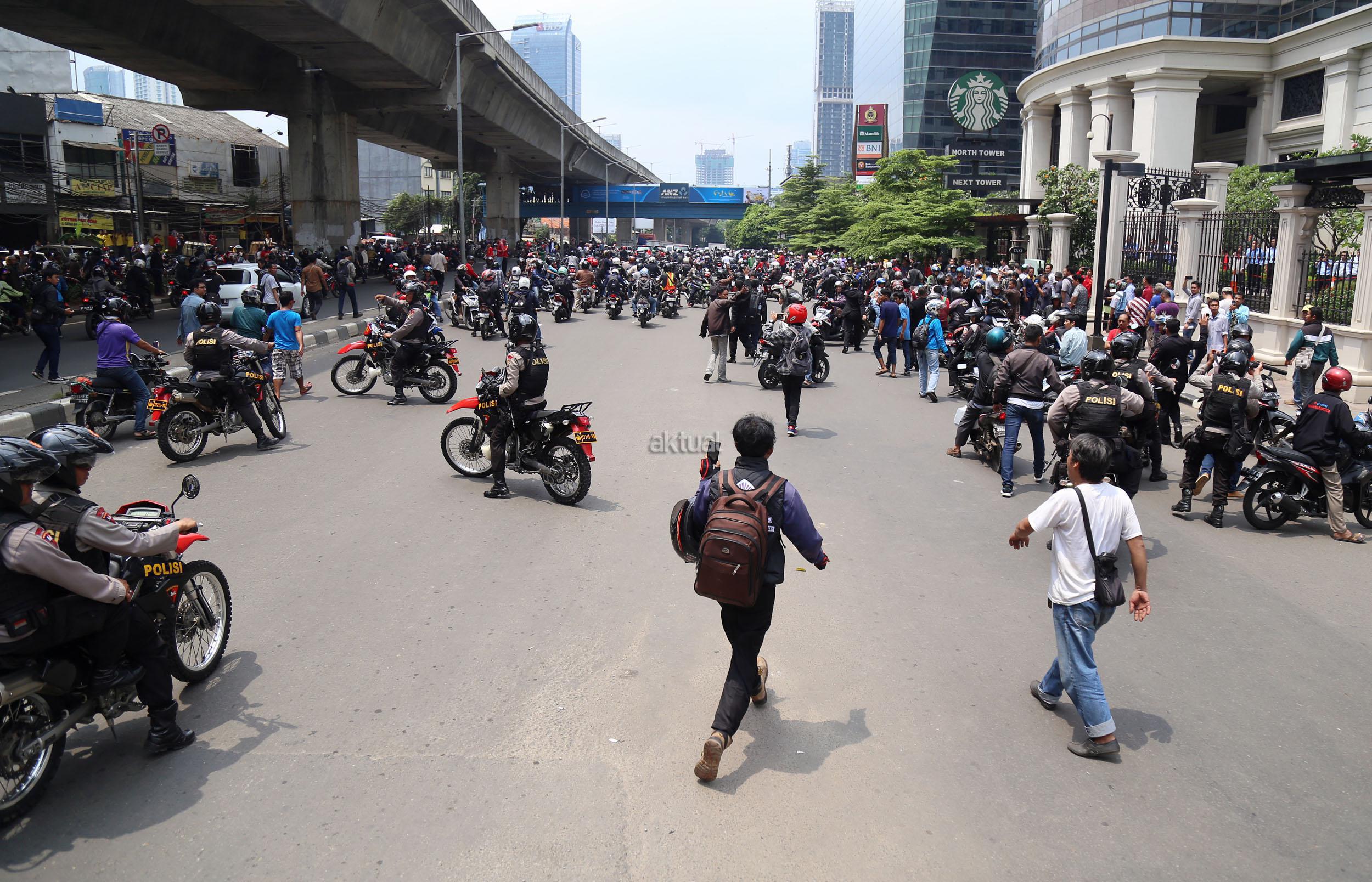 Supir taksi dan warga saling lempar batu saat aksi menolak keberadaan angkutan umum online di Jakarta, Selasa (22/3/2016). Ribuan sopir taksi, bajaj dan sejumlah angkutan umum lainnya melakukan mogok massal untuk menolak keberadaan transportasi umum berbasis aplikasi.
