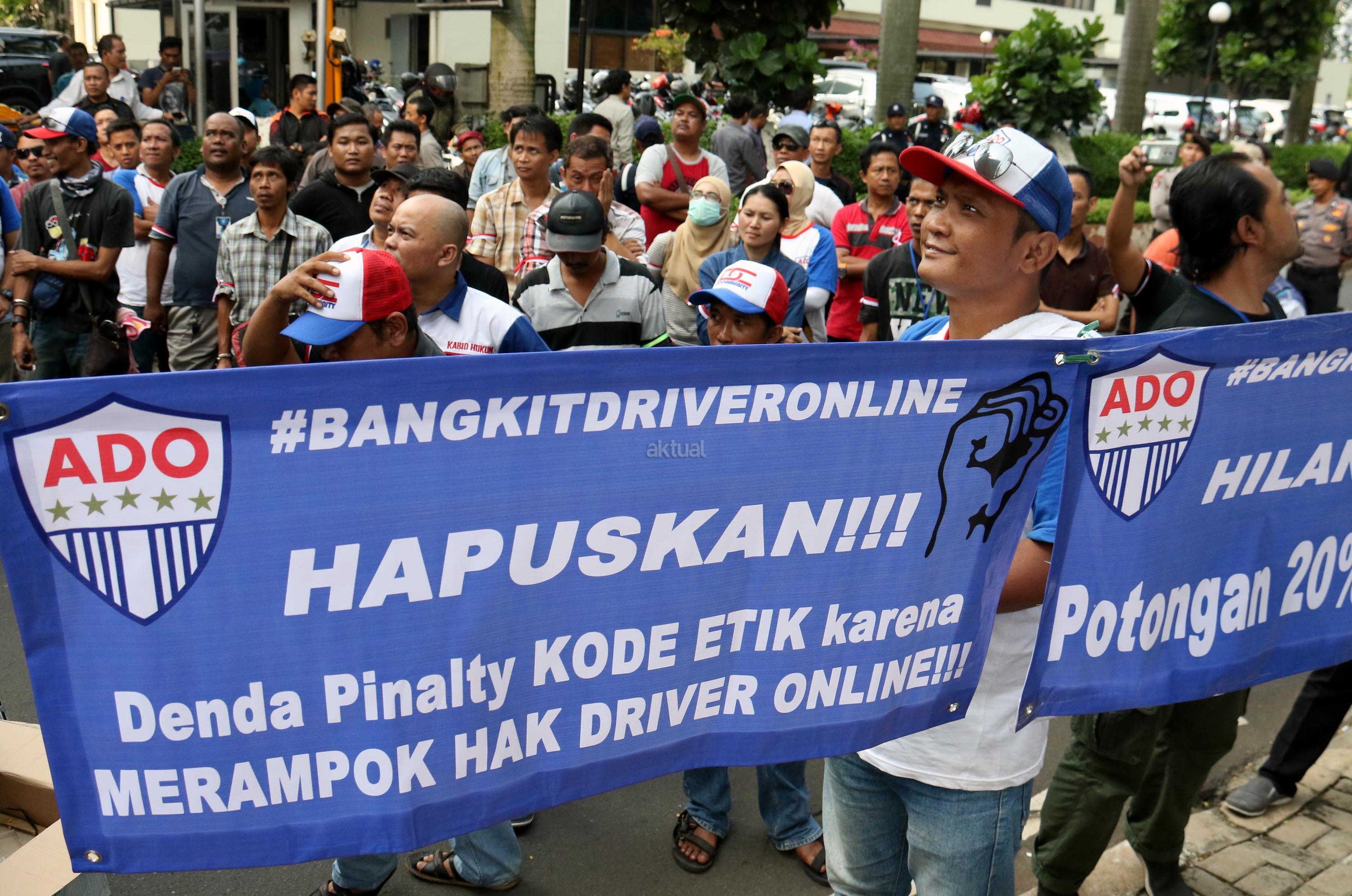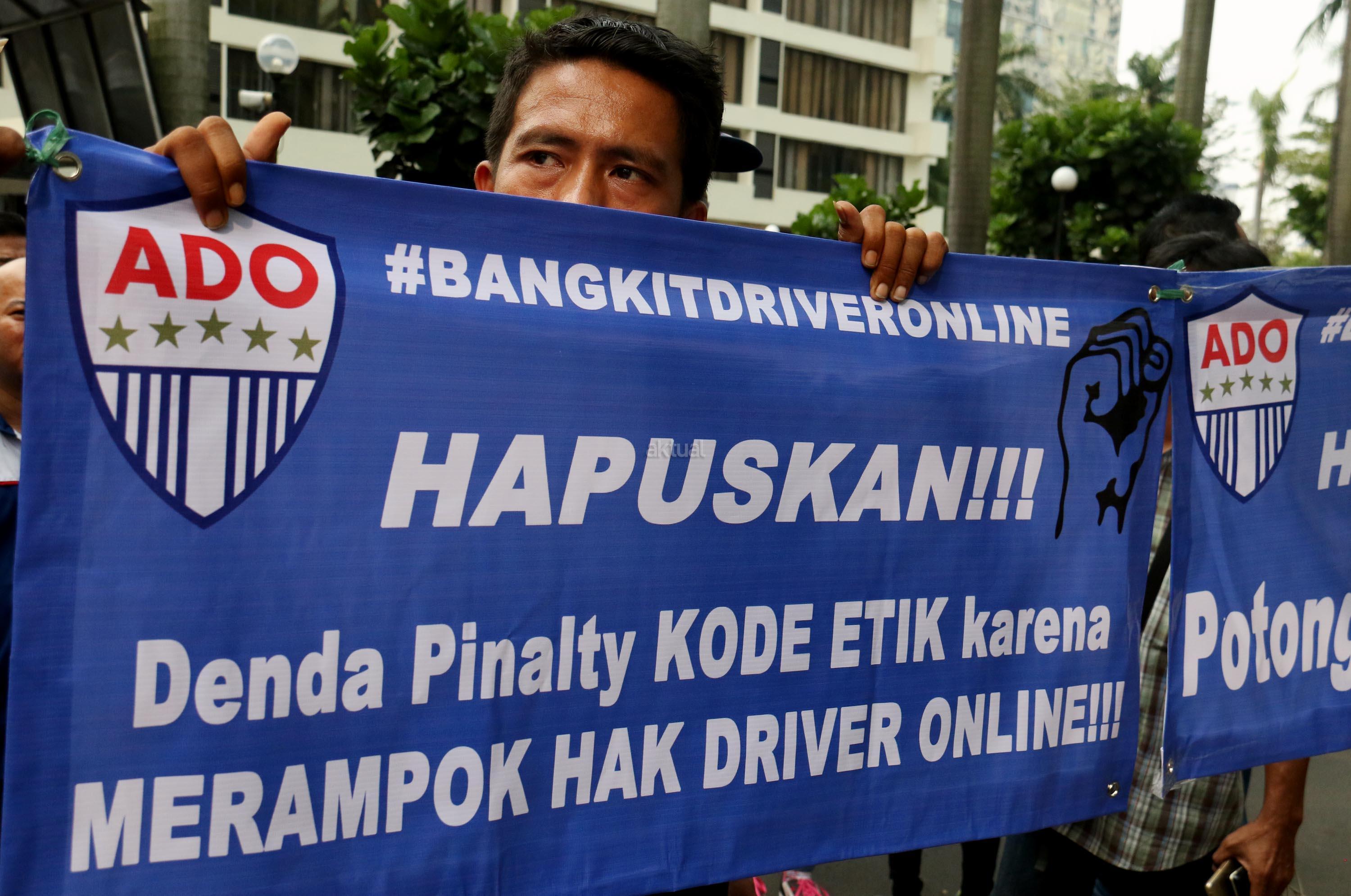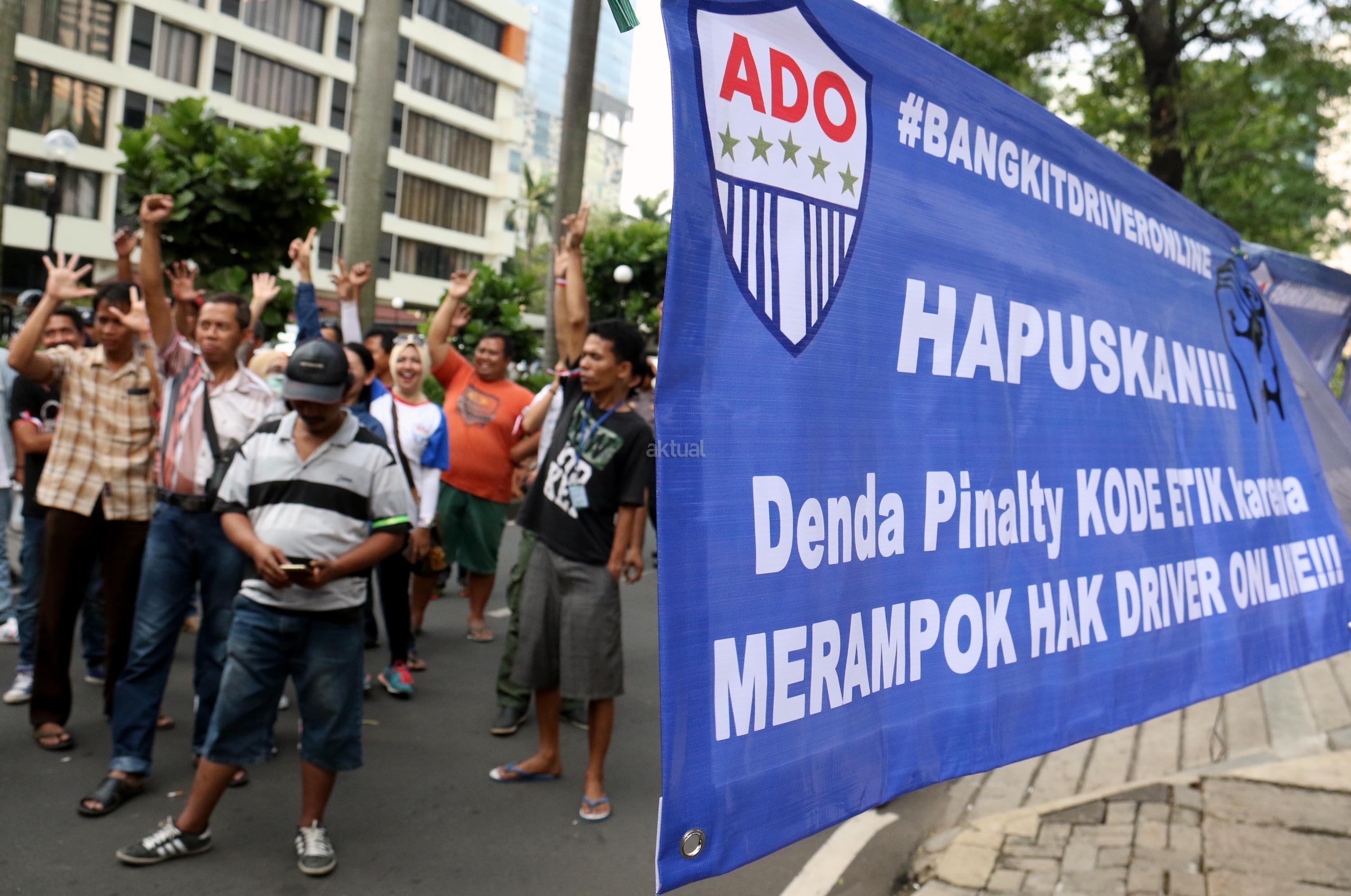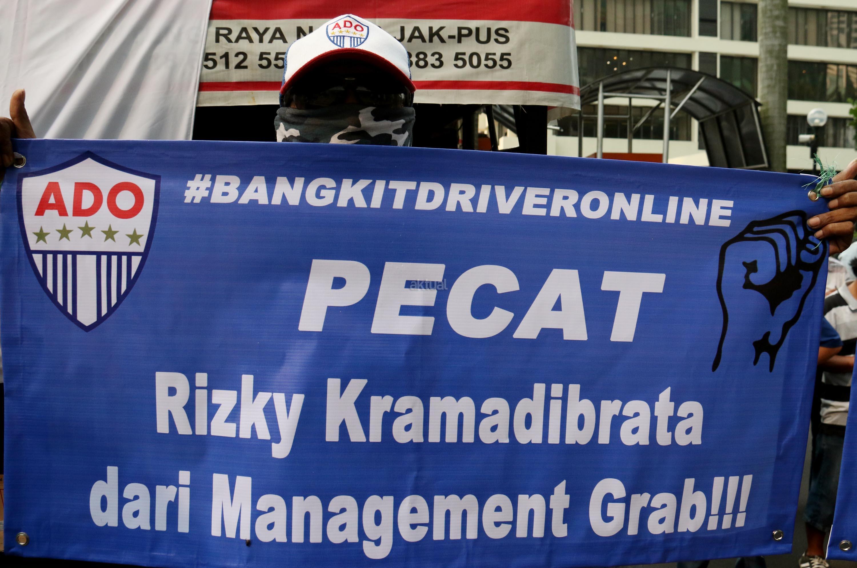 Puluhan driver online yang tergabung dalam Asosiasi Driver Online (ADO) melakukan aksi demontrasi di depan kantor Management Grab di Lippo Kuningan, Jakarta, Senin (10/7/2017). Dalam aksinya para driver online mendesak kepada Management Grab untuk hapuskan denda pinalty kode etik karena merampok hak para driver online dan segera tutup pendaftaran driver baru. AKTUAL/Munzir