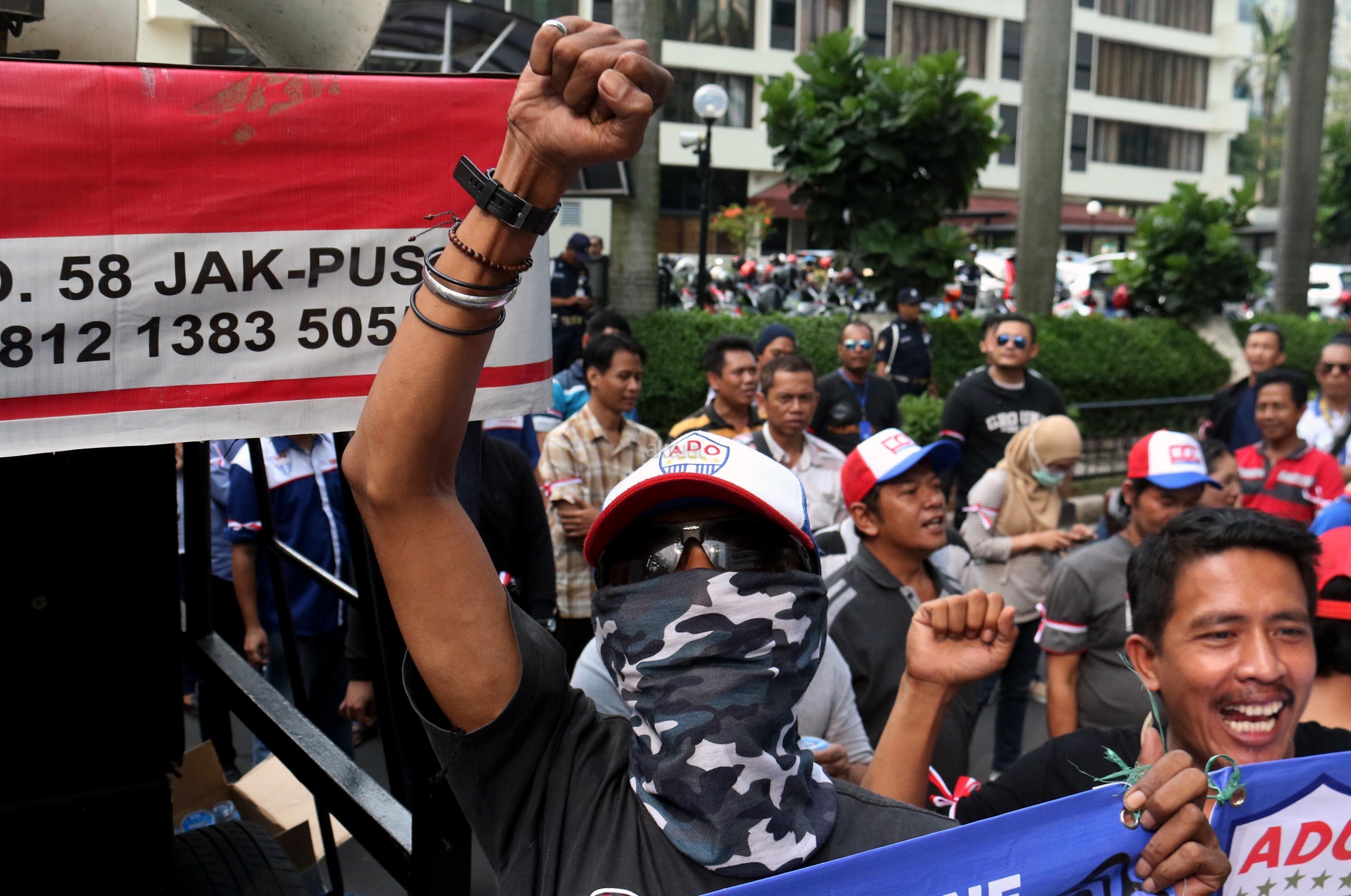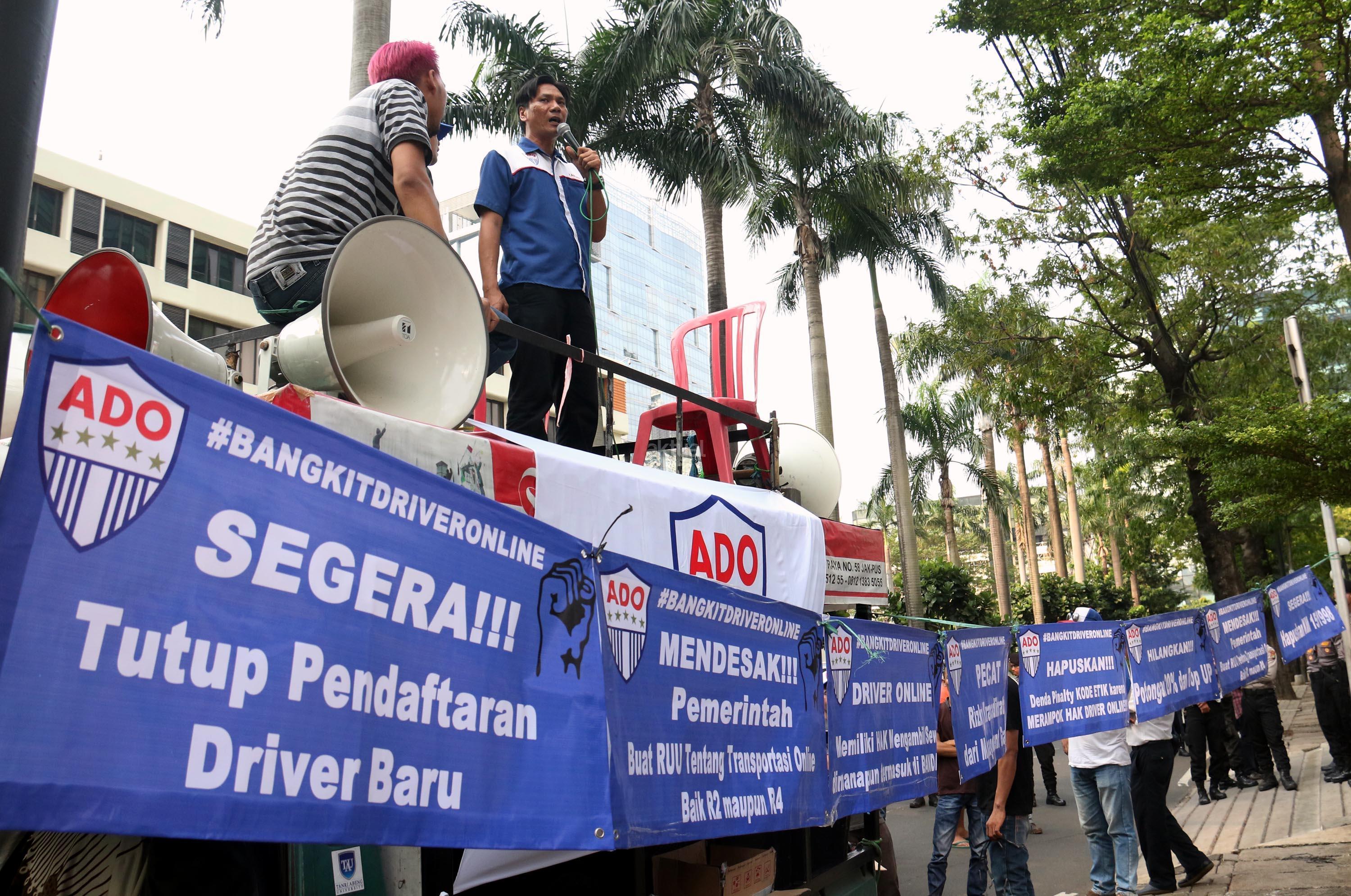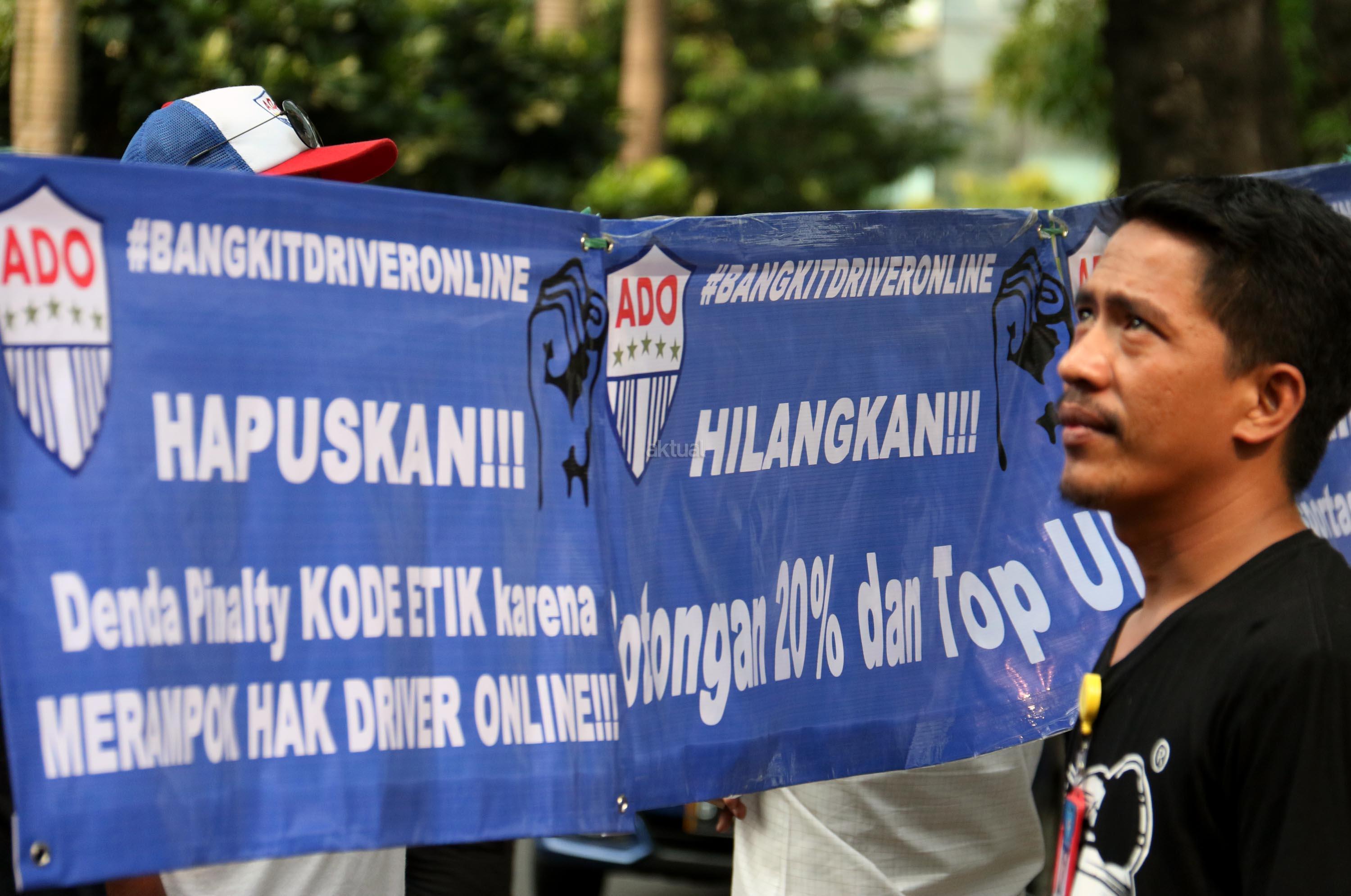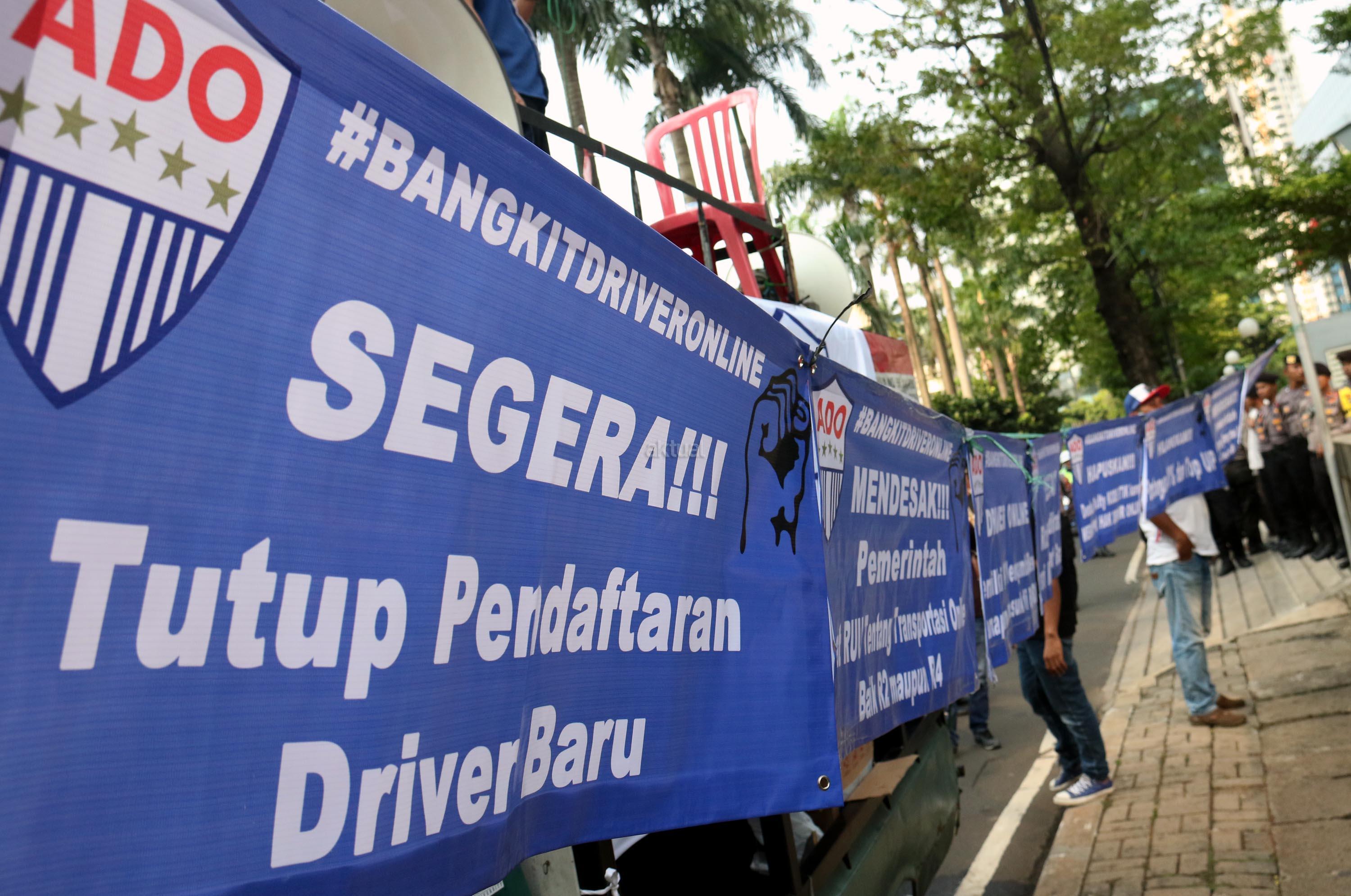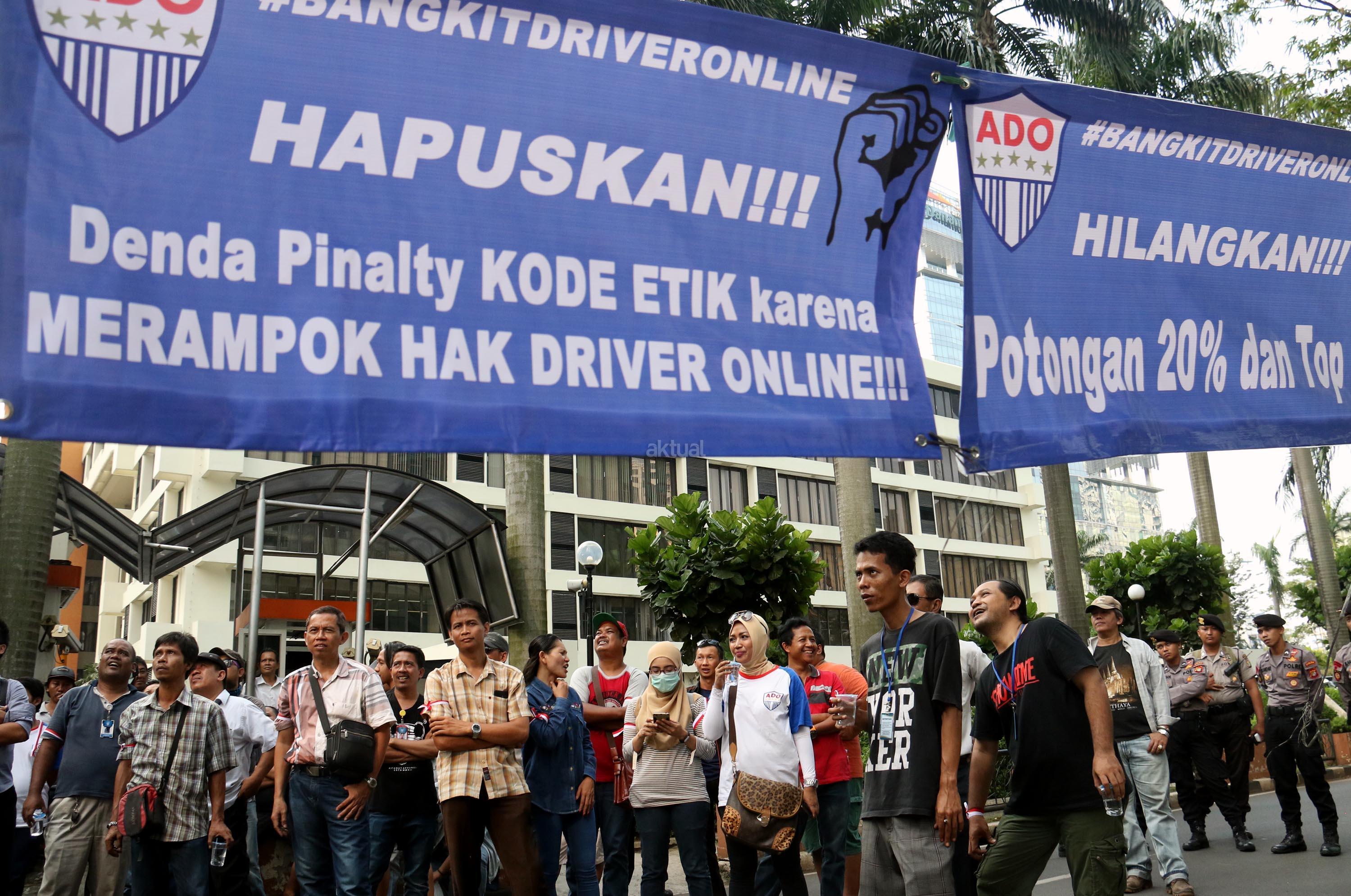 Puluhan driver online yang tergabung dalam Asosiasi Driver Online (ADO) melakukan aksi demontrasi di depan kantor Management Grab di Lippo Kuningan, Jakarta, Senin (10/7/2017). Dalam aksinya para driver online mendesak kepada Management Grab untuk hapuskan denda pinalty kode etik karena merampok hak para driver online dan segera tutup pendaftaran driver baru. AKTUAL/Munzir