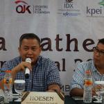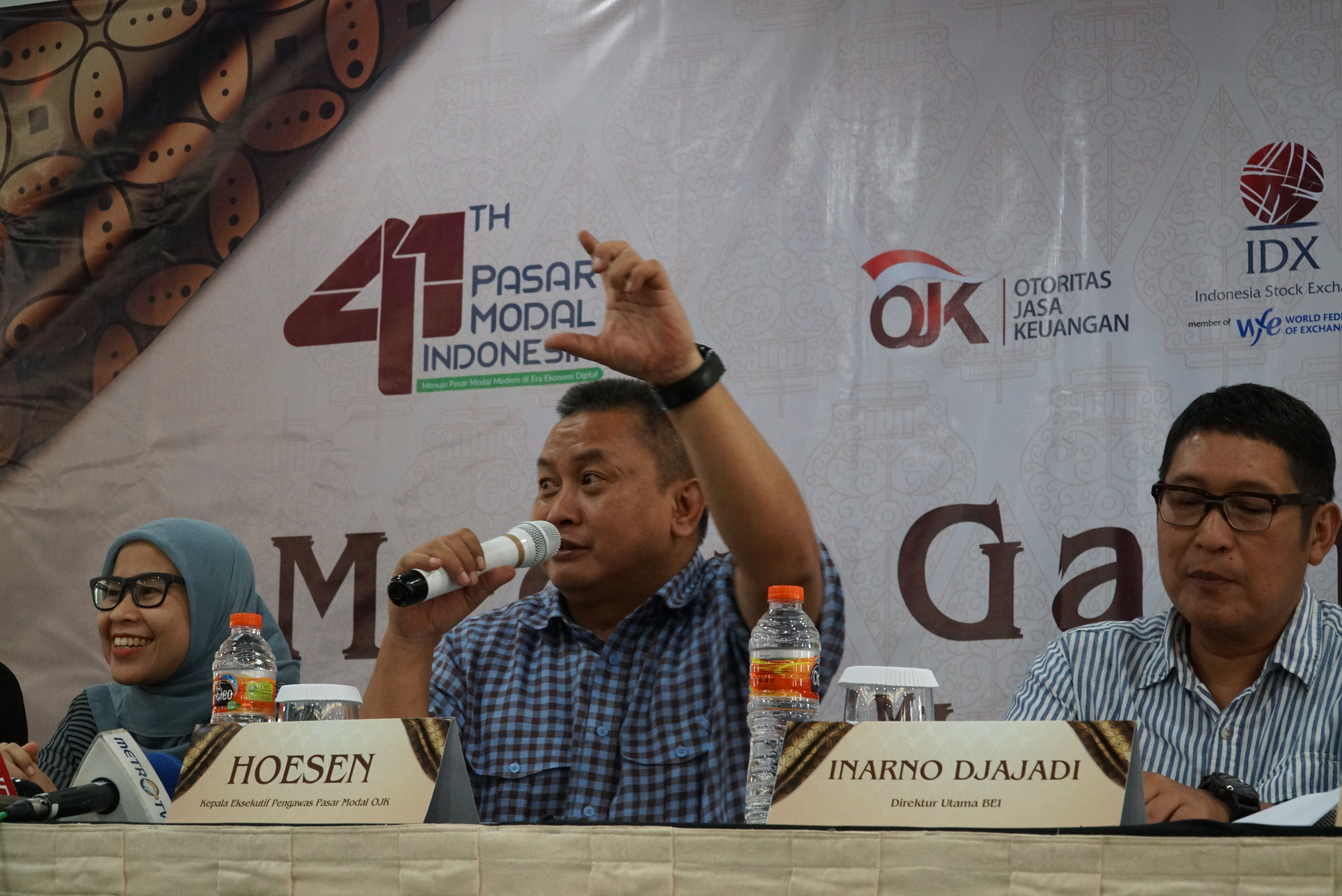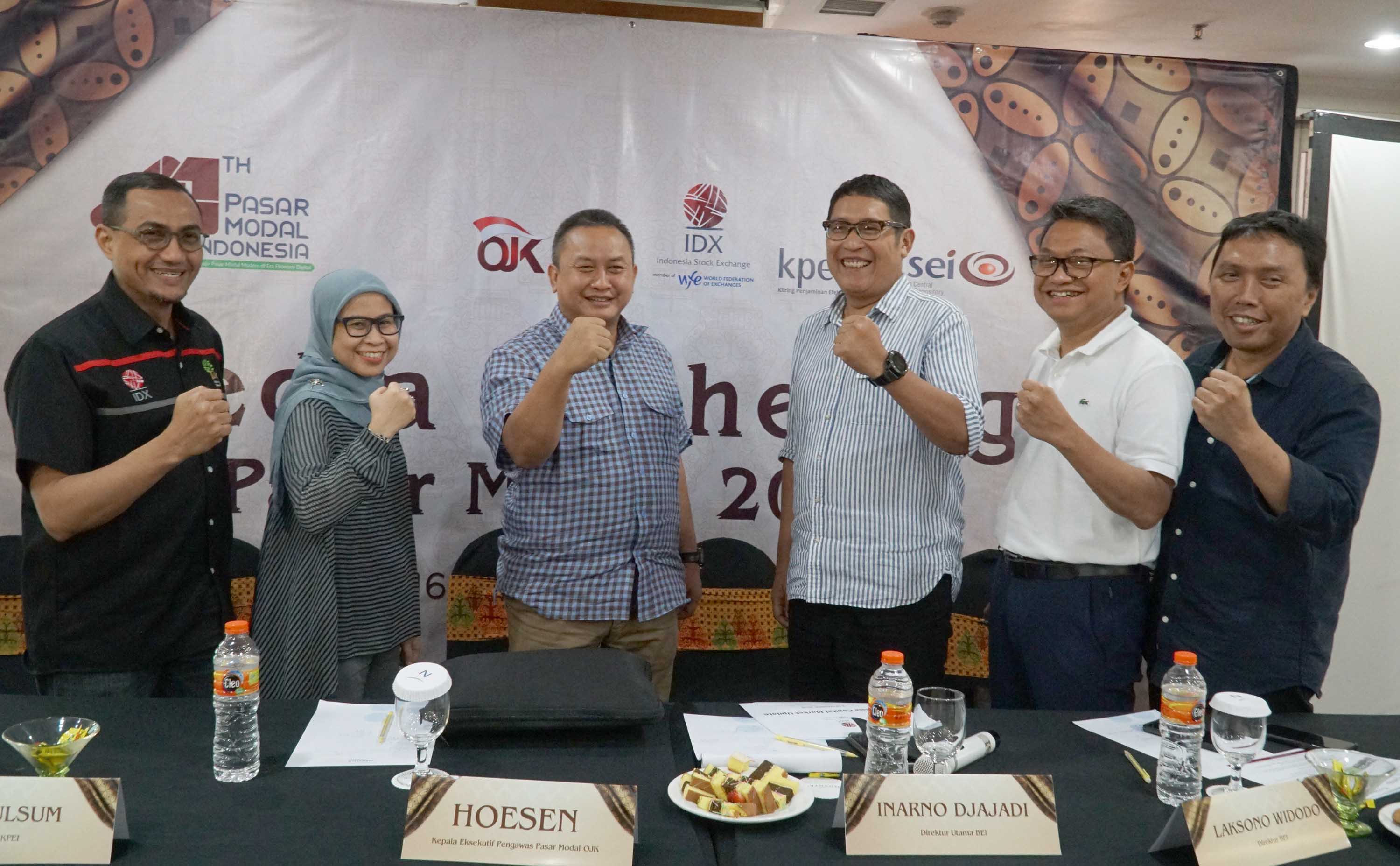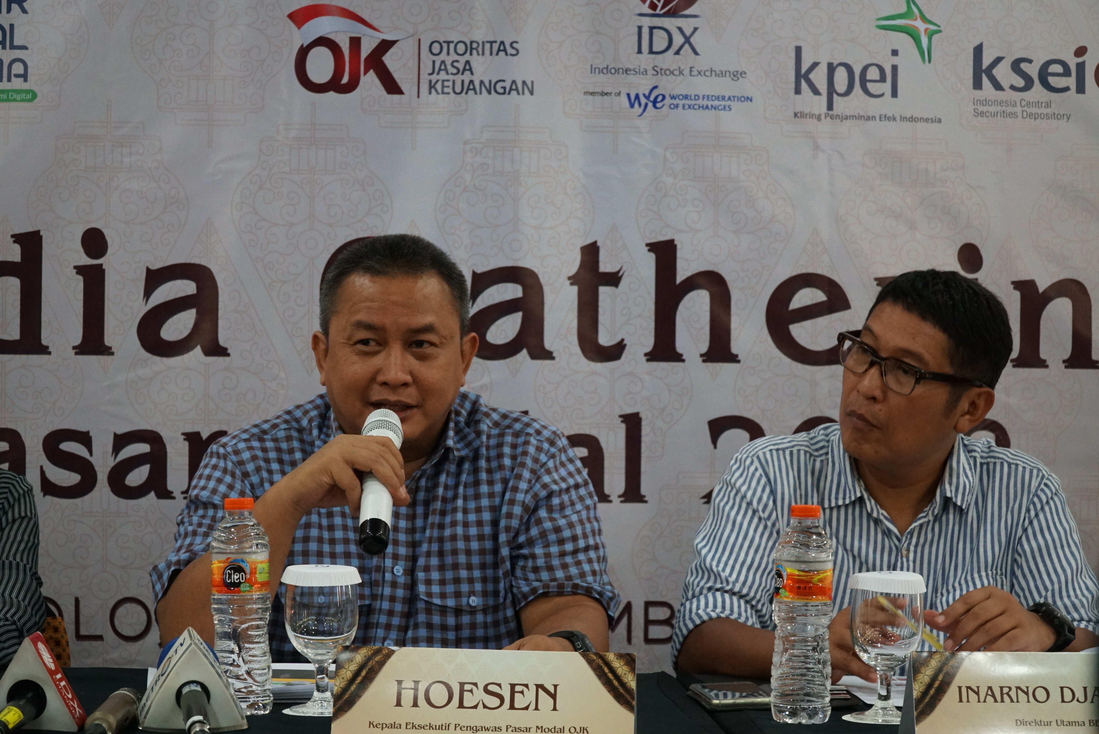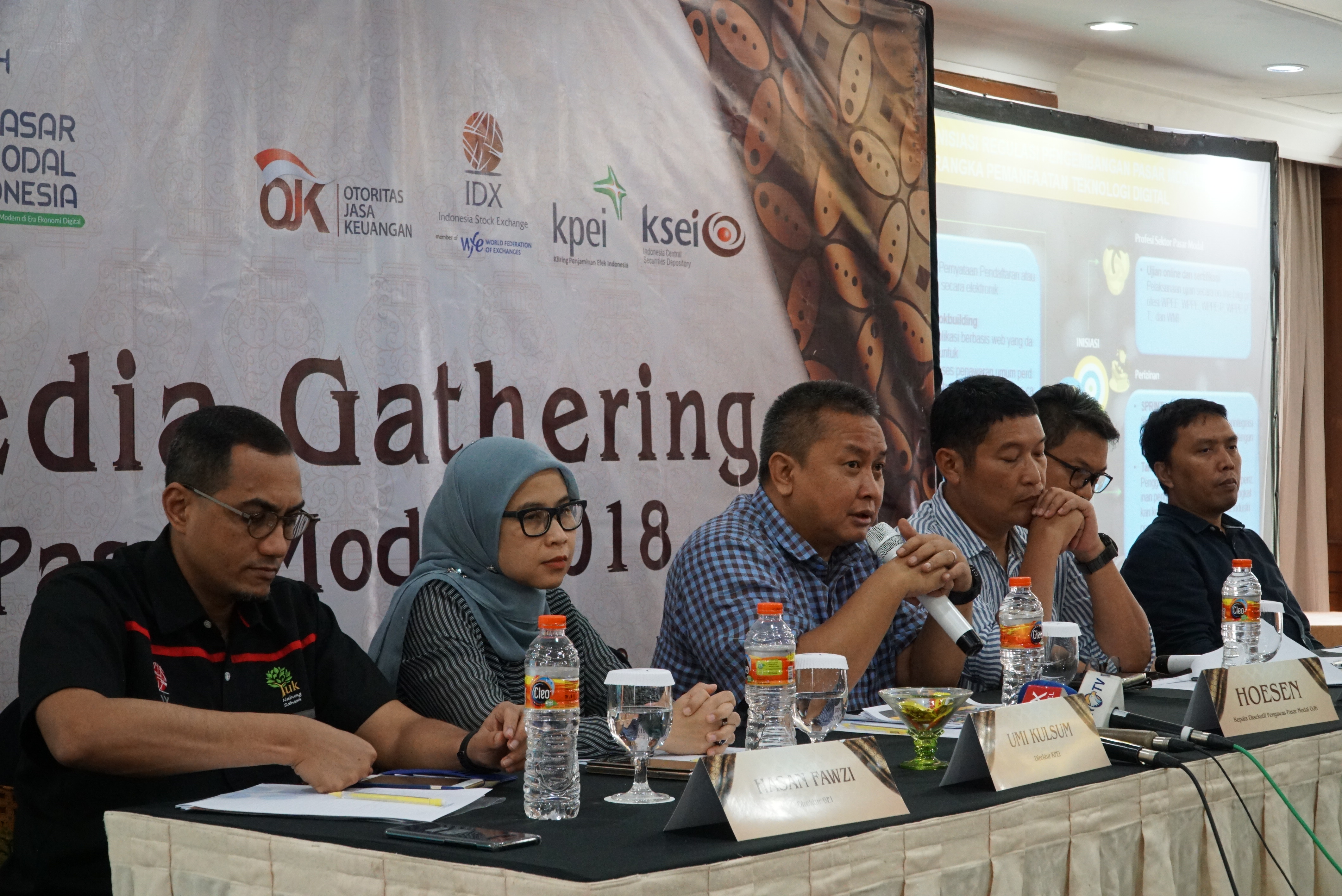 (kiri ke kanan) Direktur BEI Hasan Fauzi, Direktur KPEI Umi Kulsum, Kepala Eksekutif Pengawasan Pasar Modal OJK Hoesen, Direktur Utama BEI Inarno Djajadi, Direktur BEI Laksono Widodo, Direktur KSEI Syafruddin memberikan keterangan pers saat mensosialisasikan road to T+2 disela media gathering pasar modal 2018, Solo, Jawa Tengah, Jumat (16/11). Road T+2 merupakan sosialisasi bursa efek Indonesia dalam percepatan penyelesaian transaksi di pasar modal dari T+3 menjadi T+2. AKTUAL/Eko S Hilman
