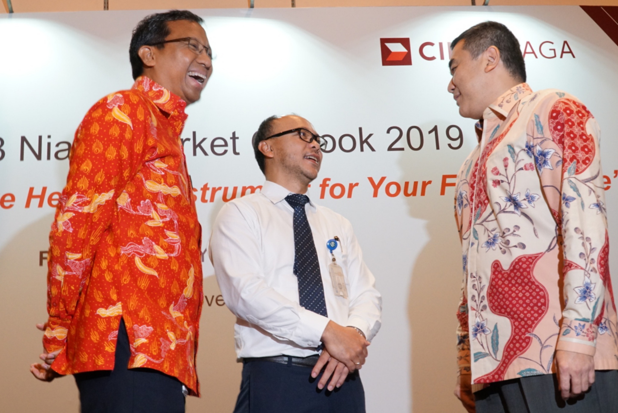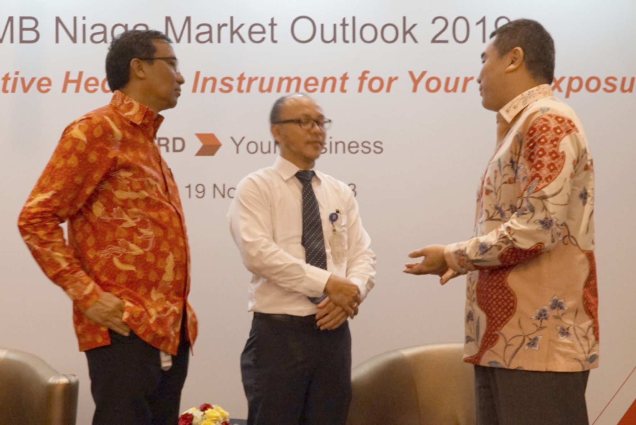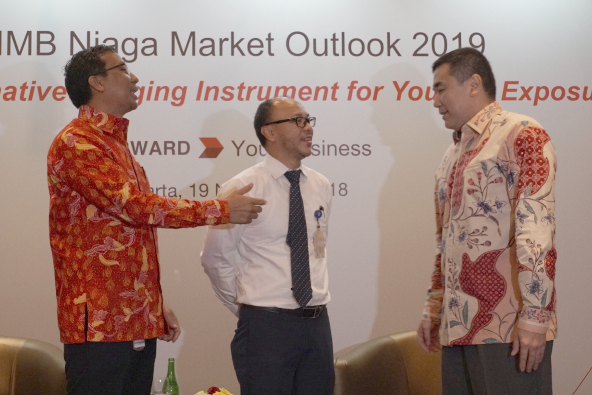 Direktur Treasury and Capital Market CIMB Niaga John Simon (kanan) berbincang dengan Asisten Direktur Center of Transformation Program Financial Market Deepening Program Bank Indonesia Indra Gunawan Sutarto (tengah), dan Chief Economist CIMB Niaga Adrian Panggabean (kiri) di sela CIMB Niaga Market Outlook 2019 bertema “Domestic Non-Deliverable Forward (DNDF): Alternative Hedging Instrument for Your Foreign Exchange Exposure” di Jakarta, Senin (19/11/2018). Acara tersebut menjadi kesempatan sosialisasi produk lindung nilai atau hedging DNDF kepada para nasabah dan mitra bisnis perseroan yang memiliki eksposur terhadap risiko nilai tukar rupiah. Hal ini sekaligus wujud dukungan CIMB Niaga kepada Bank Indonesia untuk meningkatkan stabilitas nilai tukar rupiah. AKTUAL/Eko S Hilman