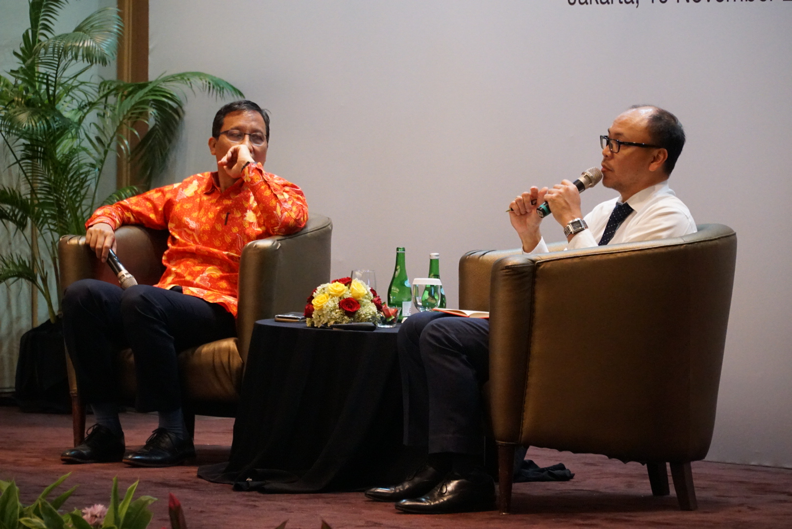Asisten Direktur Center of Transformation Program Financial Market Deepening Program Bank Indonesia Indra Gunawan Sutarto (kanan) dan Chief Economist CIMB Niaga Adrian Panggabean (kanan) di sela CIMB Niaga Market Outlook 2019 bertema “Domestic Non-Deliverable Forward (DNDF): Alternative Hedging Instrument for Your Foreign Exchange Exposure” di Jakarta, Senin (19/11/2018). Acara tersebut menjadi kesempatan sosialisasi produk lindung nilai atau hedging DNDF kepada para nasabah dan mitra bisnis perseroan yang memiliki eksposur terhadap risiko nilai tukar rupiah. Hal ini sekaligus wujud dukungan CIMB Niaga kepada Bank Indonesia untuk meningkatkan stabilitas nilai tukar rupiah. AKTUAL/Eko S Hilman
