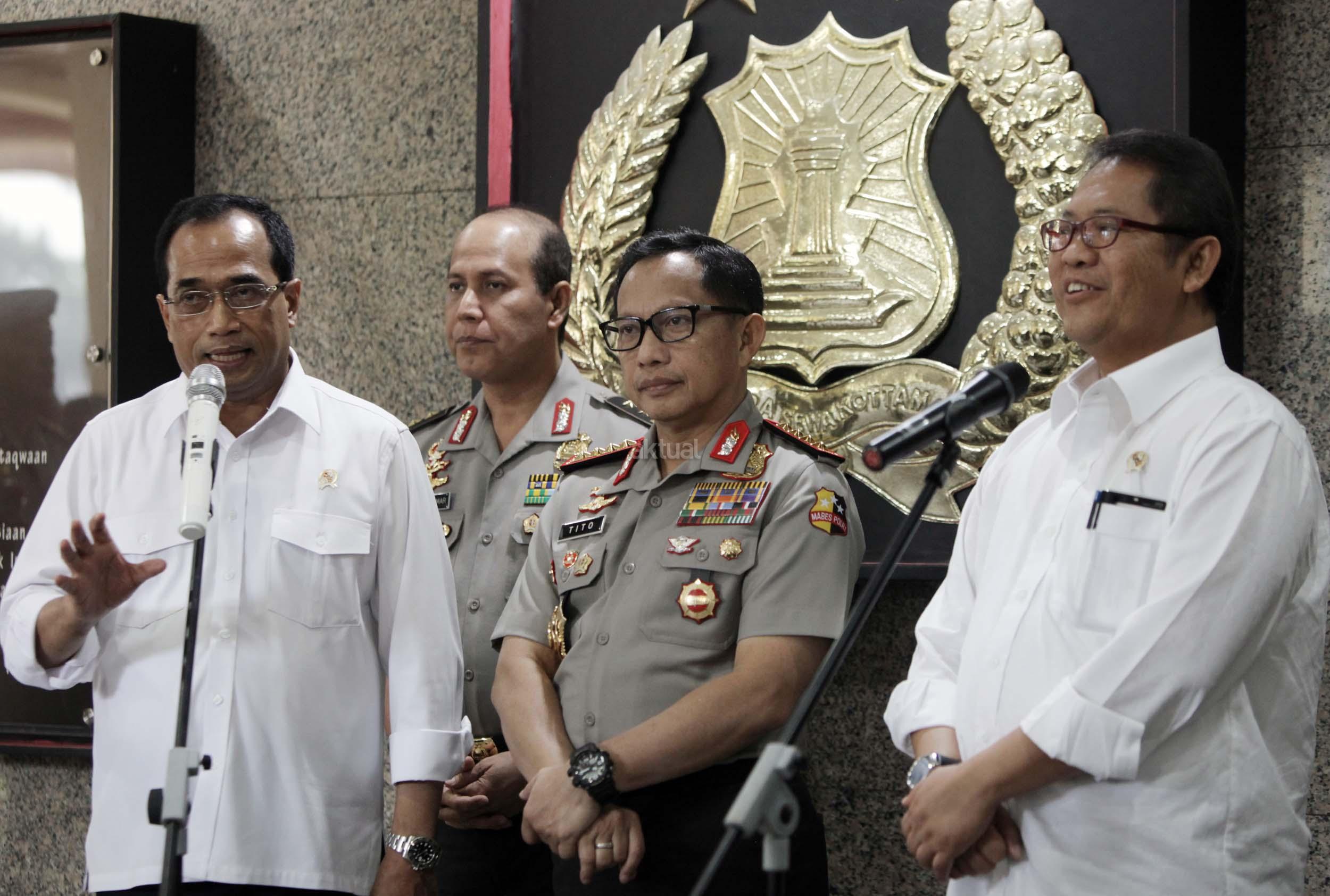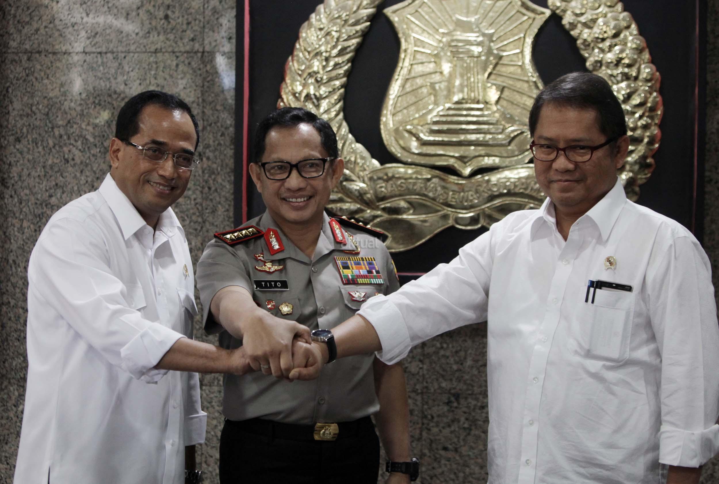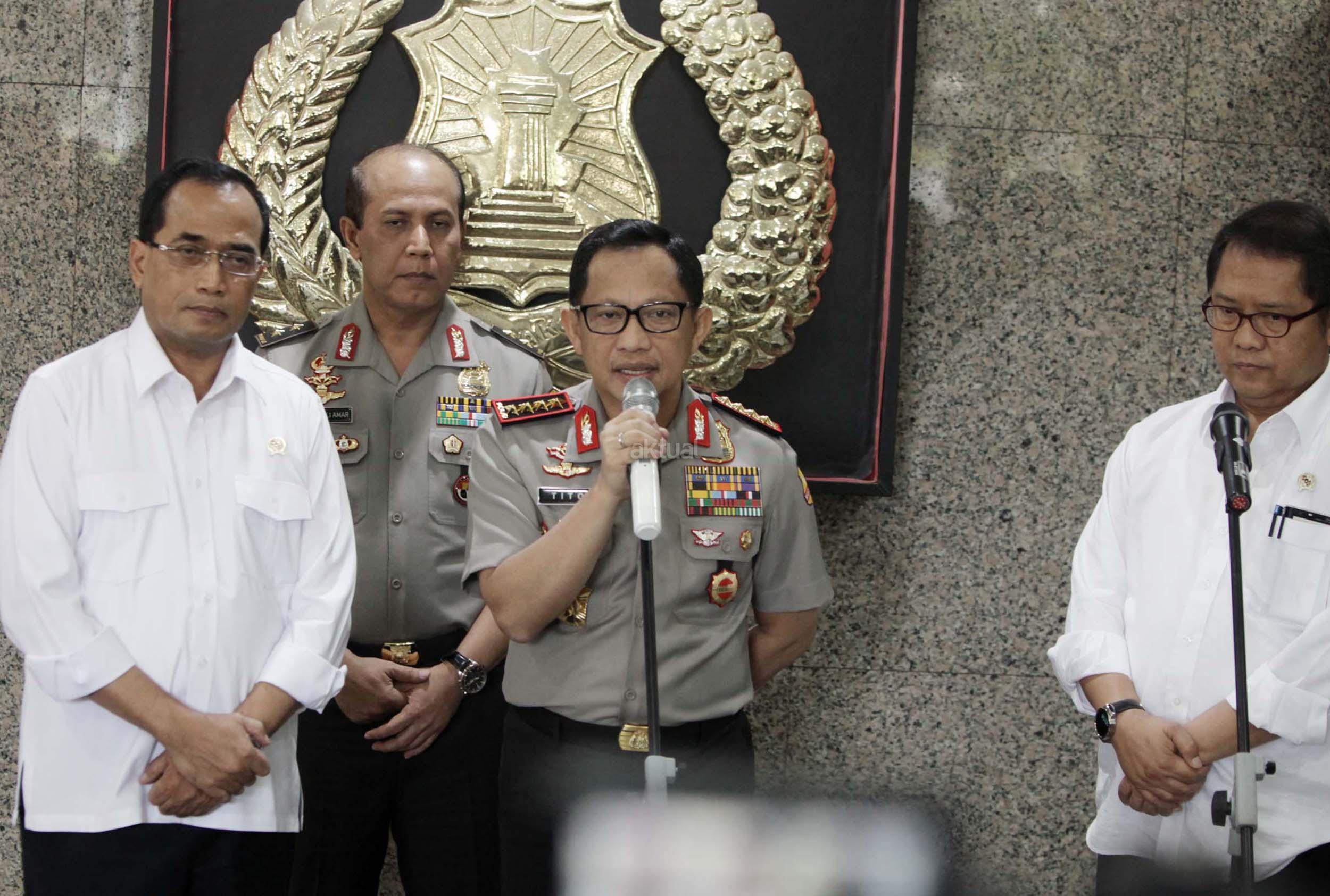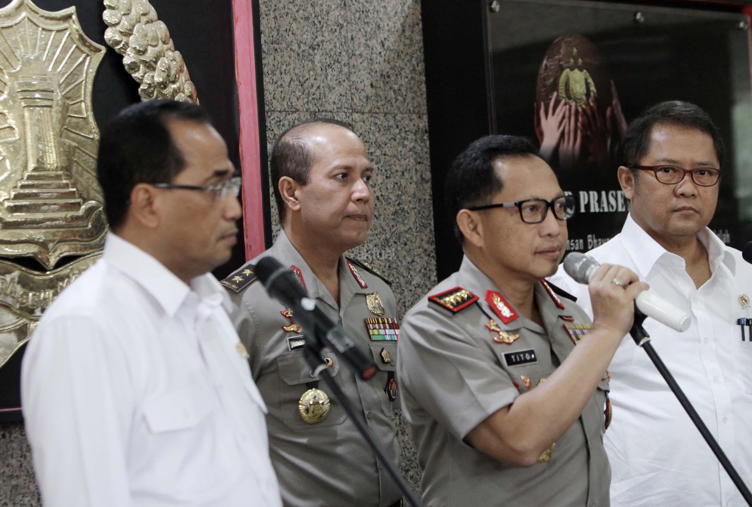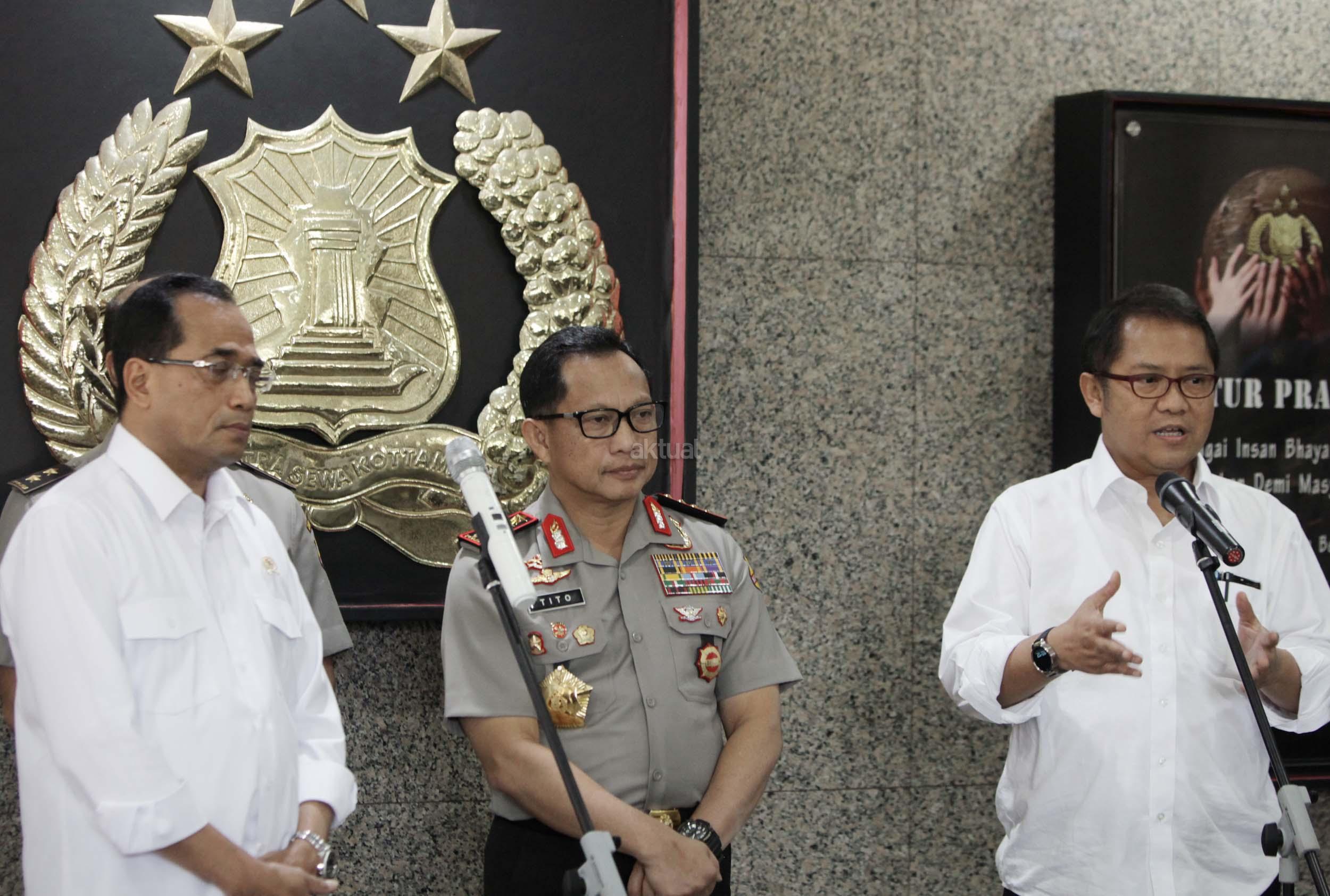 Menteri Perhubungan Budi Karya Sumadi (kedua kiri), Kapolri Jenderal Pol Tito Karnavian (tengah) dan Menteri Komunikasi dan Informatika Rudiantara (kanan) memberikan keterangan kepada wartawan usai menggelar rapat membahas penyelesaian sistem aturan transportasi online dan konvensional di Mabes Polri, Jakarta, Selasa (21/3/2017). Dalam jumpa persnya Kapolri bersama Menteri Perhubungan dan Menkominfo melakukan sosialisasi dengan Pemerintah Daerah melalui video confrence terkait pemberlakuan revisi Peraturan Menteri Perhubungan (Permenhub) No.32 Tahun 2016 tentang penyelenggaraan angkutan orang dengan kendaraan bermotor umum tidak dalam trayek, yang akan dimulai pada 1 April 2017 mendatang. AKTUAL/Munzir