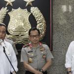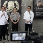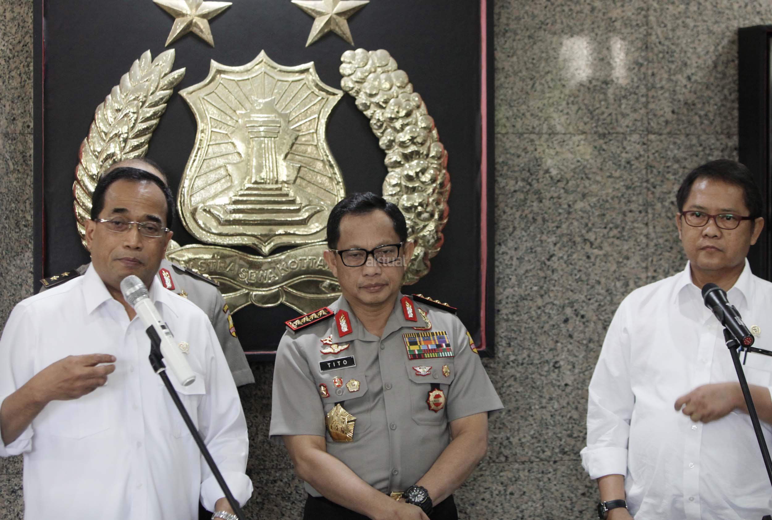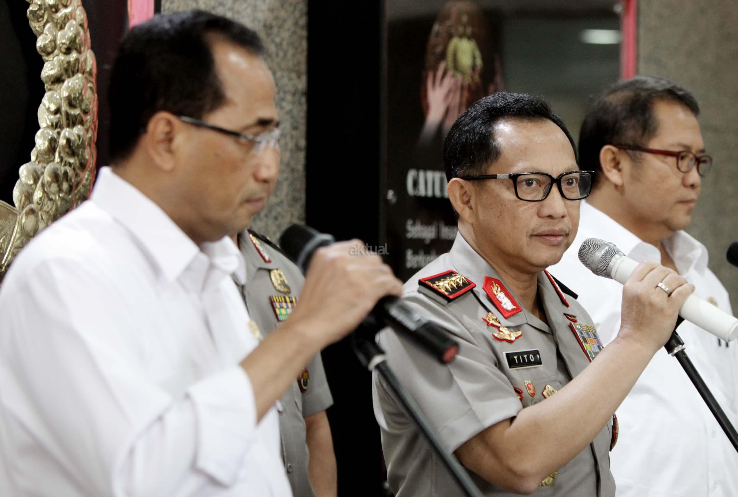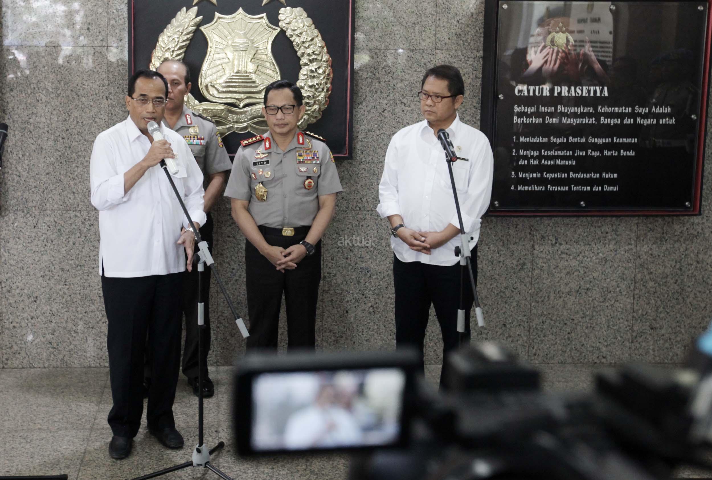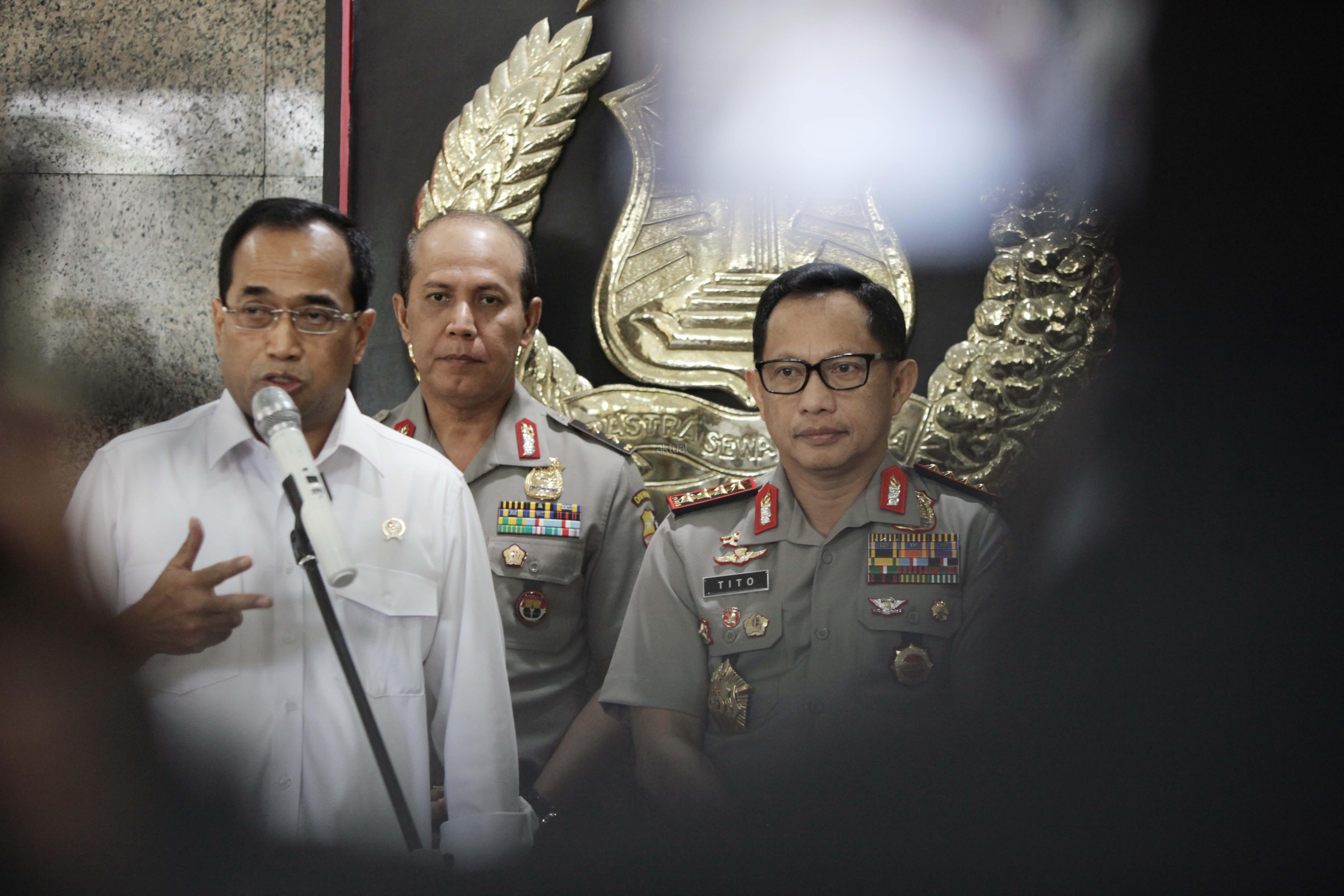Menteri Perhubungan Budi Karya Sumadi (kedua kiri), Kapolri Jenderal Pol Tito Karnavian (tengah) dan Menteri Komunikasi dan Informatika Rudiantara (kanan) memberikan keterangan kepada wartawan usai menggelar rapat membahas penyelesaian sistem aturan transportasi online dan konvensional di Mabes Polri, Jakarta, Selasa (21/3/2017). Dalam jumpa persnya Kapolri bersama Menteri Perhubungan dan Menkominfo melakukan sosialisasi dengan Pemerintah Daerah melalui video confrence terkait pemberlakuan revisi Peraturan Menteri Perhubungan (Permenhub) No.32 Tahun 2016 tentang penyelenggaraan angkutan orang dengan kendaraan bermotor umum tidak dalam trayek, yang akan dimulai pada 1 April 2017 mendatang. AKTUAL/Munzir