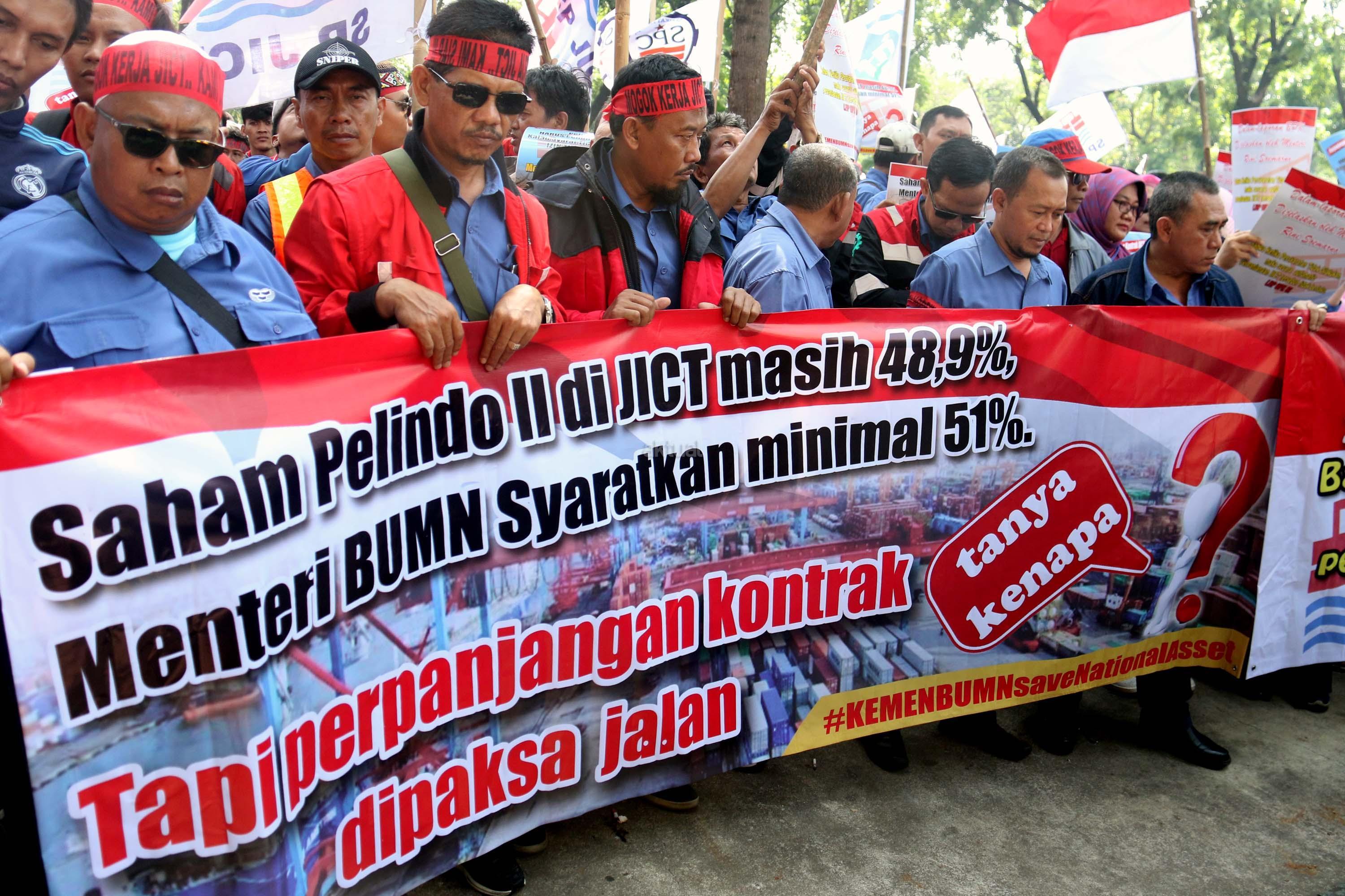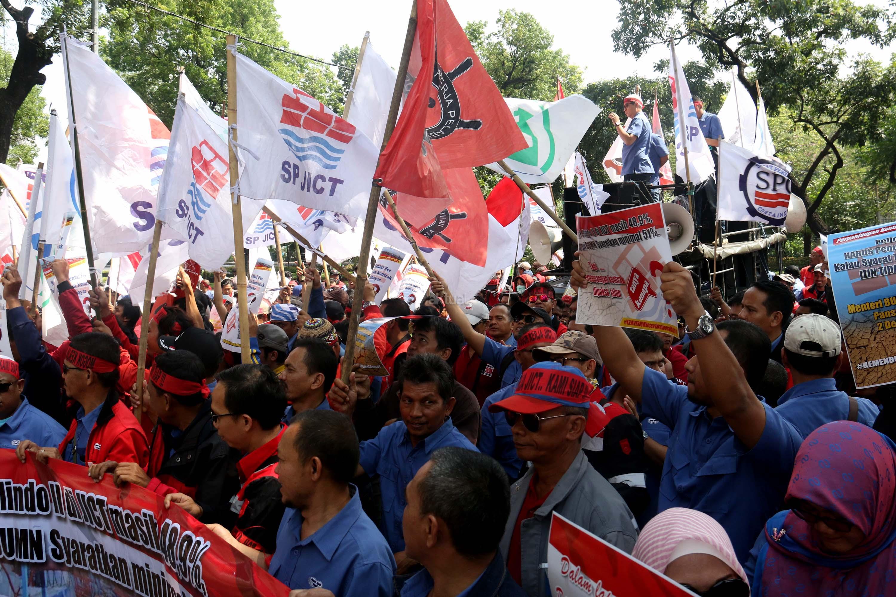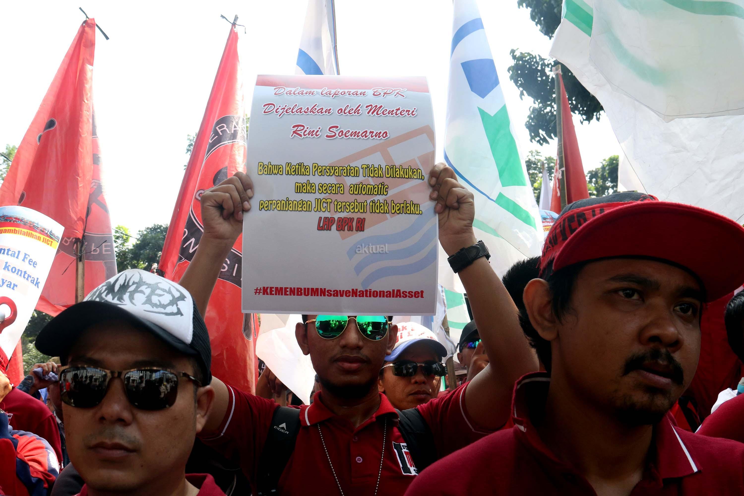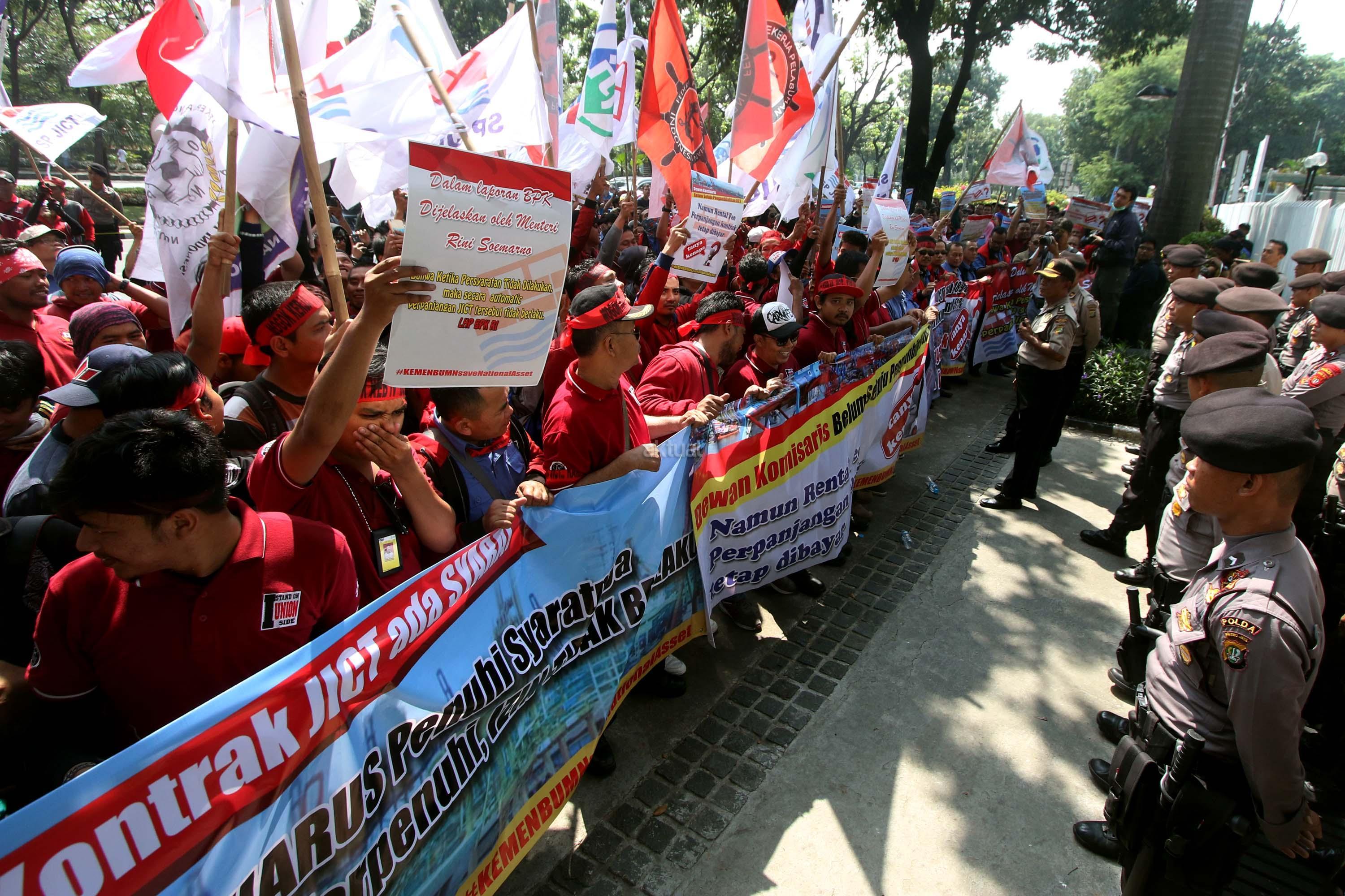 Ratusan anggota Serikat Pekerja (SP) JICT melakukan aksi unjuk rasa di depan kantor Kementrian BUMN, Jakarta, Senin (31/7/2017). Dalam aksinya mendesak Meneg BUMN Rini Soemarno tindak lanjut terhadap Hasil Audit Investigatif BPK Perpanjangan Kontrak JICT dan Kementeian BUMN terhadap Hasil Audit Investigatif BPK Perpanjangan Kontrak JICT. AKTUAL/Munzir