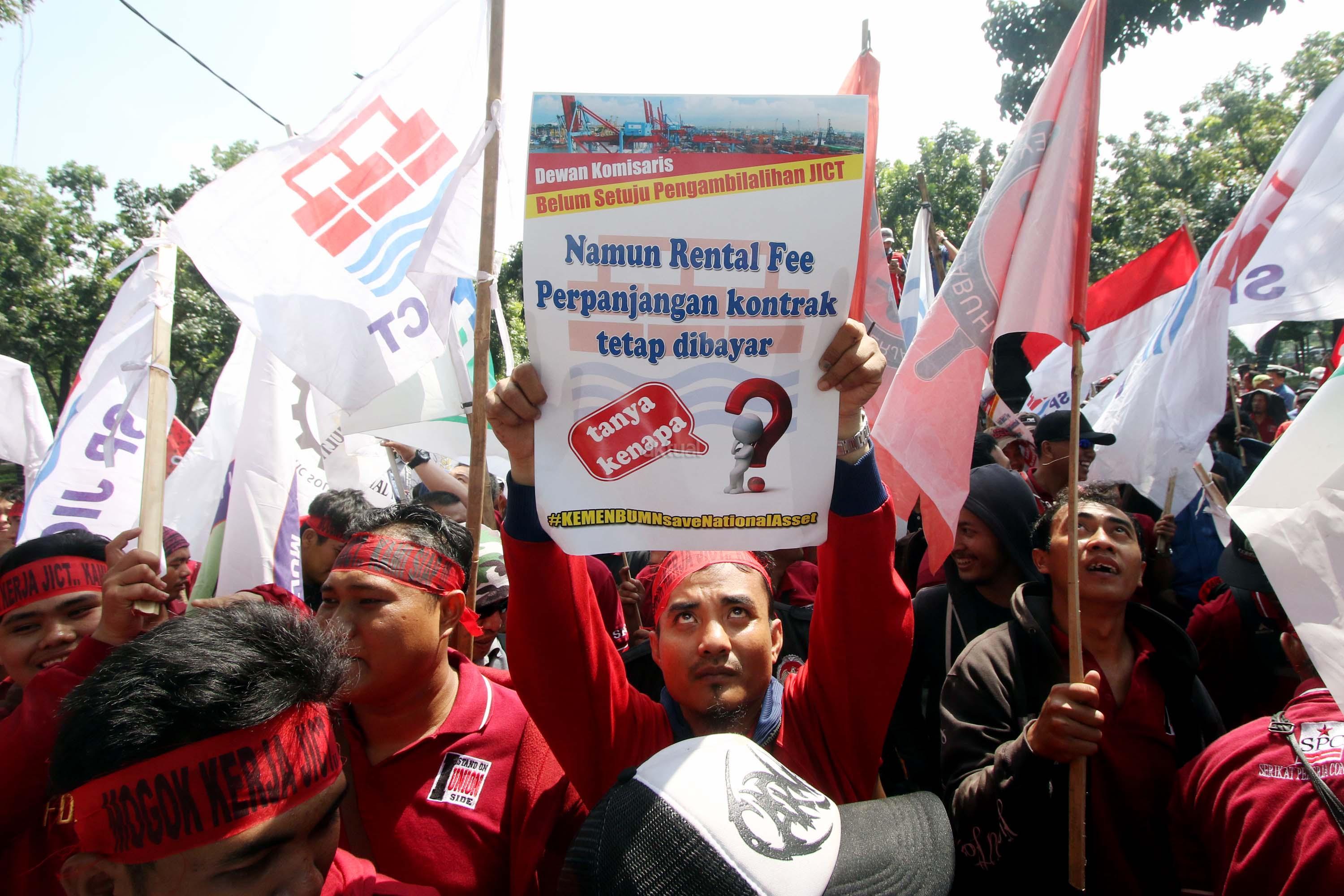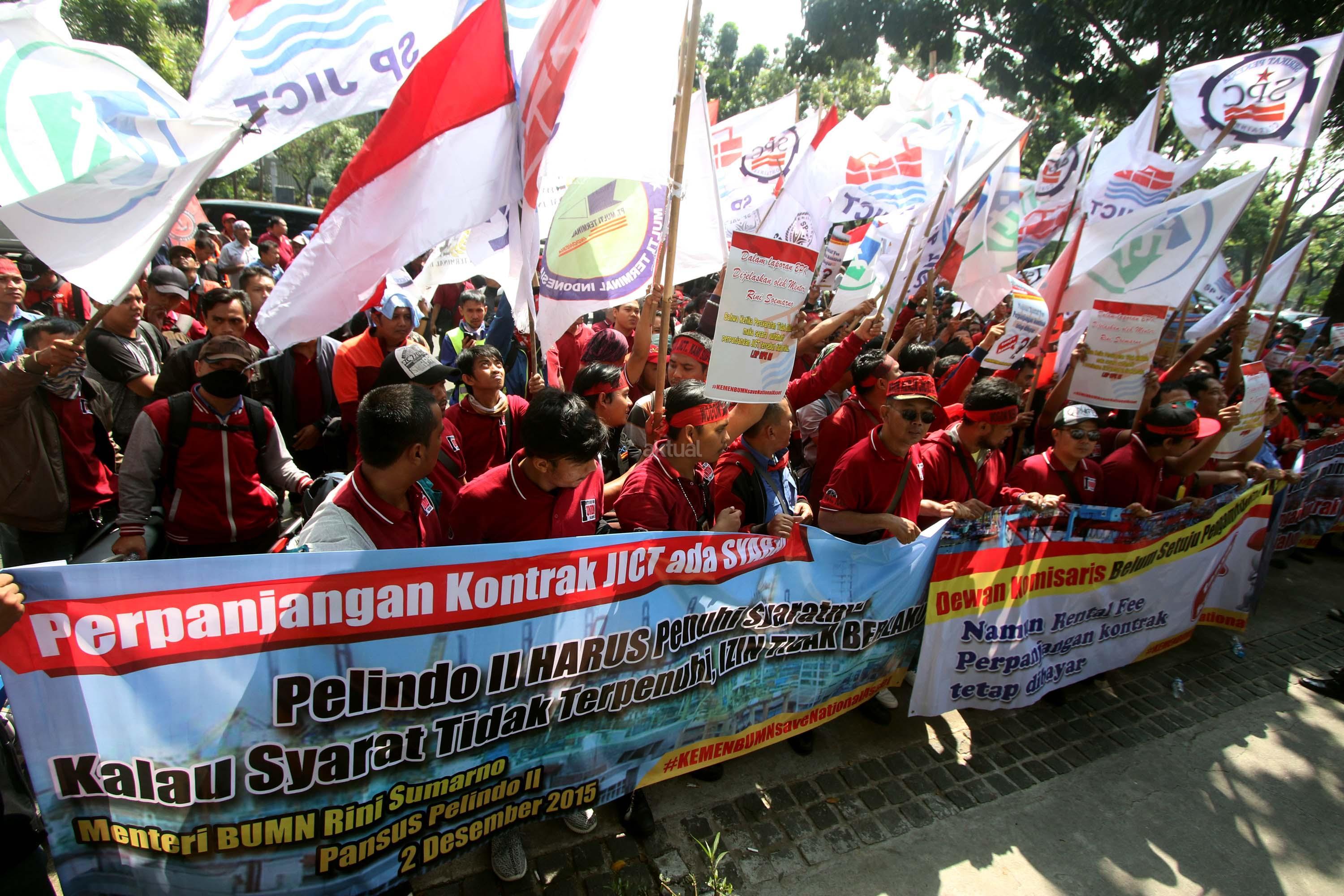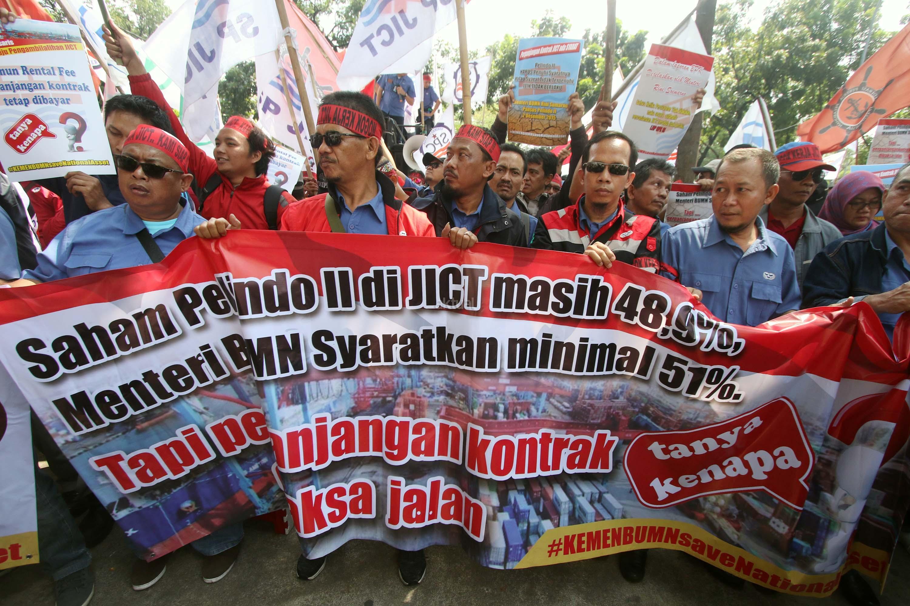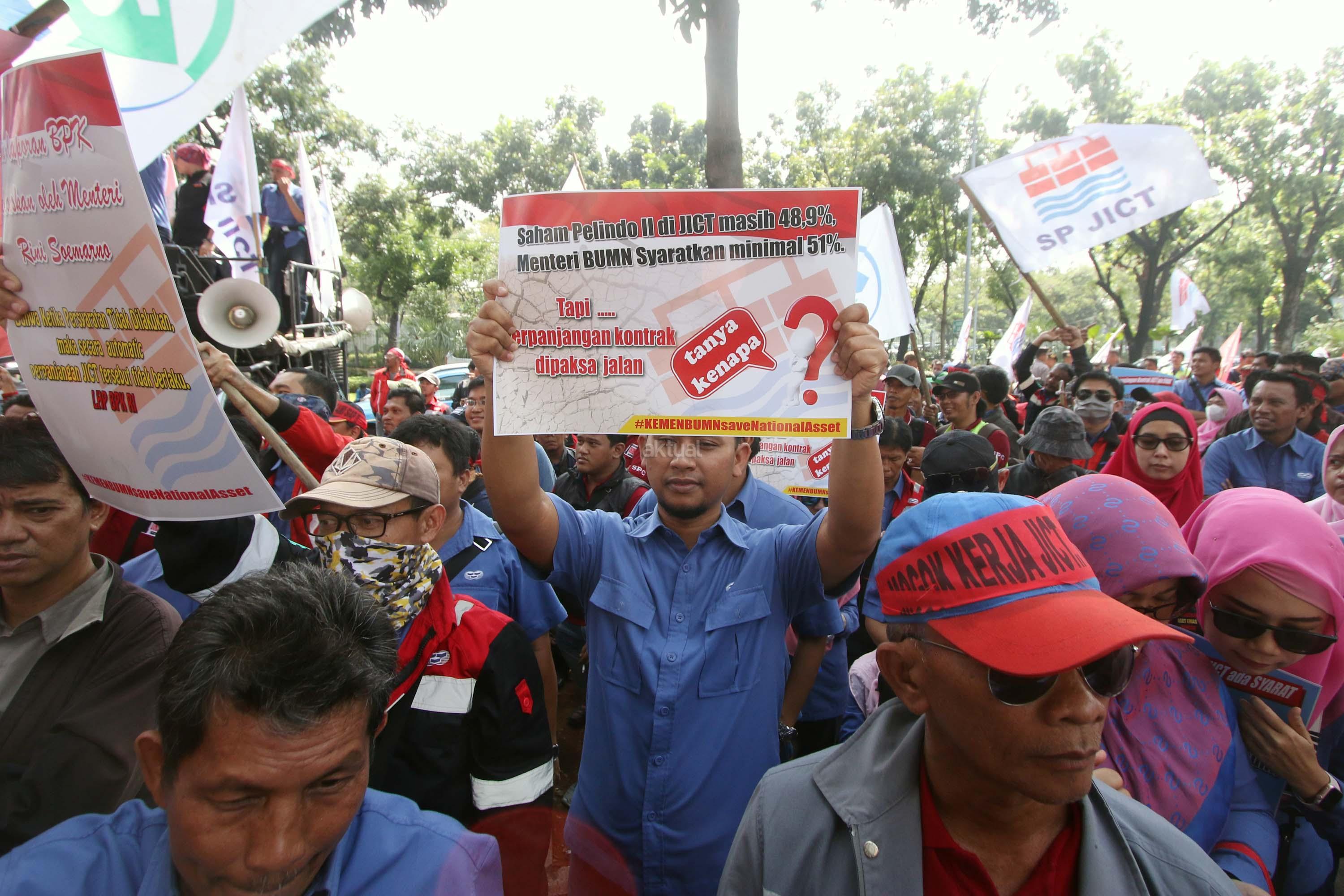 Ratusan anggota Serikat Pekerja (SP) JICT melakukan aksi unjuk rasa di depan kantor Kementrian BUMN, Jakarta, Senin (31/7/2017). Dalam aksinya mendesak Meneg BUMN Rini Soemarno tindak lanjut terhadap Hasil Audit Investigatif BPK Perpanjangan Kontrak JICT dan Kementeian BUMN terhadap Hasil Audit Investigatif BPK Perpanjangan Kontrak JICT. AKTUAL/Munzir