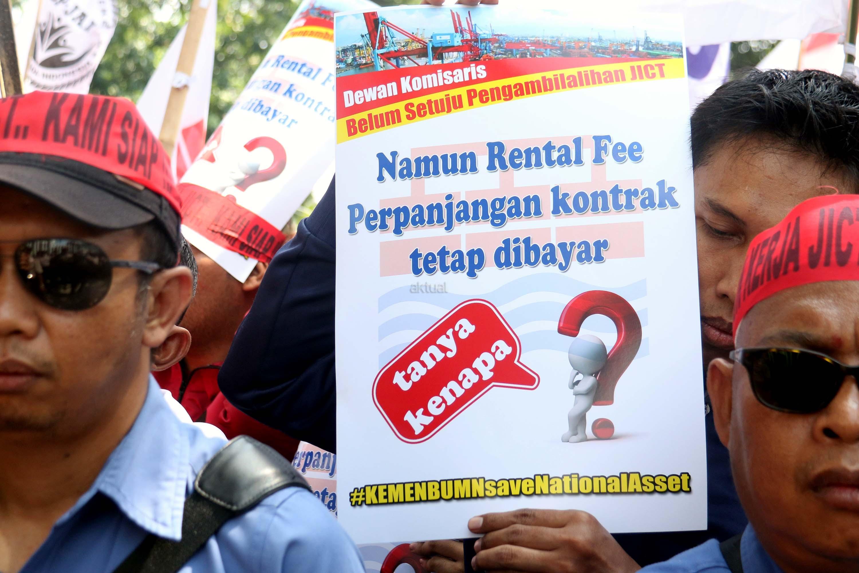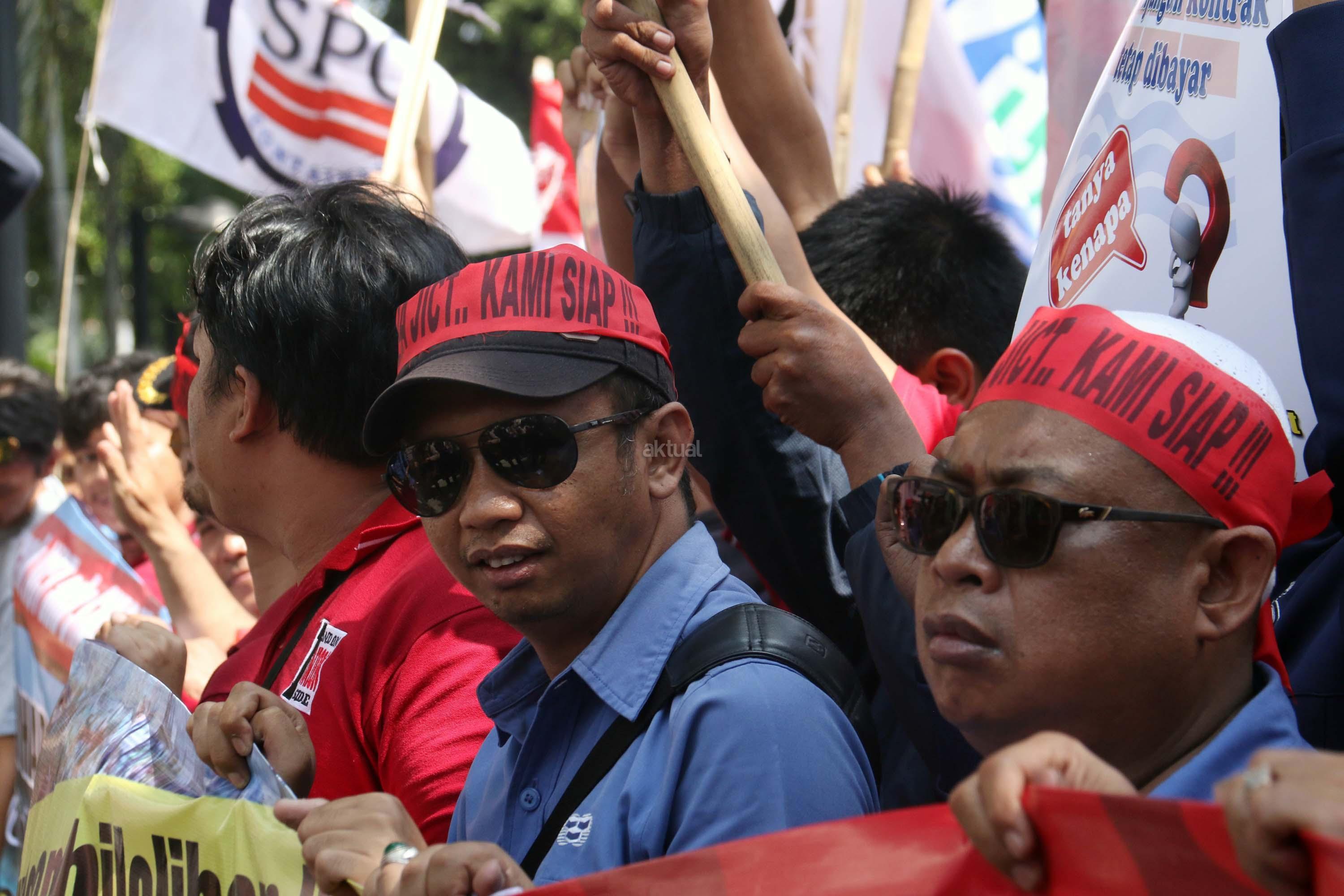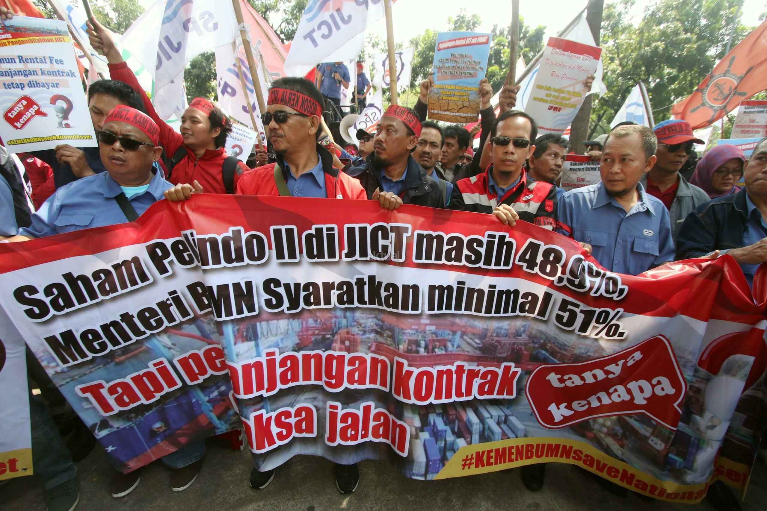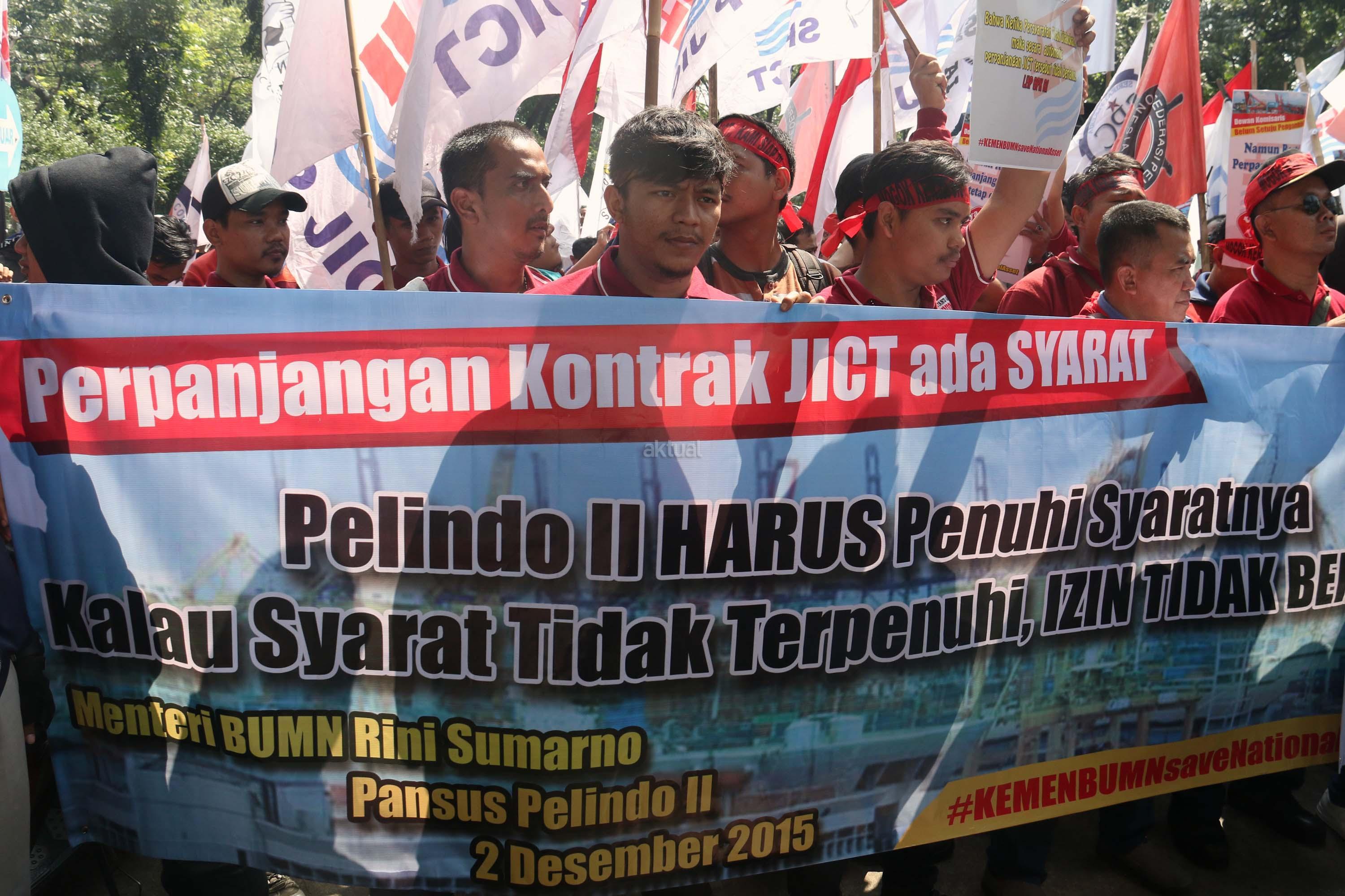 Ratusan anggota Serikat Pekerja (SP) JICT melakukan aksi unjuk rasa di depan kantor Kementrian BUMN, Jakarta, Senin (31/7/2017). Dalam aksinya mendesak Meneg BUMN Rini Soemarno tindak lanjut terhadap Hasil Audit Investigatif BPK Perpanjangan Kontrak JICT dan Kementeian BUMN terhadap Hasil Audit Investigatif BPK Perpanjangan Kontrak JICT. AKTUAL/Munzir