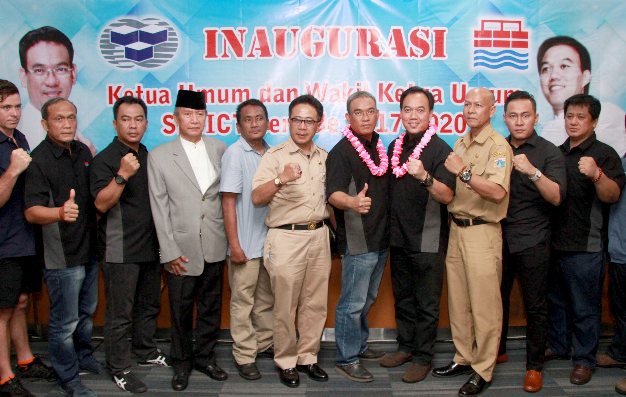 Ketua Umum Serikat Pekerja Jakarta International Container Terminal (SPJICT) 2016-2020 Hazris Malsyah, Wakil Ketua Bayu Saptari foto bersama usai acara inaugurasi di Kantor JIT, Jakarta, Senin (18/12/2017). Ketua terpilih Hazris berkomitmen untuk melanjutkan agenda SPJICT dalam menyelamatkan aset nasional dan menegakkan keadilan bagi pekerja JICT serta menjadi penyeimbang kepentingan negara, pekerja dan perusahaan. AKTUAL/Tino Oktaviano