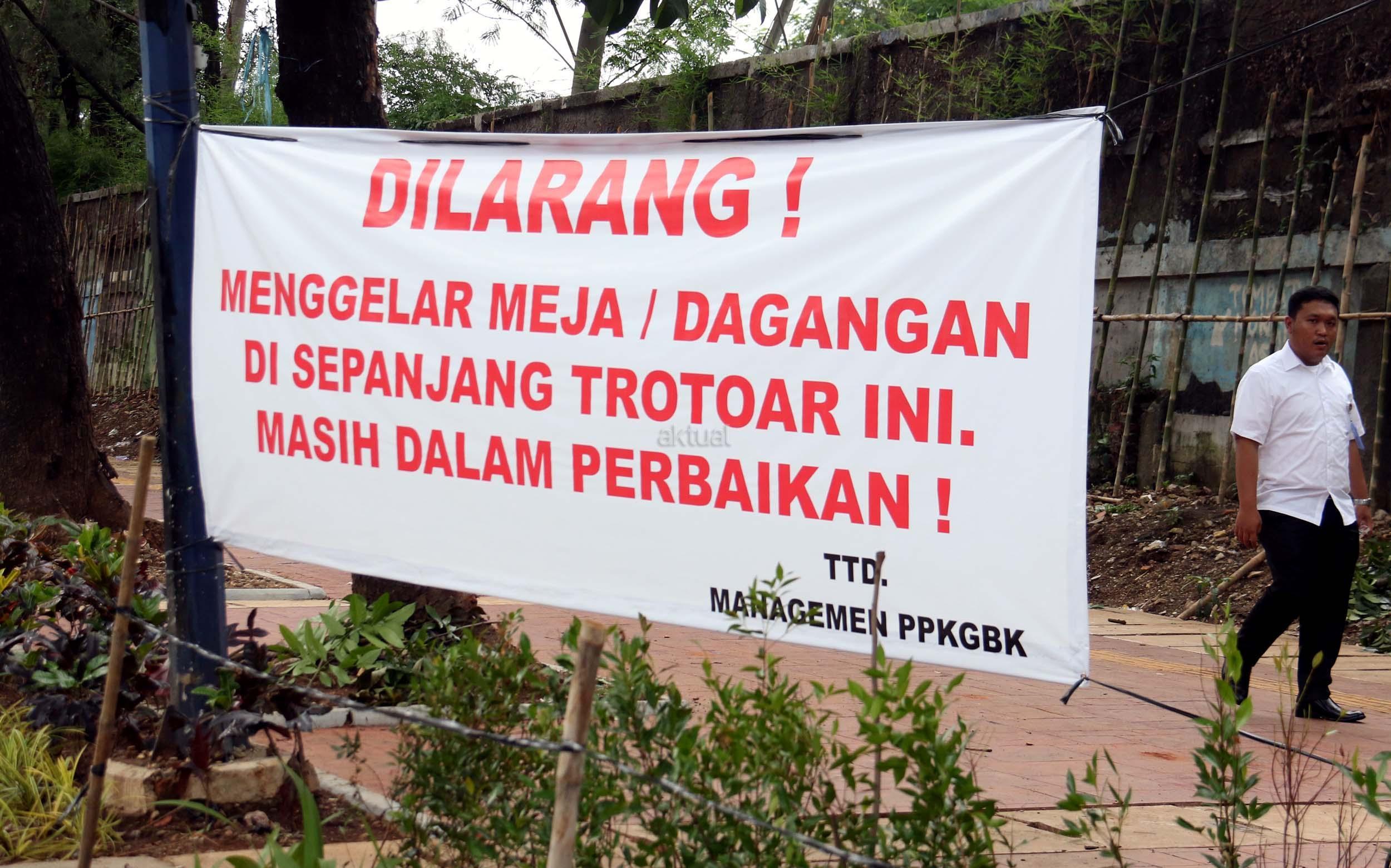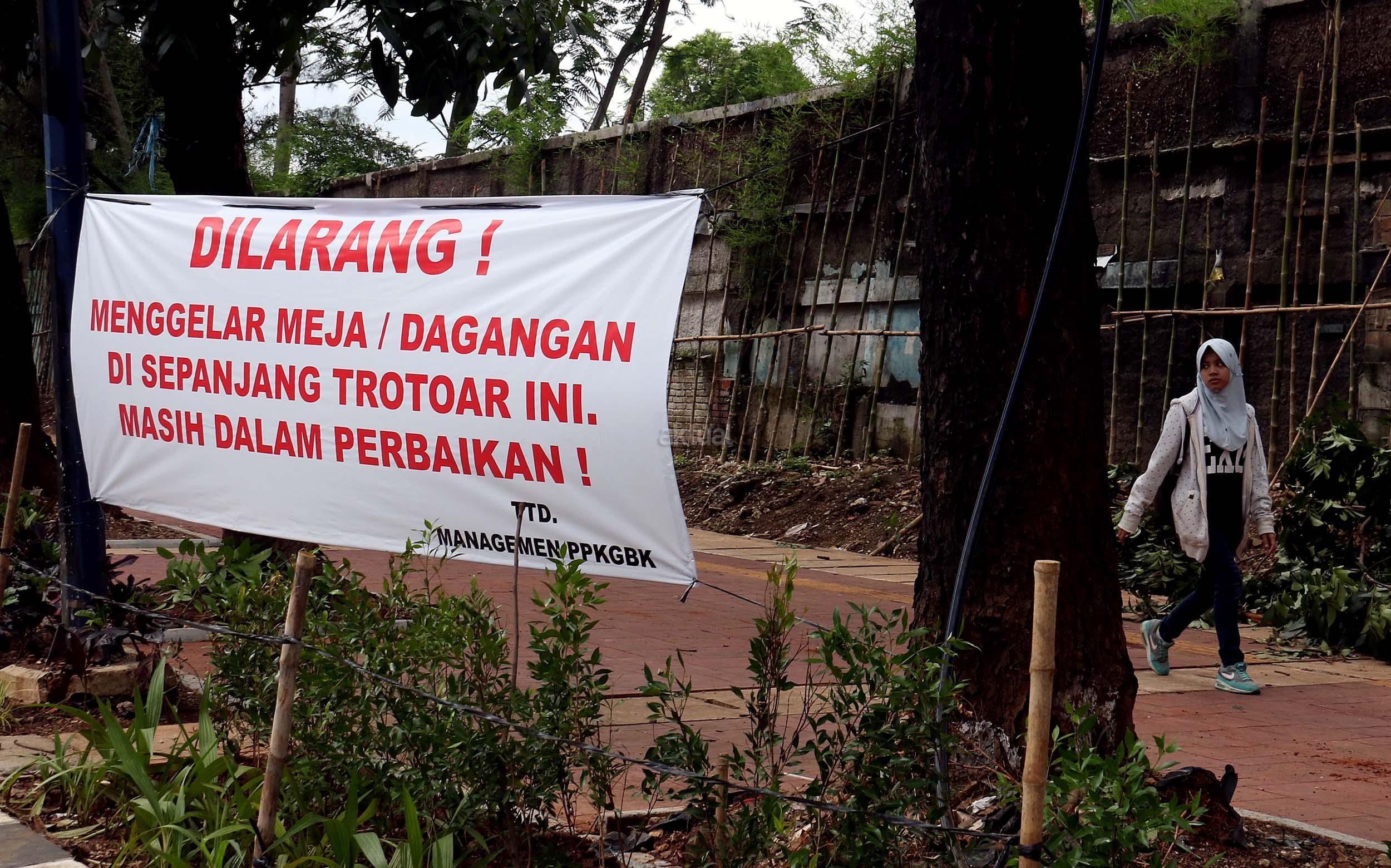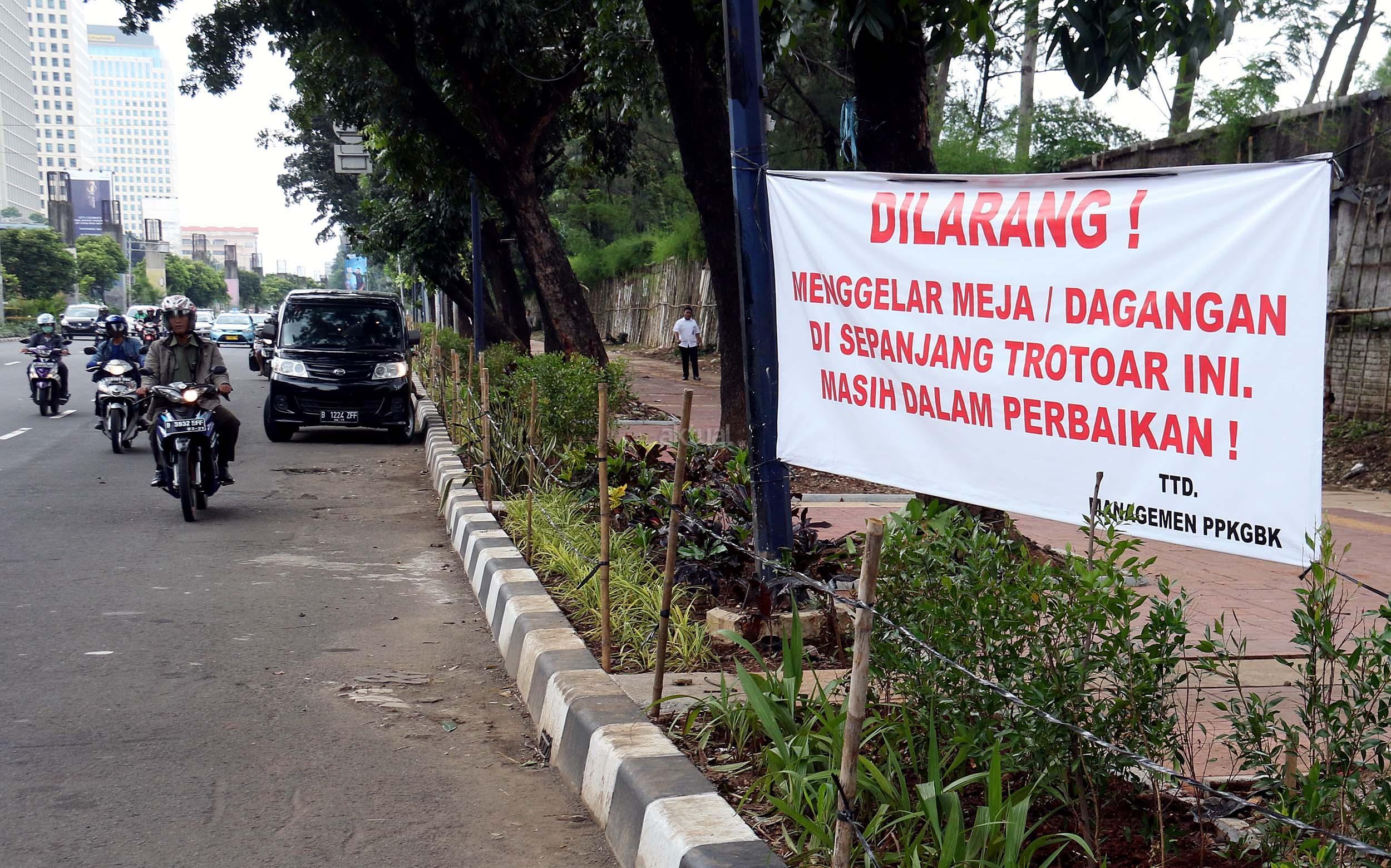 Sebuah spanduk larangan berjualan terpampang disepanjang trotoar di kawasan Senayan Jalan Asia Afrika, Jakarta Pusat, Rabu (21/12/2016). Spanduk larangan tersebut dikeluarkan oleh Pusat Pengelolaan Komplek Gelora Bung Karno (PPK-GBK). AKTUAL/Munzir