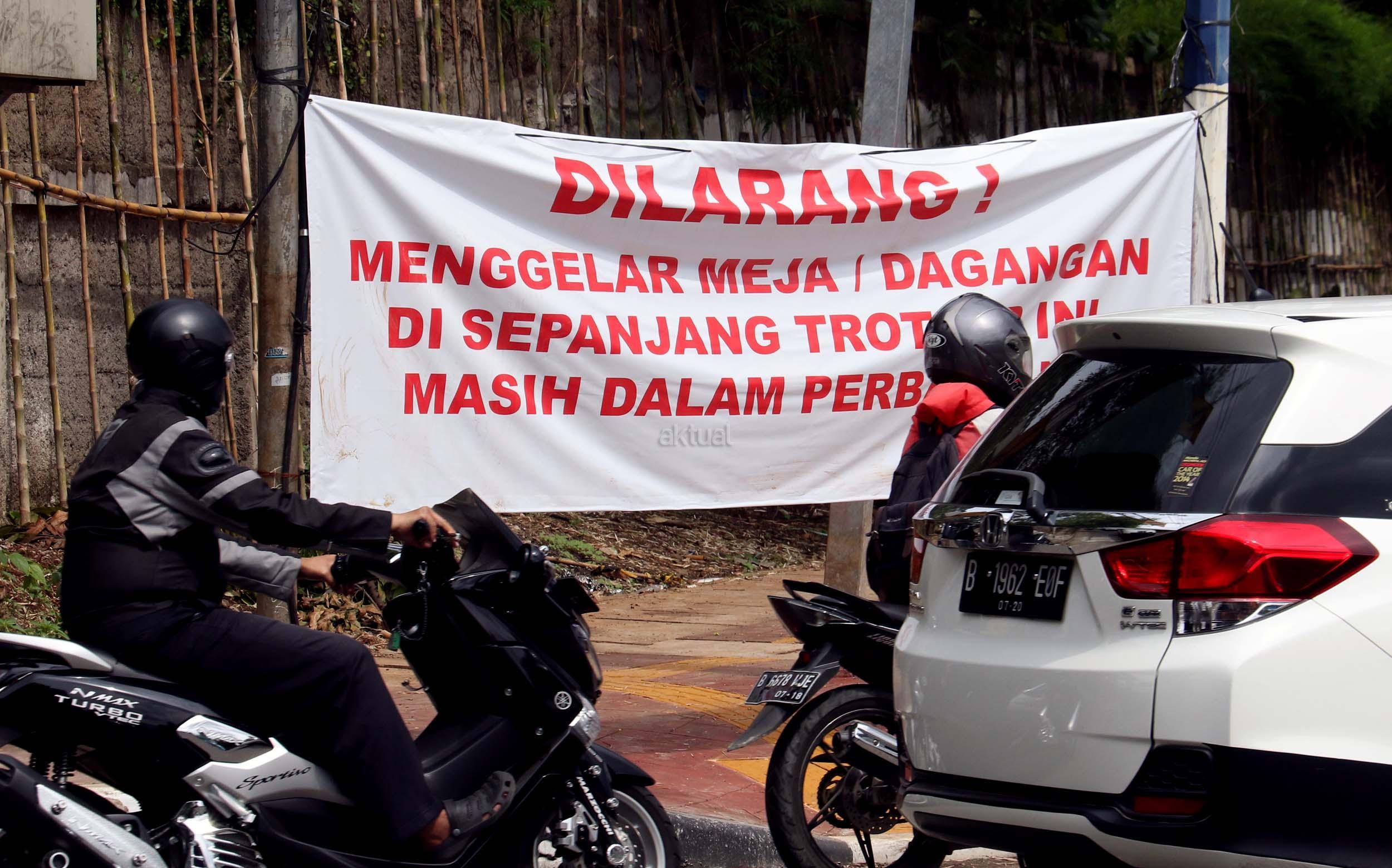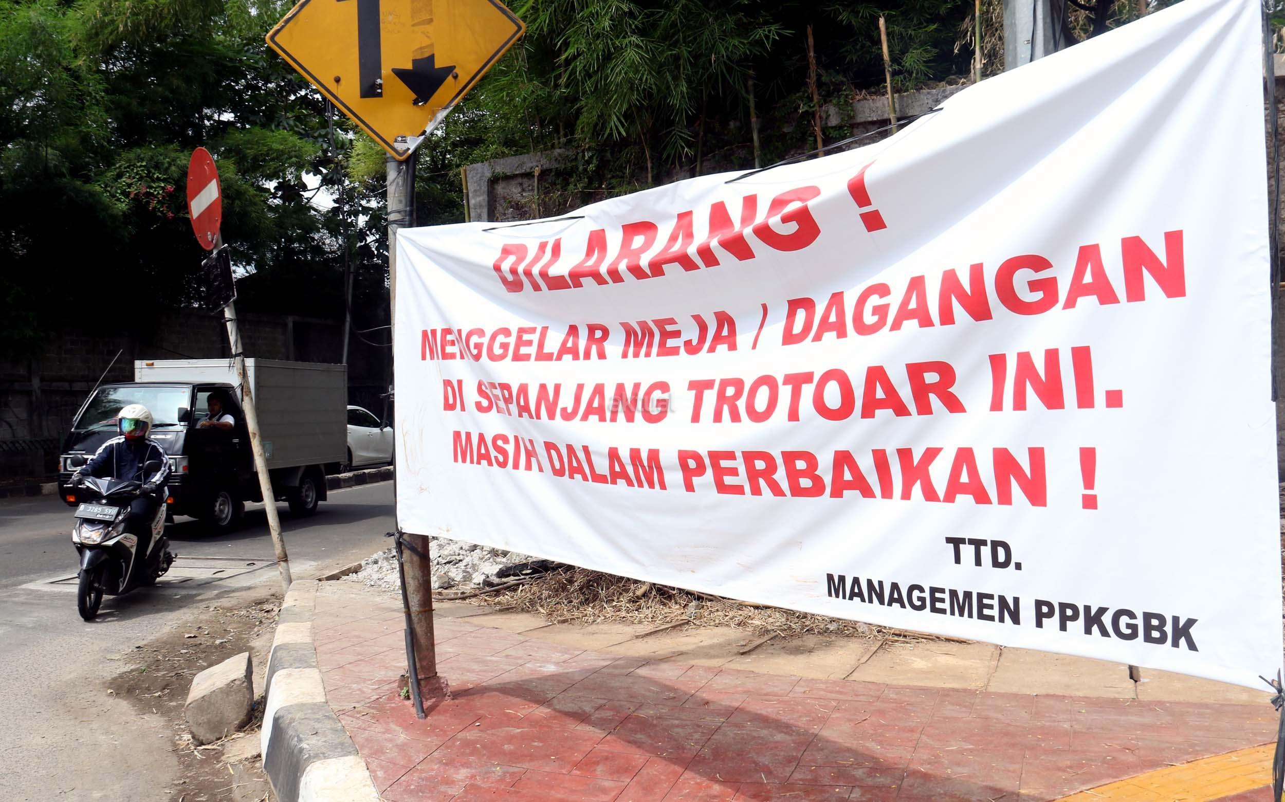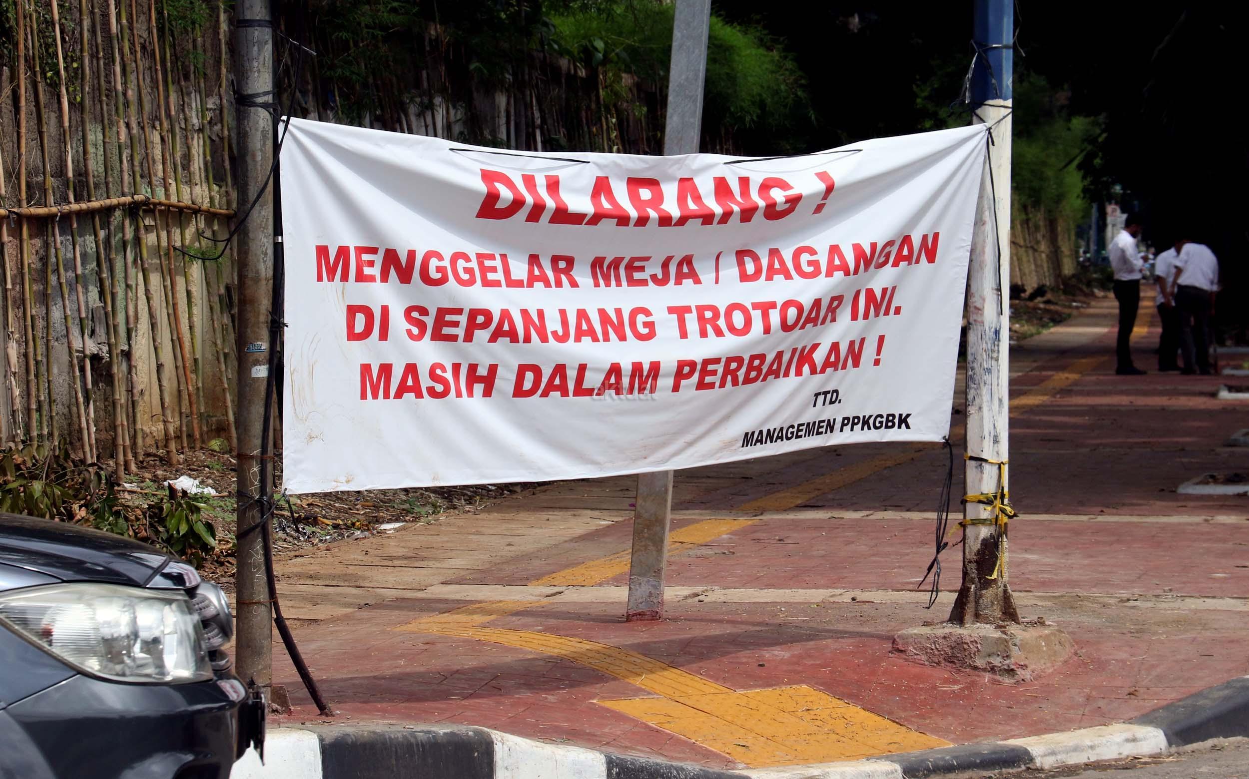Sebuah spanduk larangan berjualan terpampang disepanjang trotoar di kawasan Senayan Jalan Asia Afrika, Jakarta Pusat, Rabu (21/12/2016). Spanduk larangan tersebut dikeluarkan oleh Pusat Pengelolaan Komplek Gelora Bung Karno (PPK-GBK). AKTUAL/Munzir
