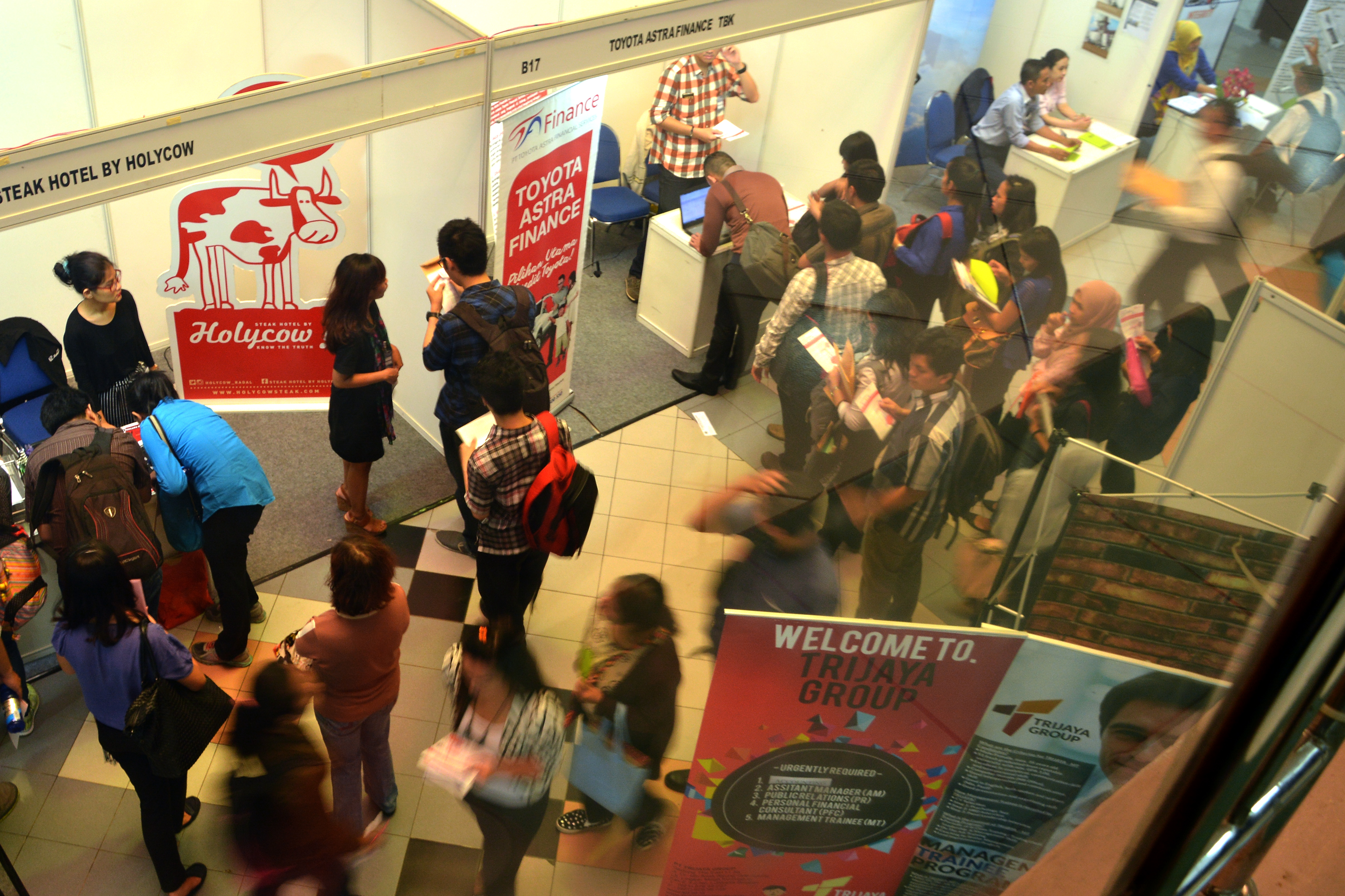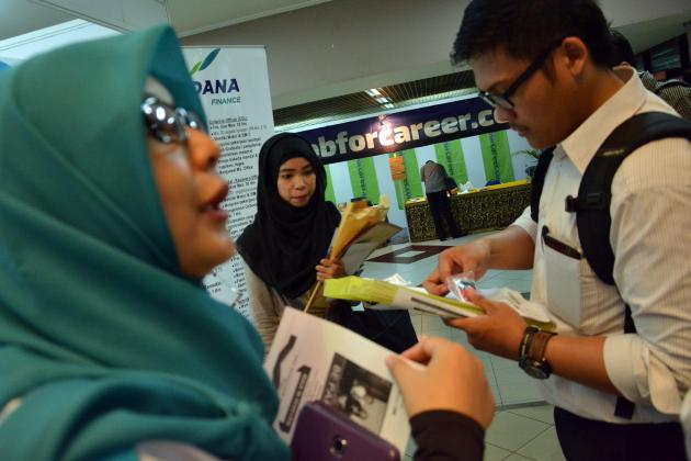 Sejumlah pencari kerja mencari informasi saat mendatangi Spectacular Job Fair 2016 di Istora Senayan, Jakarta, Selasa (10/5). Ajang pencarian kerja yang menawarkan karier di perusahaan BUMN, BUMD, Nasional dan Multinasional itu berlangsung hingga 11 Mei 2016. ANTARA FOTO/Aprillio Akbar/kye/16.