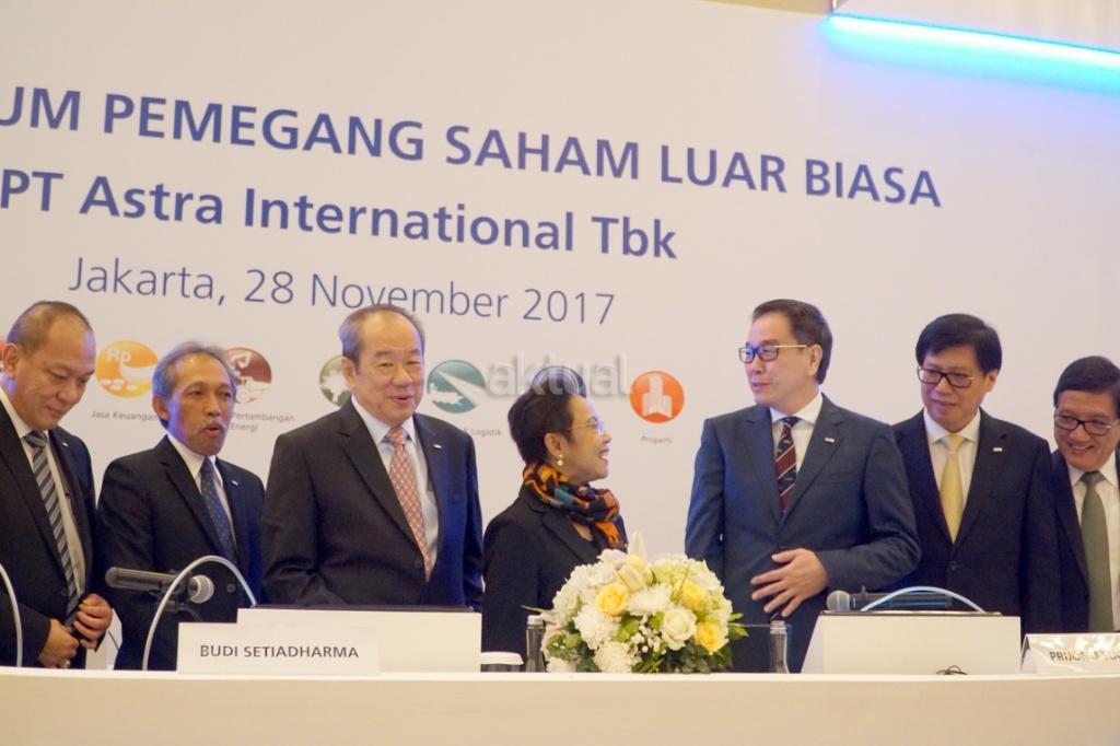 Presiden Komisaris PT Astra International Tbk Budi Setiadharma didampingi Presiden Direktur PT Astra International Tbk Prijono Sugiarto berbincang bersama Komisaris Independen PT Astra International Tbk Sri Indrastuti Hadiputranto yang baru disetujui oleh Rapat Umum Pemegang Saham Luar Biasa (RUPSLB) bersama direksi Astra International di Hotel Westin, Jakarta, Selasa (28/11). Adapun beberapa keputusan yang diambil seperti, menerimanya pengunduran diri Mari Elka Pangestu selaku komisaris Independen Perseroan dan Jonathan Chang selaku Komisaris Perseroan. Sebagai gantinya, perusahaan mengangkat Sri Indrastuti Hadiputranto selaku Komisaris Independen Perseroan. AKTUAL/Humas Astra