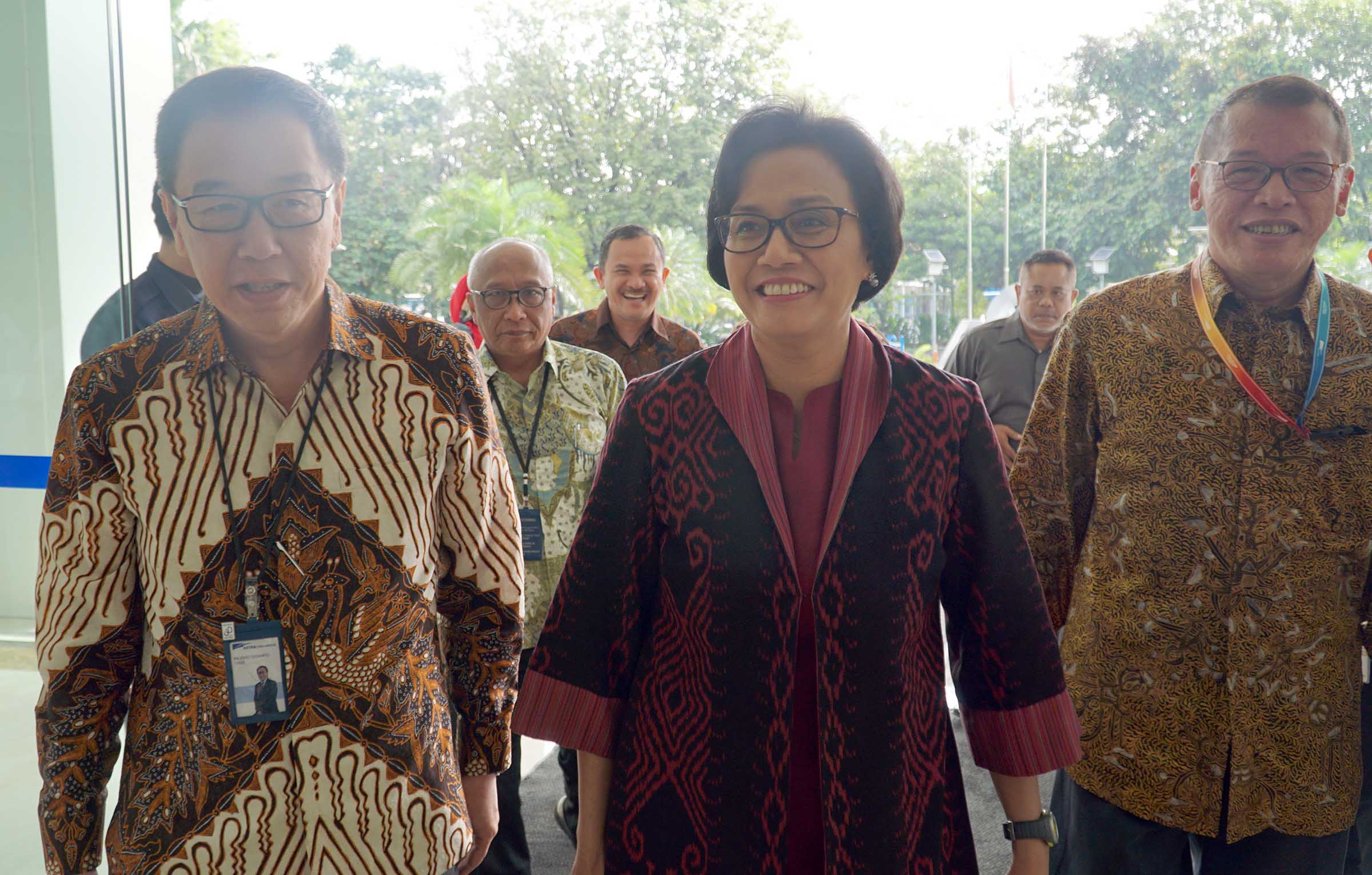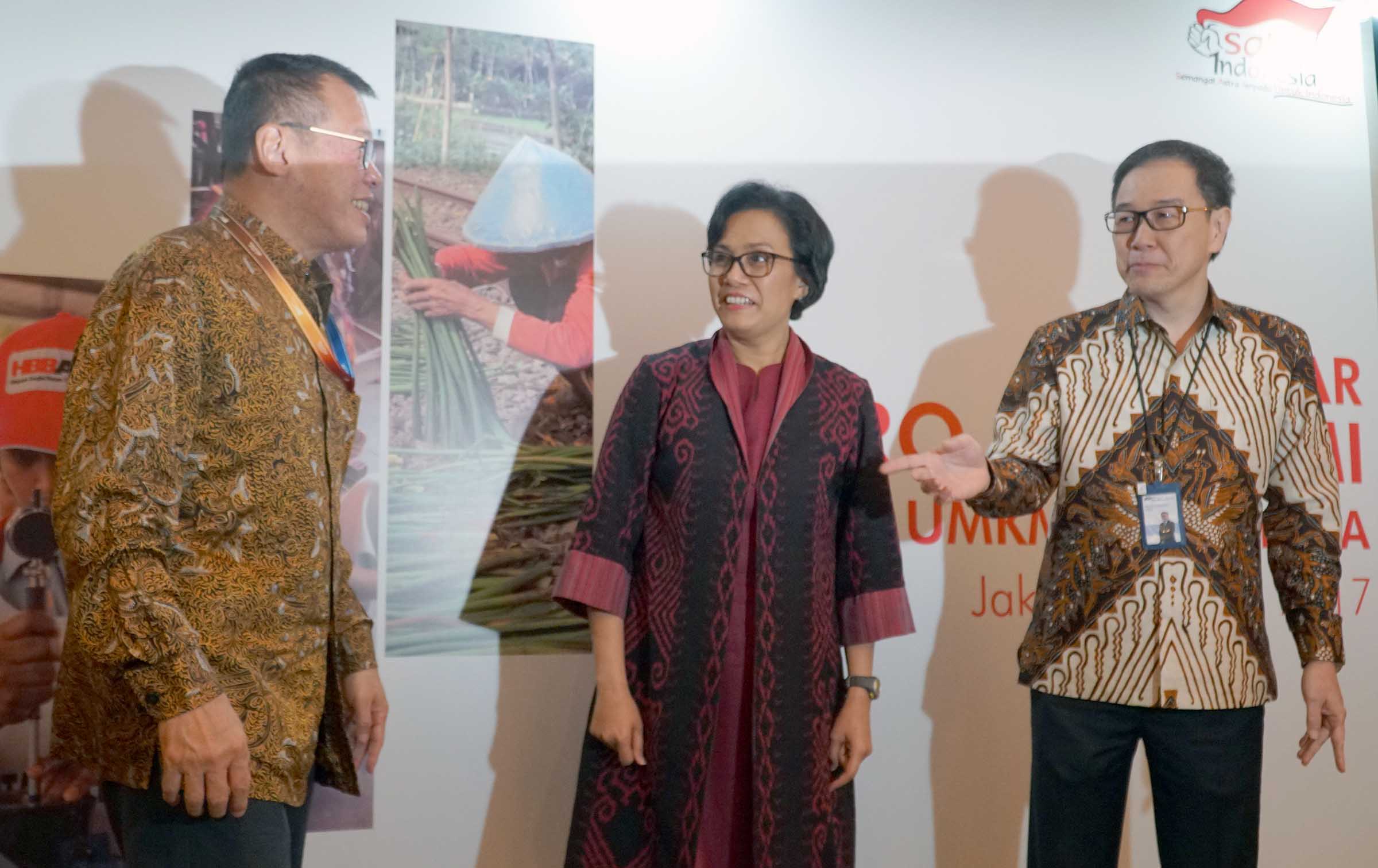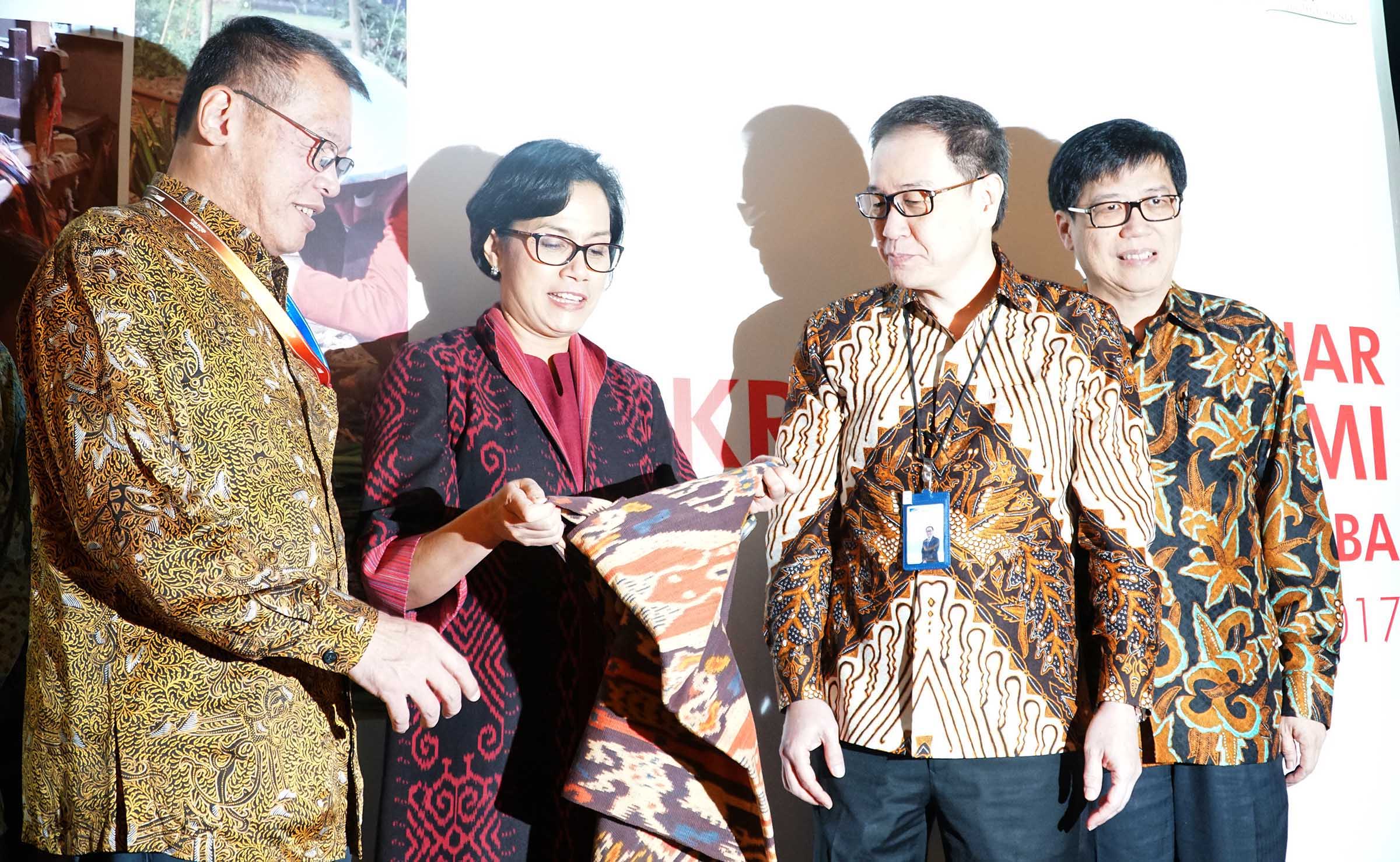 Menteri Keuangan RI Sri Mulyani Indrawati (kedua dari kiri) didampingi Presiden Direktur PT Astra International Tbk Prijono Sugiarto (kedua kanan), Ketua Pembina Yayasan Dharma Bhakti Astra (YDBA) Johannes Loman (kanan) menyimak penjelasan dari Ketua YDBA Henry C. Widjaja (kedua kiri) tentang kain tenun hasil karya salah satu mitra YDBA pada acara Seminar Makro Ekonomi YDBA di Jakarta, Senin (3/4). Seminar makro ekonomi merupakan tradisi Astra melalui YDBA untuk mengedukasi mitra UMKM agar memahami dan mendapatkan informasi terkini mengenai perkembangan ekonomi, sehingga mereka dapat dengan cerdas merumuskan setiap perencanaan bisnisnya. Tidak hanya itu, para UMKM diharapkan dapat memanfaatkan informasi yang disampaikan oleh Menteri Sri Mulyani dalam menyiasati kondisi ekonomi tahun 2017. AKTUAL/Eko S Hilman