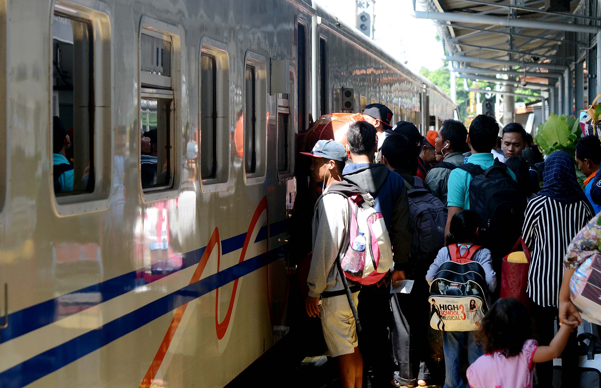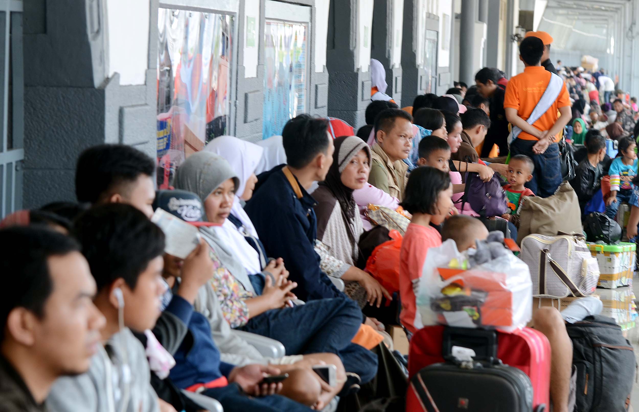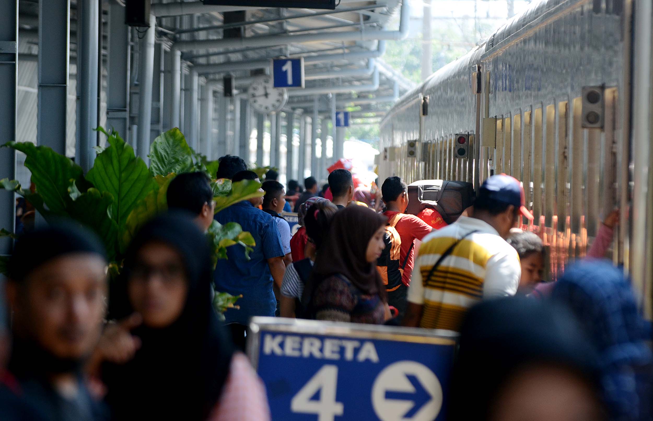 Sejumlah penumpang menunggu kereta jurusan Jawa Timur di Stasiun Kereta Senen, Jakarta, Rabu (29/6/2016). Peningkatan pemudik di stasiun Senen mengalami lonjakan 30%. Sejak hari Sabtu kemarin tercatat sebanyak 81ribu pemudik pulang melalui stasiun Senen.