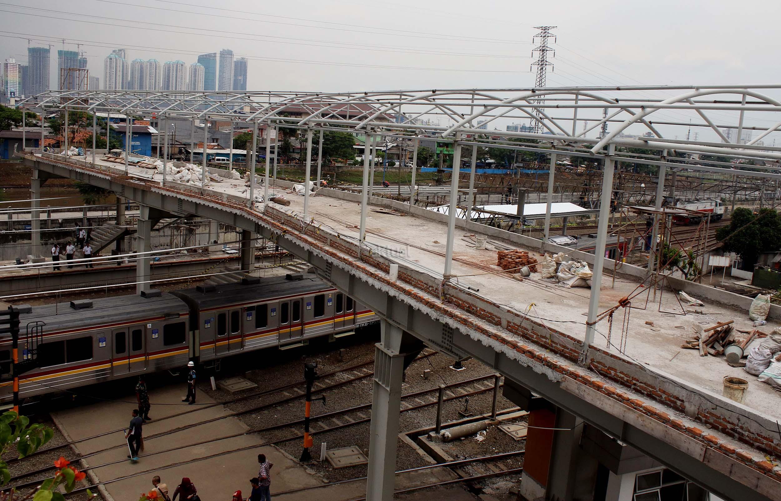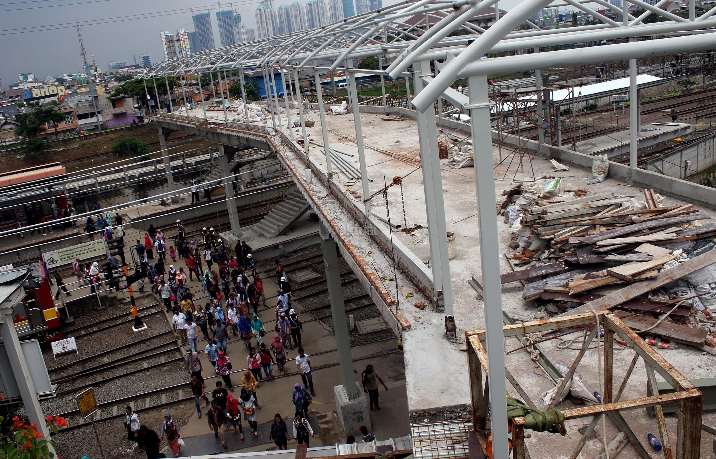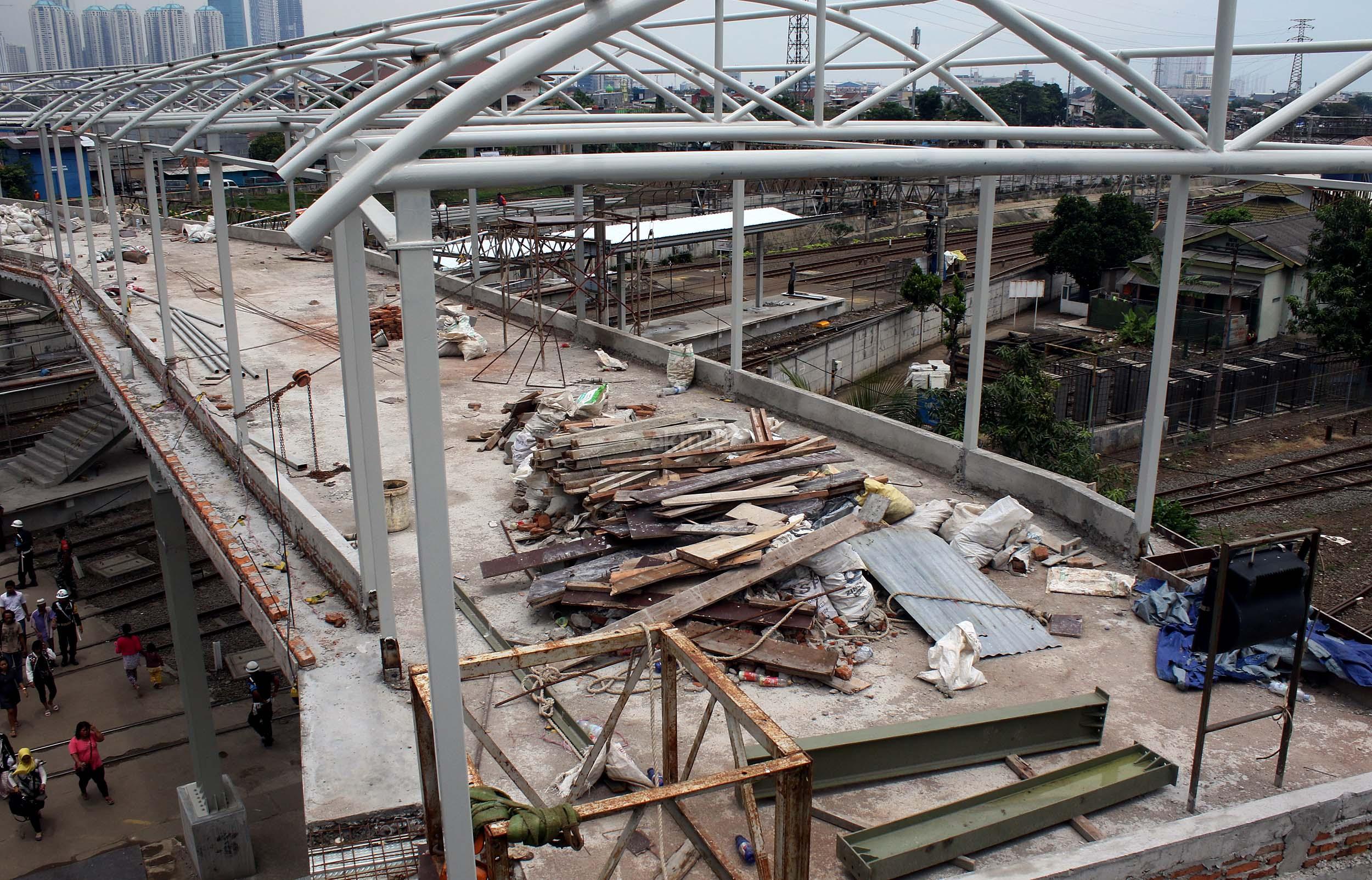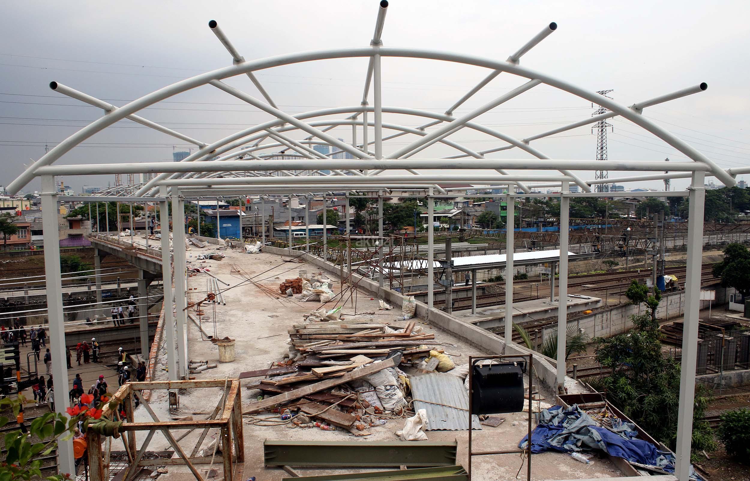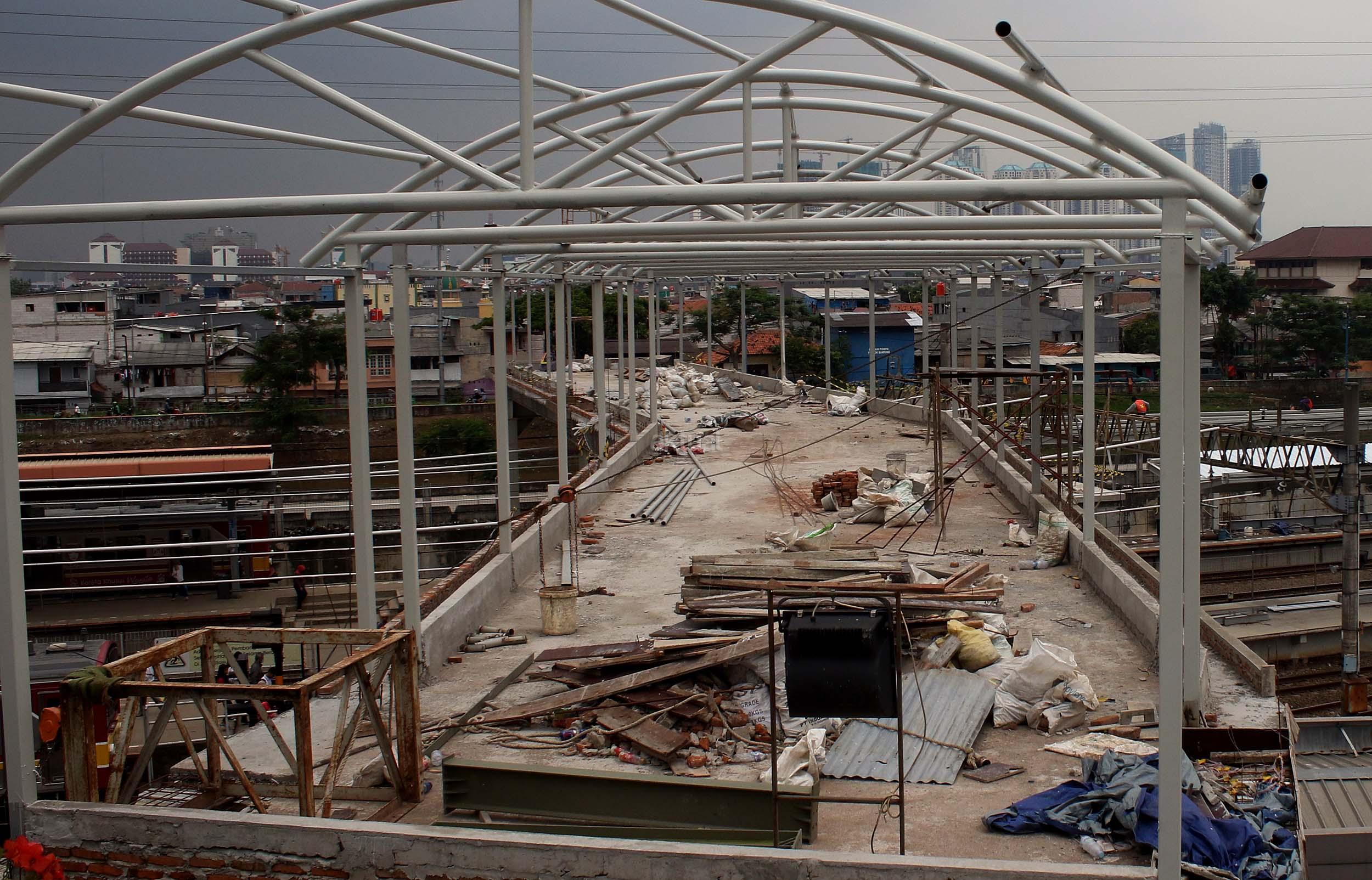 Pekerja sedang merapikan pekerjaan pembangunan shelter dan jembatan penyeberangan orang di Stasiun Tanah Abang, Jakarta Pusat, Senin (10/10/2016). Pembangunan sarana umum ini untuk mempermudah warga beraktifitas di areal stasiun serta memberi rasa aman dan kenyamanan bagi para pengguna jasa kereta api yang datang ke stasiun ini.