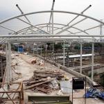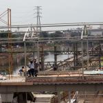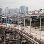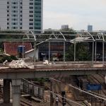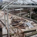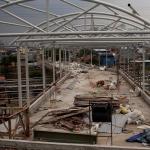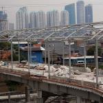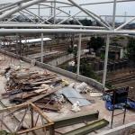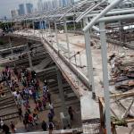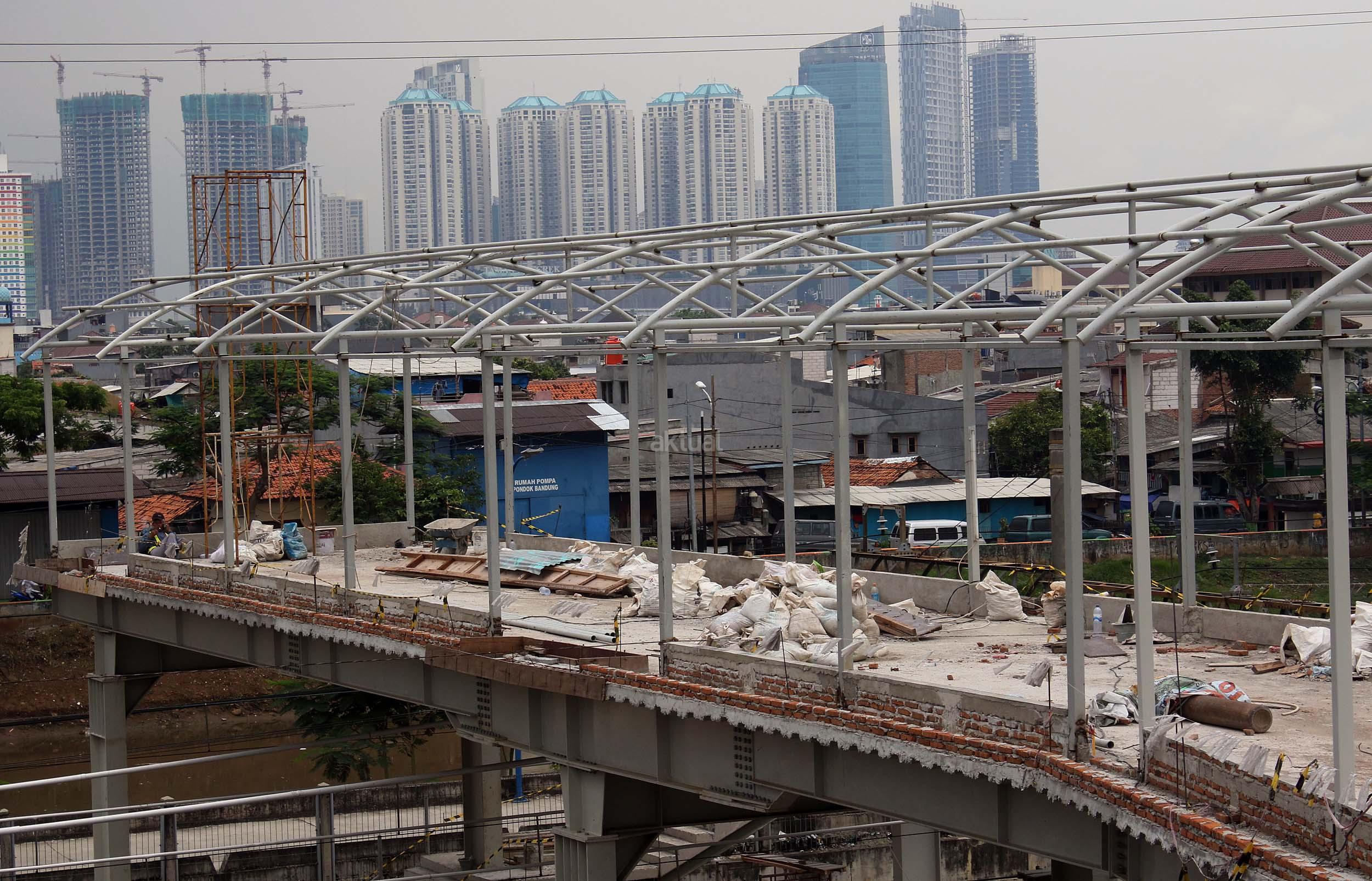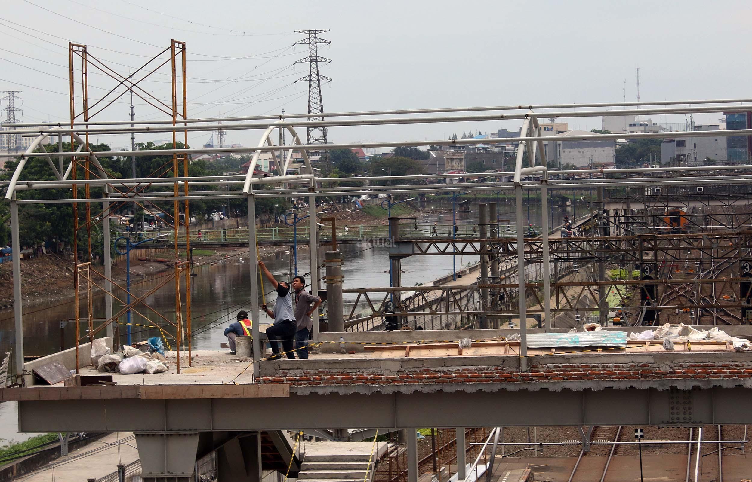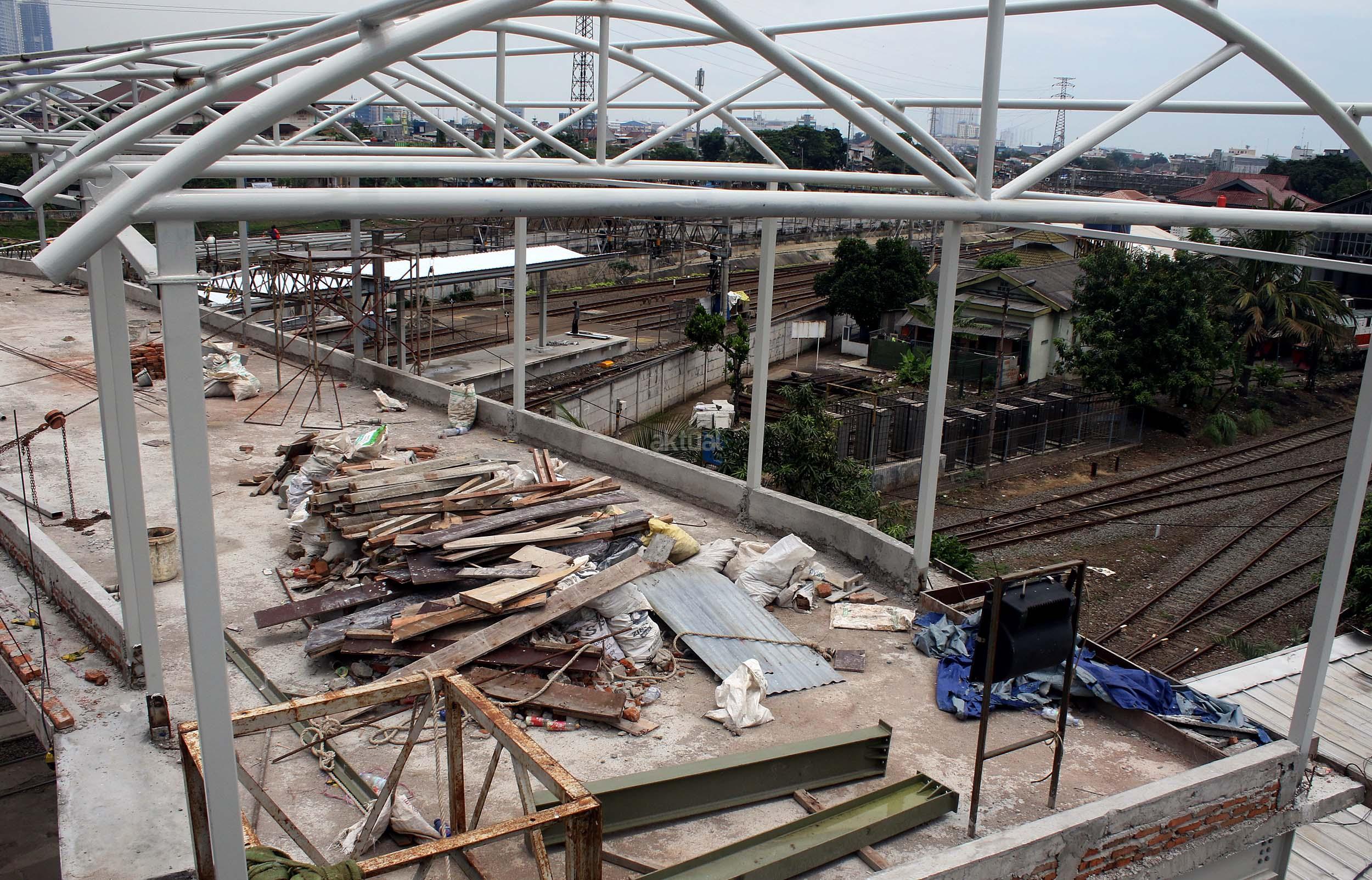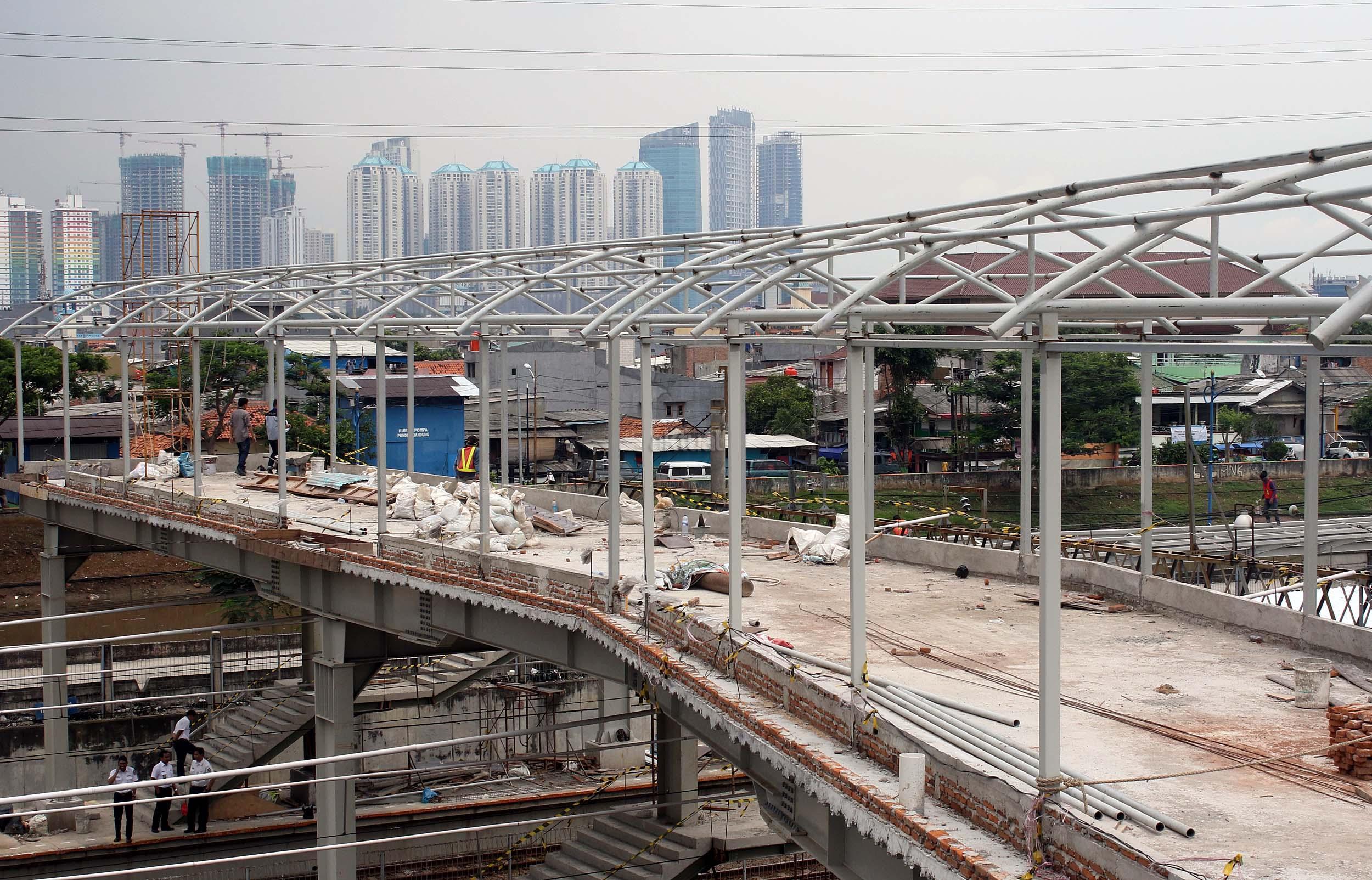 Pekerja sedang merapikan pekerjaan pembangunan shelter dan jembatan penyeberangan orang di Stasiun Tanah Abang, Jakarta Pusat, Senin (10/10/2016). Pembangunan sarana umum ini untuk mempermudah warga beraktifitas di areal stasiun serta memberi rasa aman dan kenyamanan bagi para pengguna jasa kereta api yang datang ke stasiun ini.