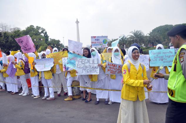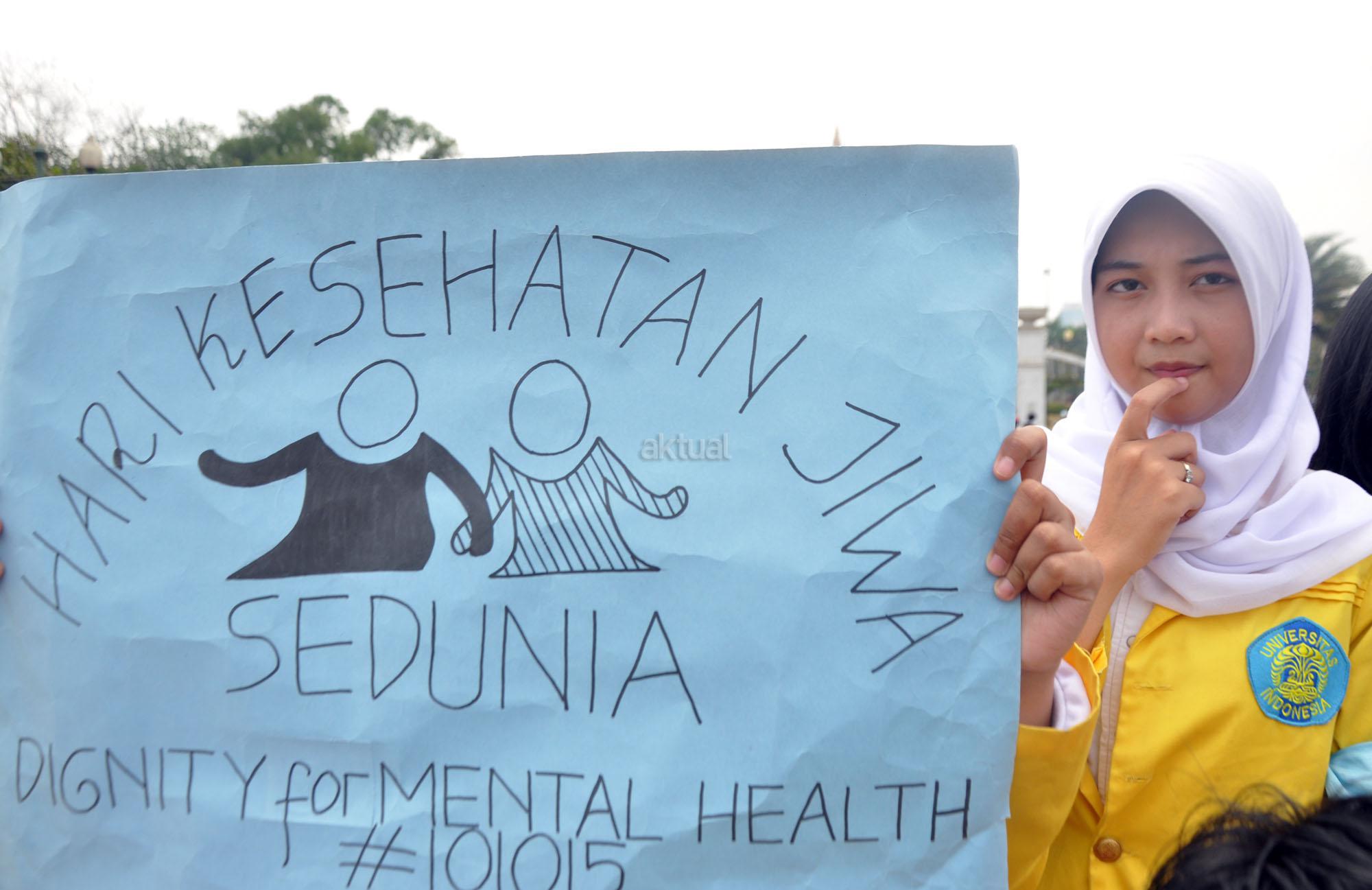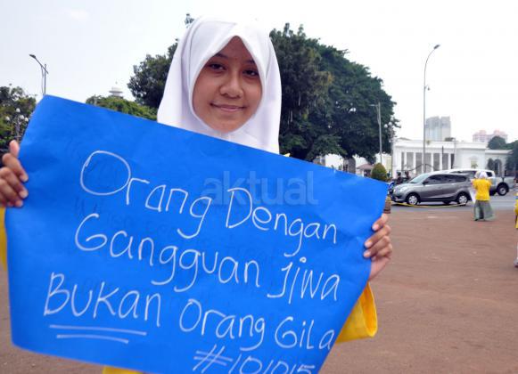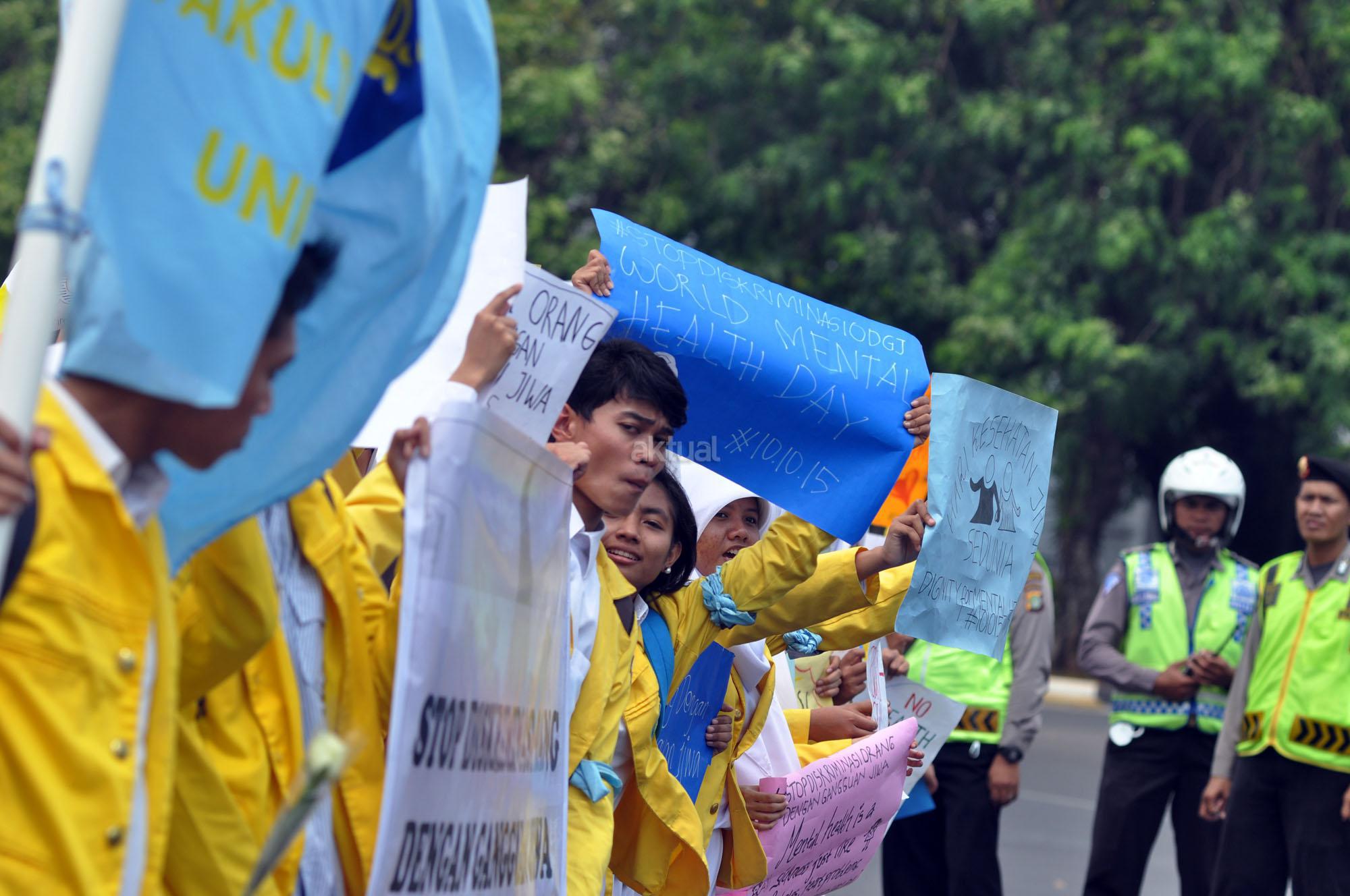 Sejumlah Mahasiswa yang tergabung dalam BEM UI melakukan aksi unjuk rasa di depan Istana Negara, Jakarta, Sabtu (10/10/2015). Dalam aksinya mereka menuntut pemerintah untuk memperhatikan orang sakit jiwa dan mengajak masyarakat untuk mengganti pangilan Orang Gila menjadi orang sakit jiwa. Mereka membagi-bagikan bunga kepada pengguna jalan dan petugas polisi sebagai lambang keprihatinan terhadap pemerintah yang dinilai kurang perhatian terhadap orang sakit jiwa.