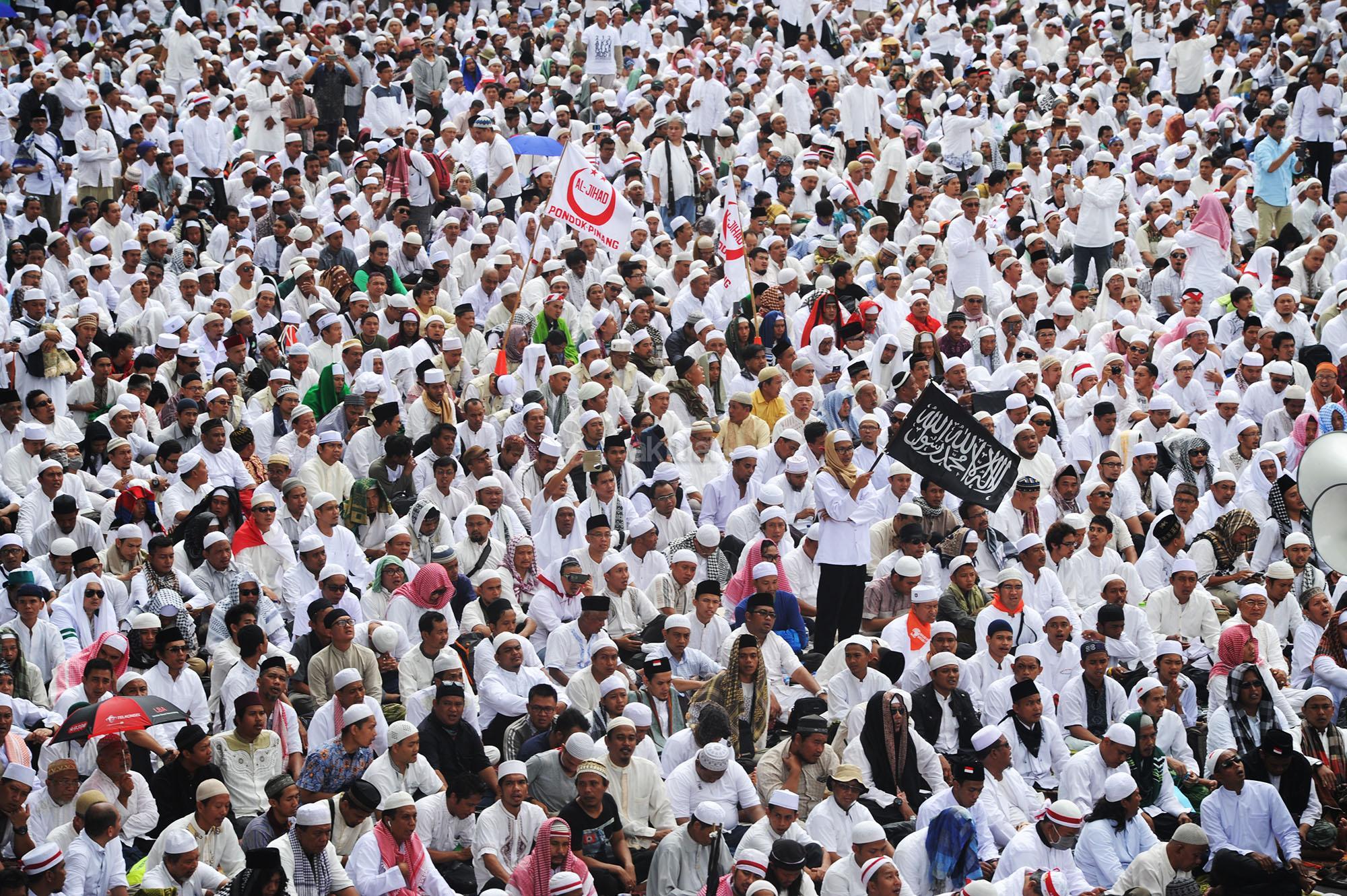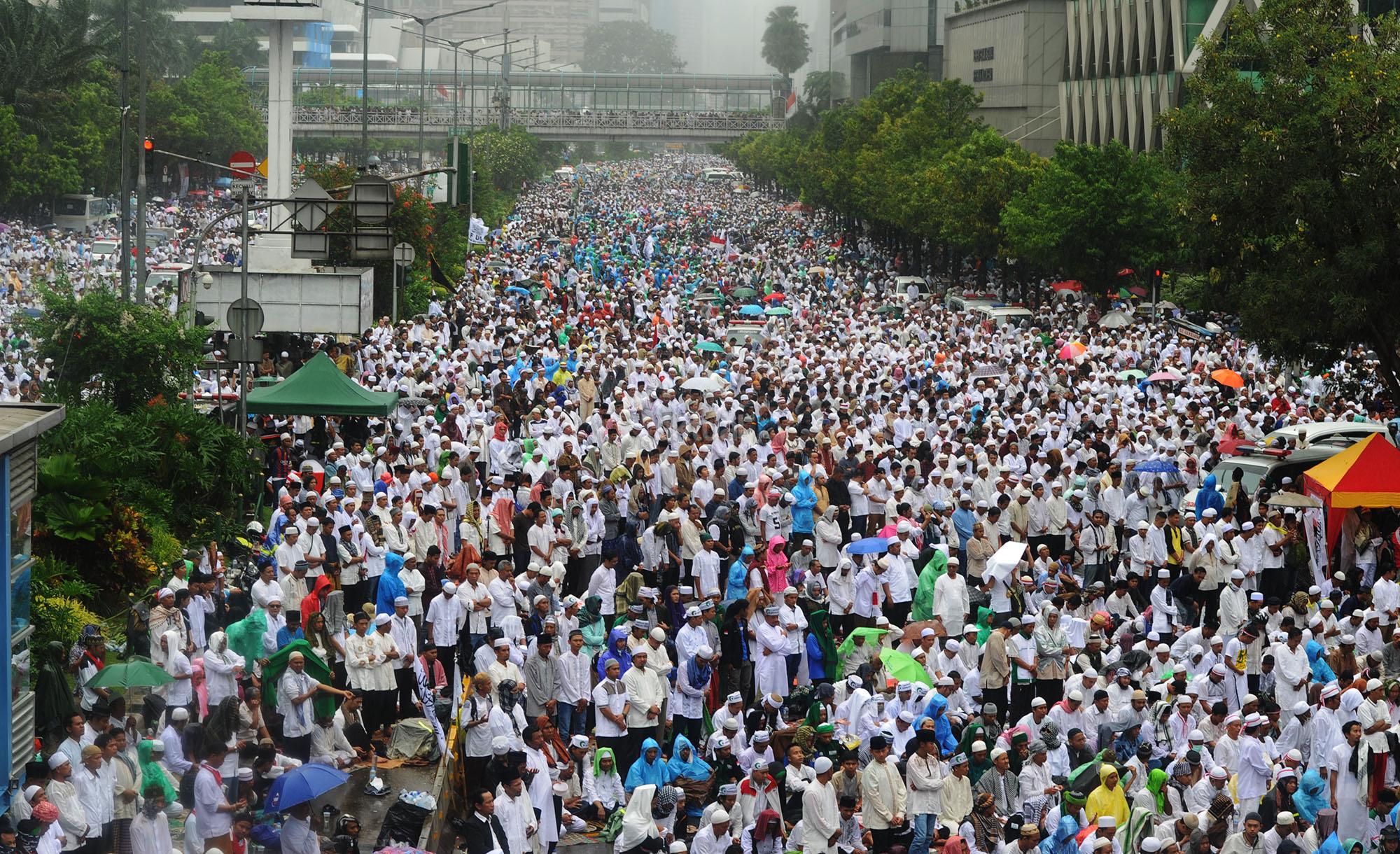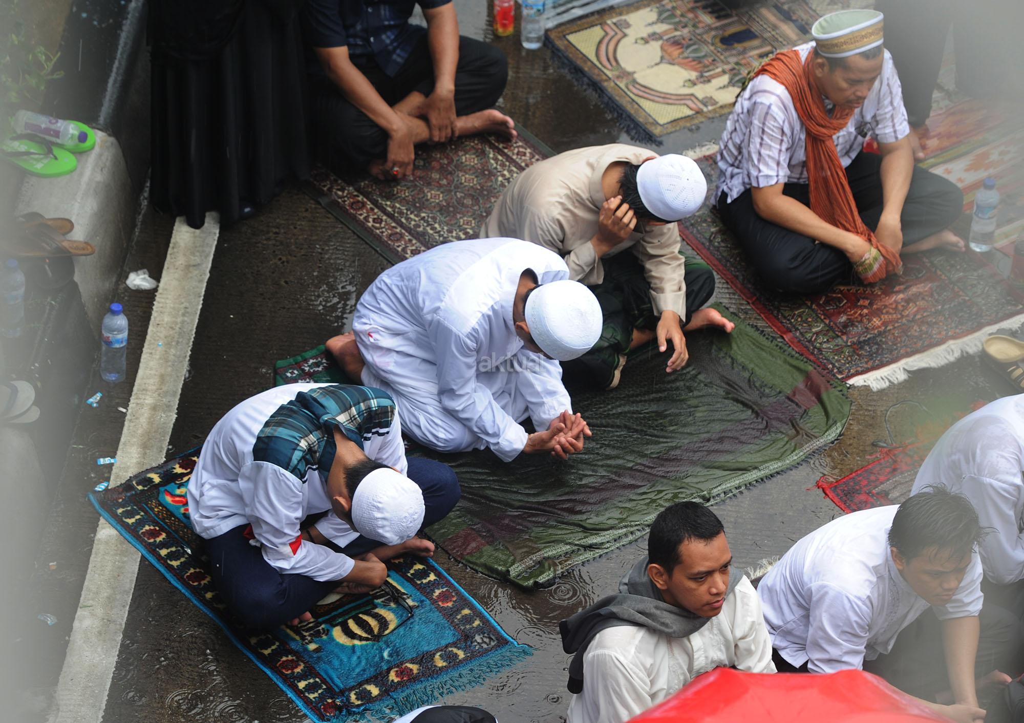 Jutaan peserta Aksi Damai 212 melaksanakan Salat Jumat di Jalan MH. Thamrin, Jakarta, Jumat (2/12). Meski berada di tengah guyuran hujan deras, mereka tetap khusyuk menjalankan kewajibannya sebagai muslim. AKTUAL/Tino Oktaviano