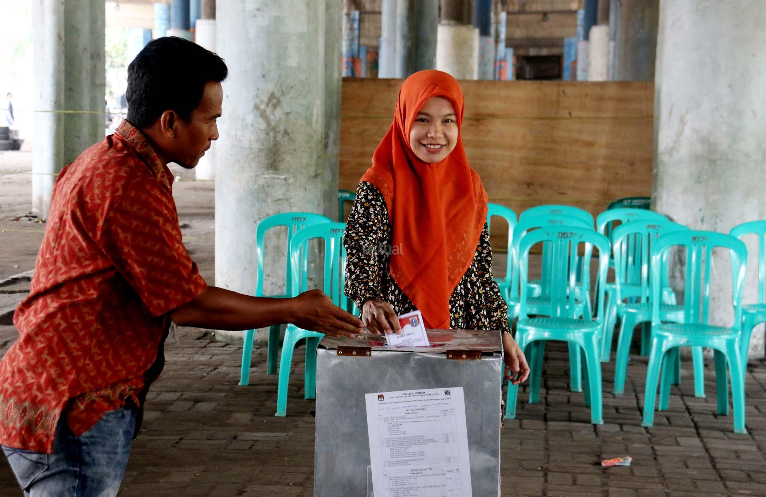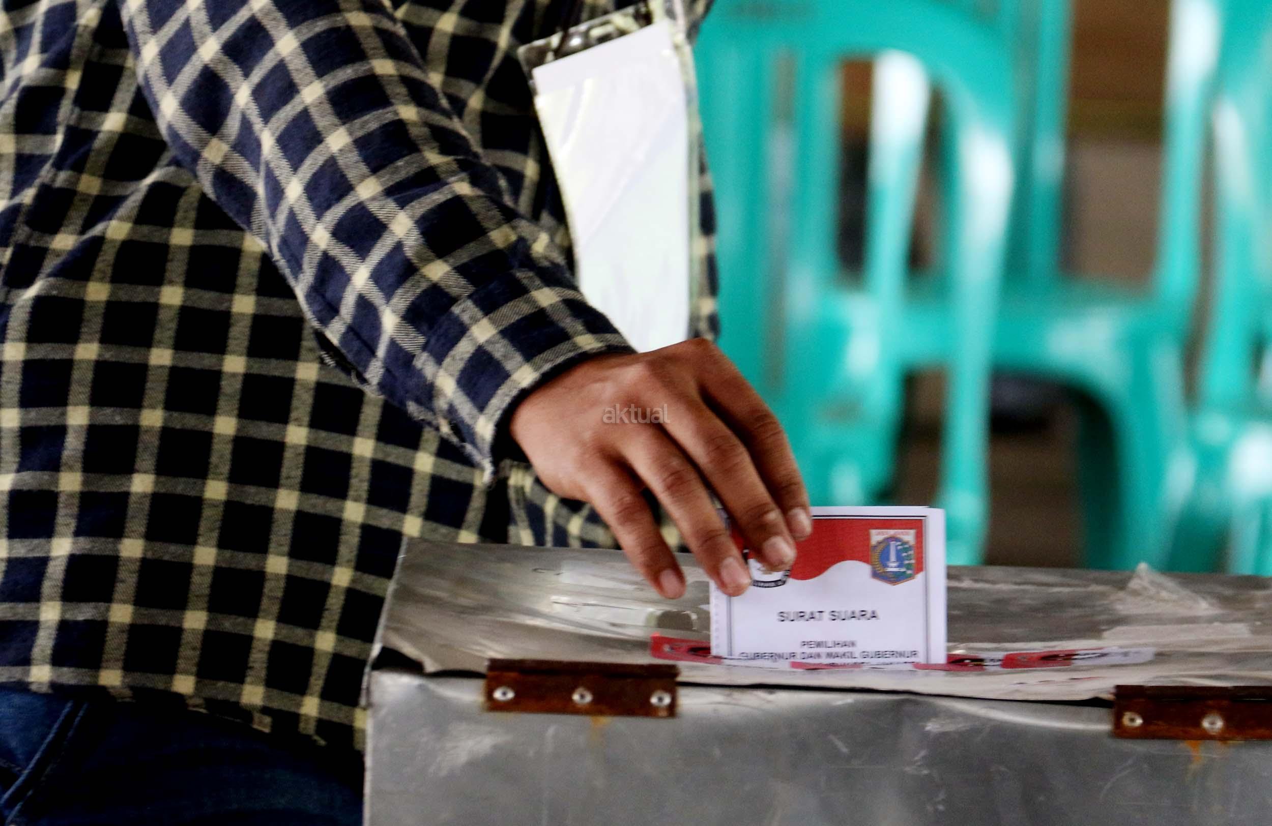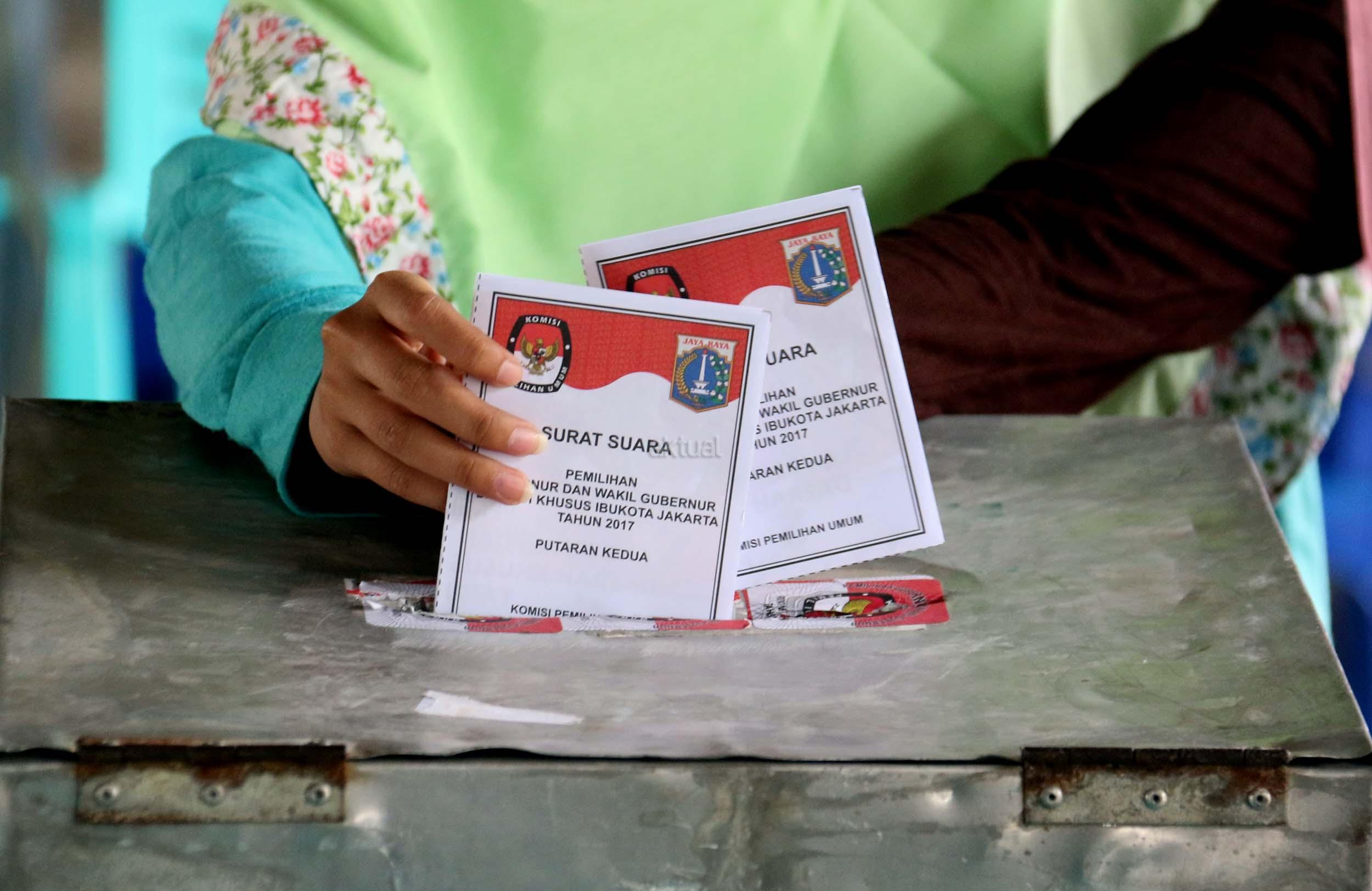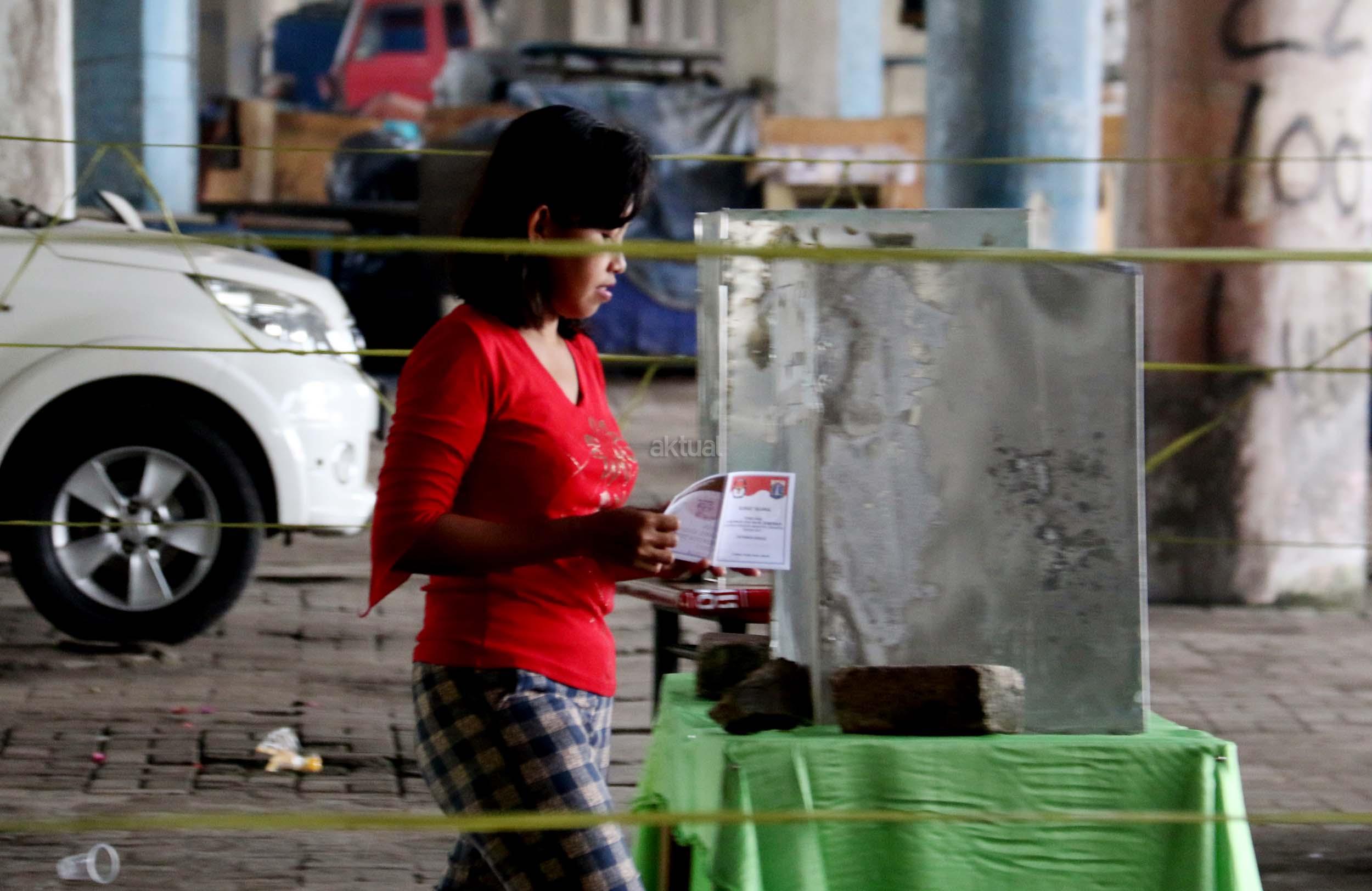 Warga mencoblos pada Pilkada DKI Jakarta Putaran kedua di TPS 20 Kolong Tol Pluit, Penjaringan, Jakarta Utara, Rabu (19/4/2017). TPS 20 memiliki 611 Daftar Pemilih Tetap (Tetap). Pilkada putaran kedua diikuti oleh 2 pasang calon yaitu Ahok-Djarot dan Anies-Sandi. AKTUAL/Munzir