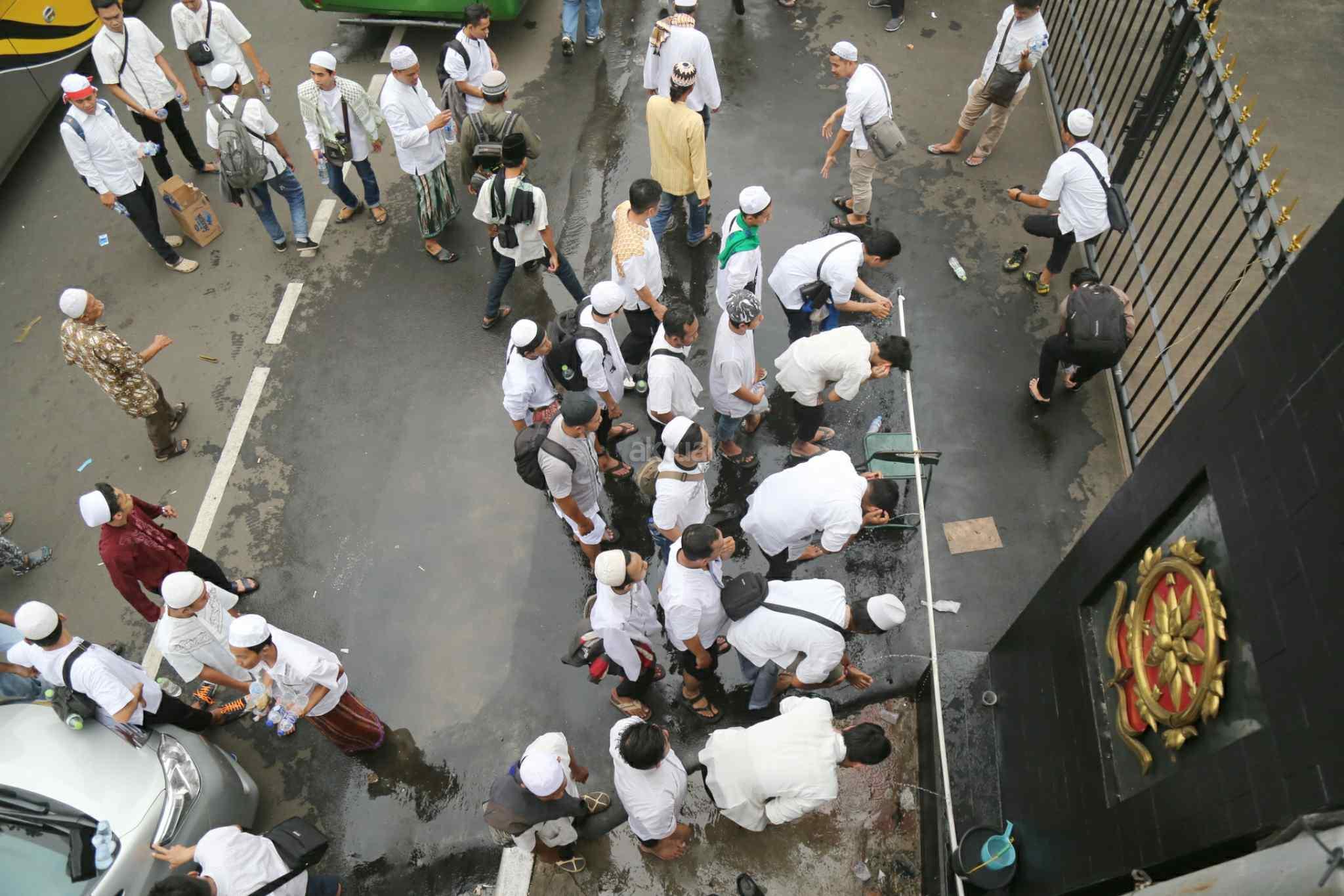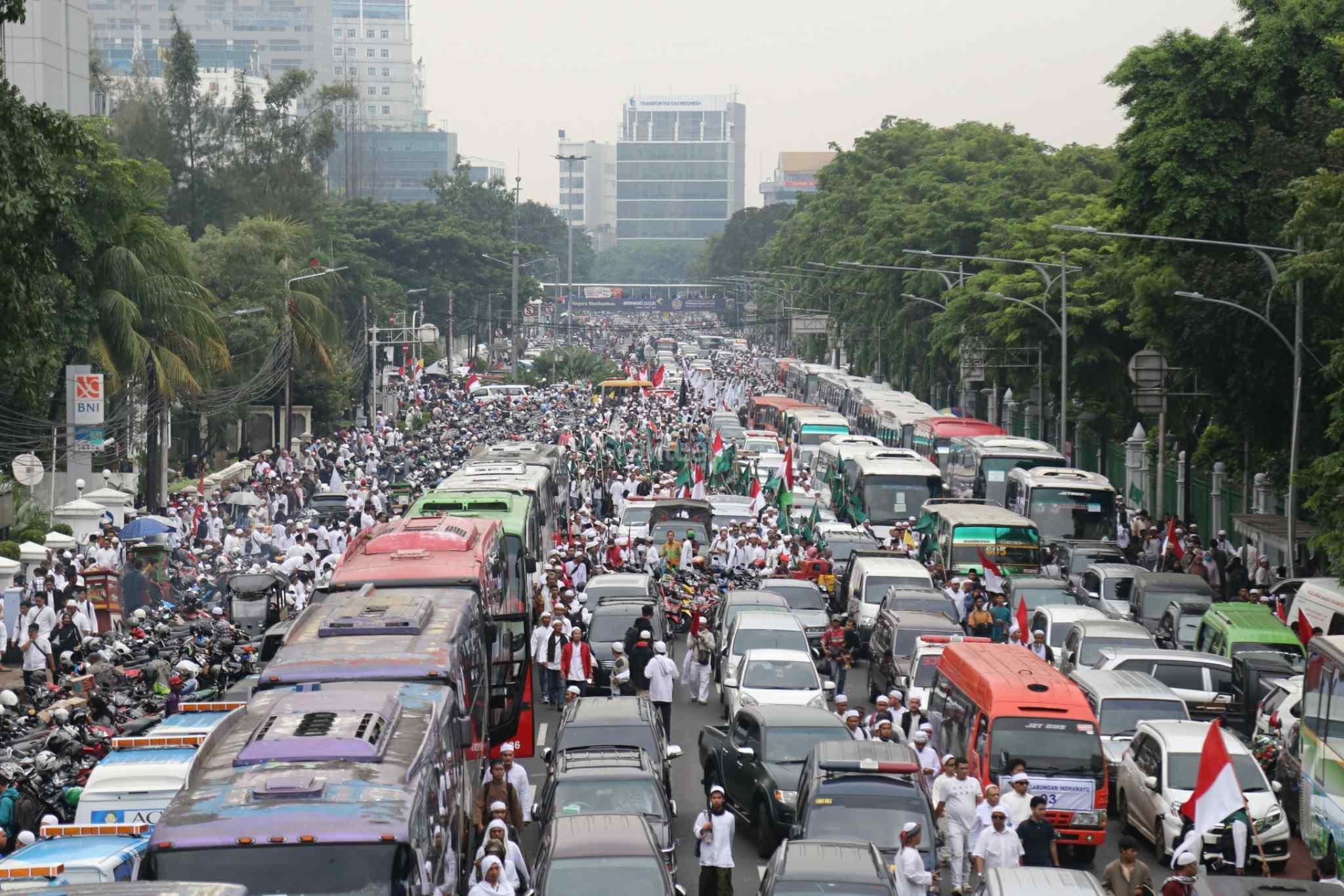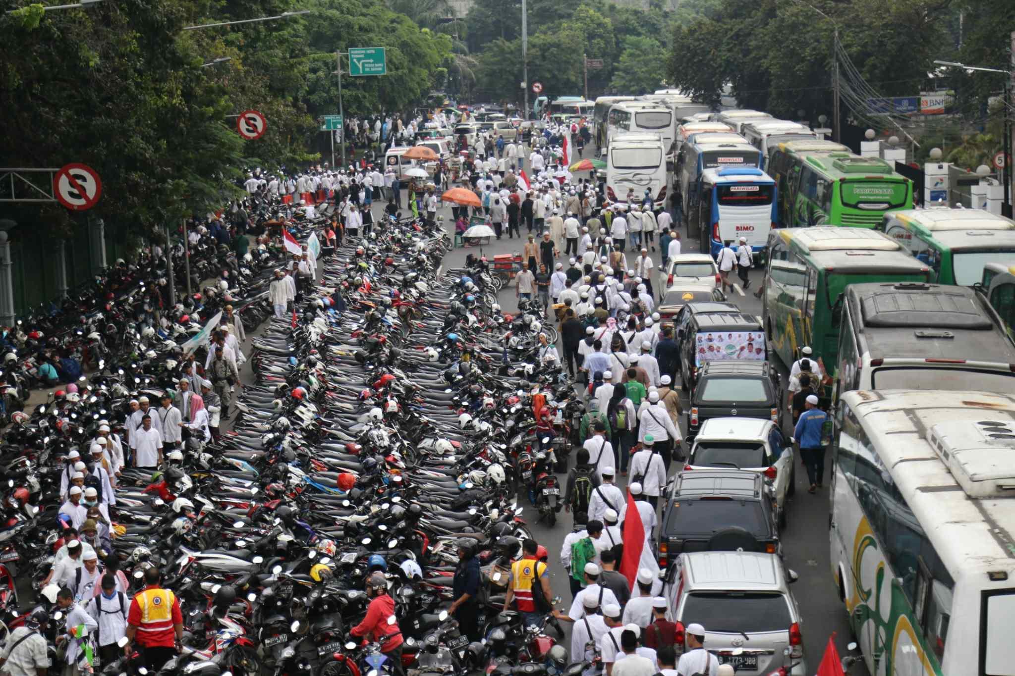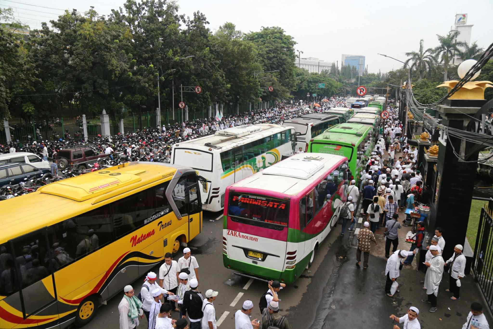 Rombongan pengunjuk rasa menuntut kepastian proses hukum penistaan agama oleh Gubernur DKI Jakarta, Basuki Tjahaja Purnama (Ahok) yang menggunakan motor dan berjalan kaki memadati kawasan Gambir sebelum waktu shalat Jumat, Jakarta Pusat, Jumat (4/11/2016). Akibatnya, untuk antisipasi kemacetan, PT KAI DAOP I mengimbau penumpang kereta naik di Stasiun Jatinegara. AKTUAL/Tino Oktaviano
