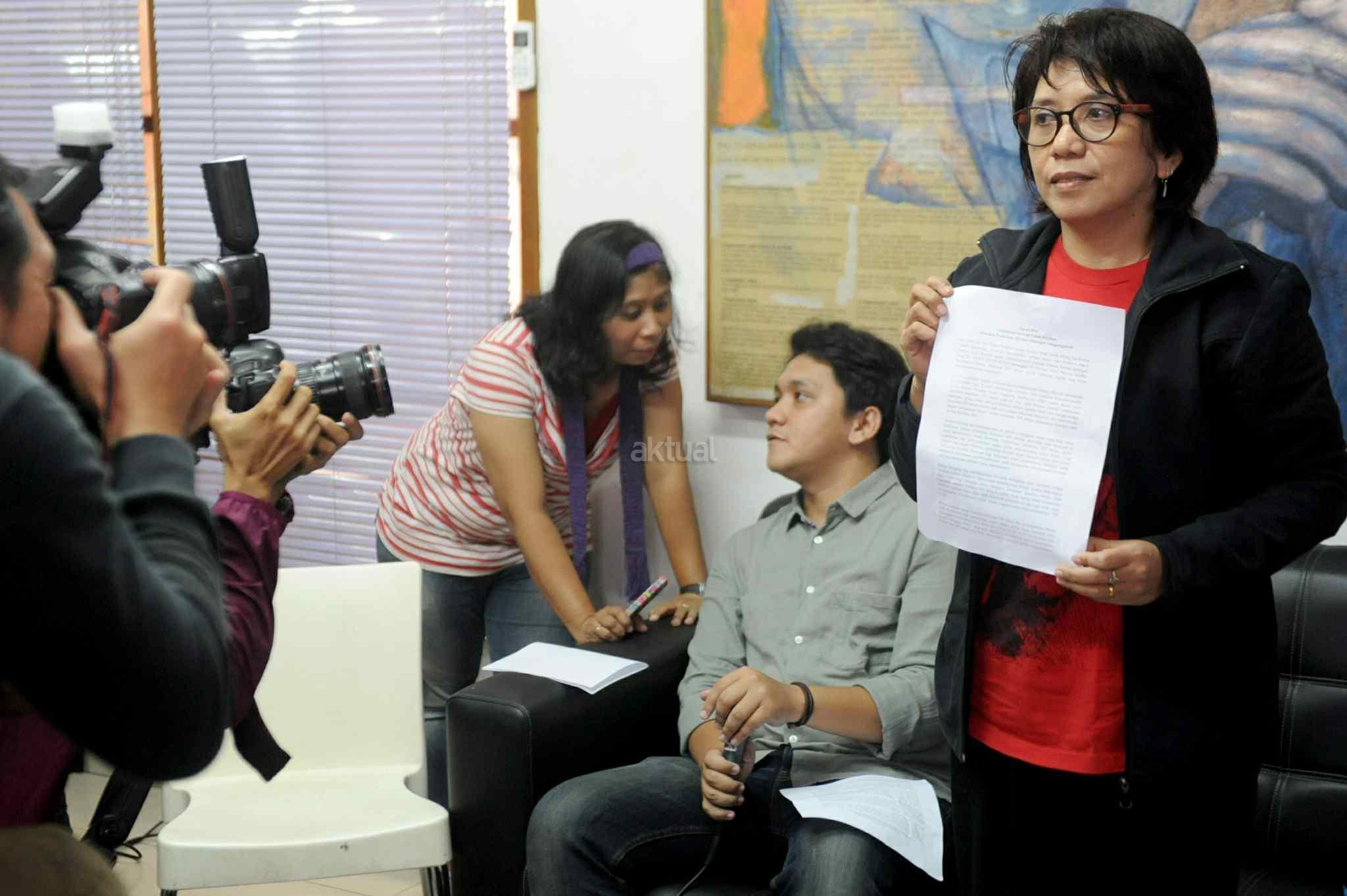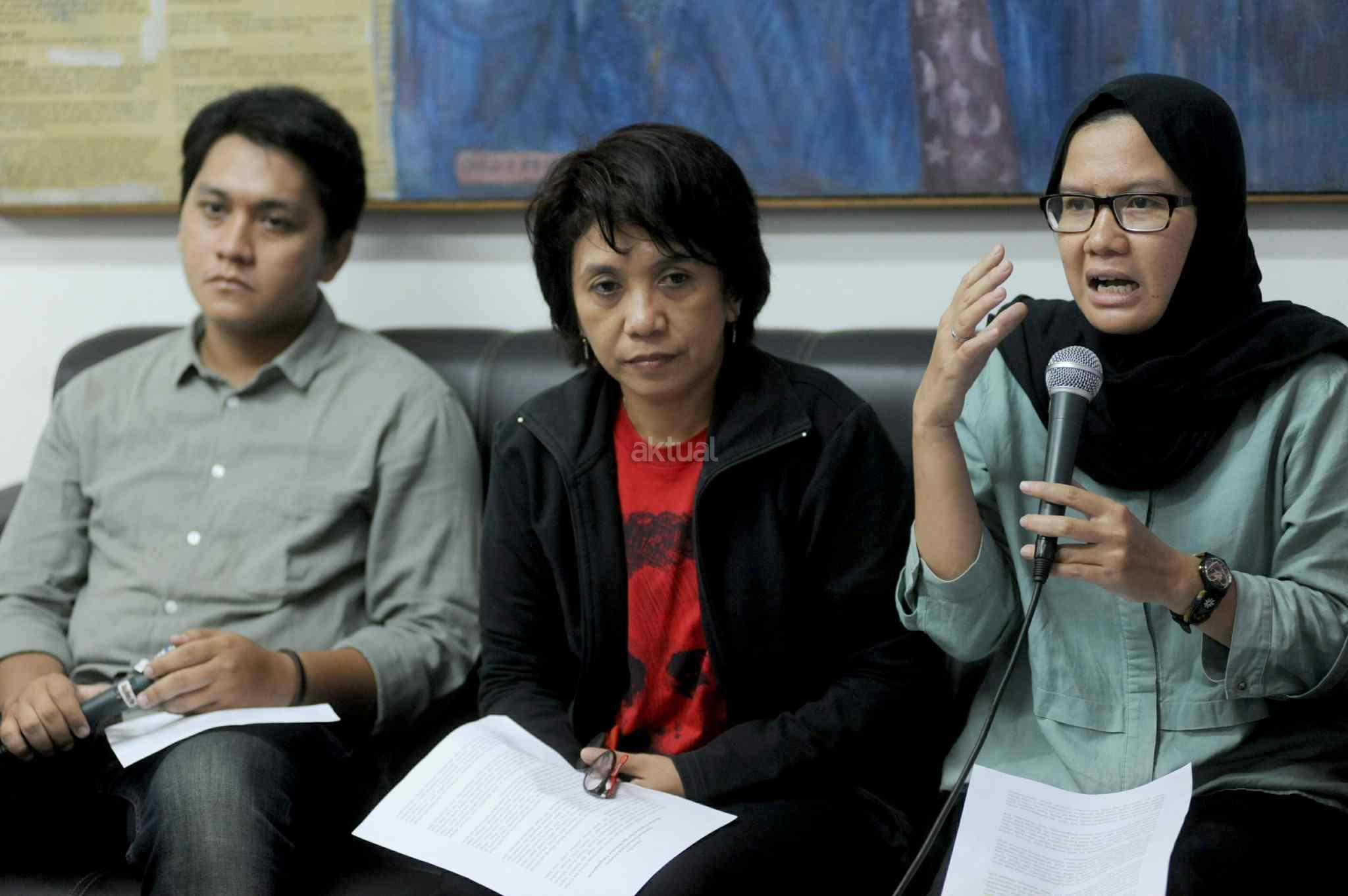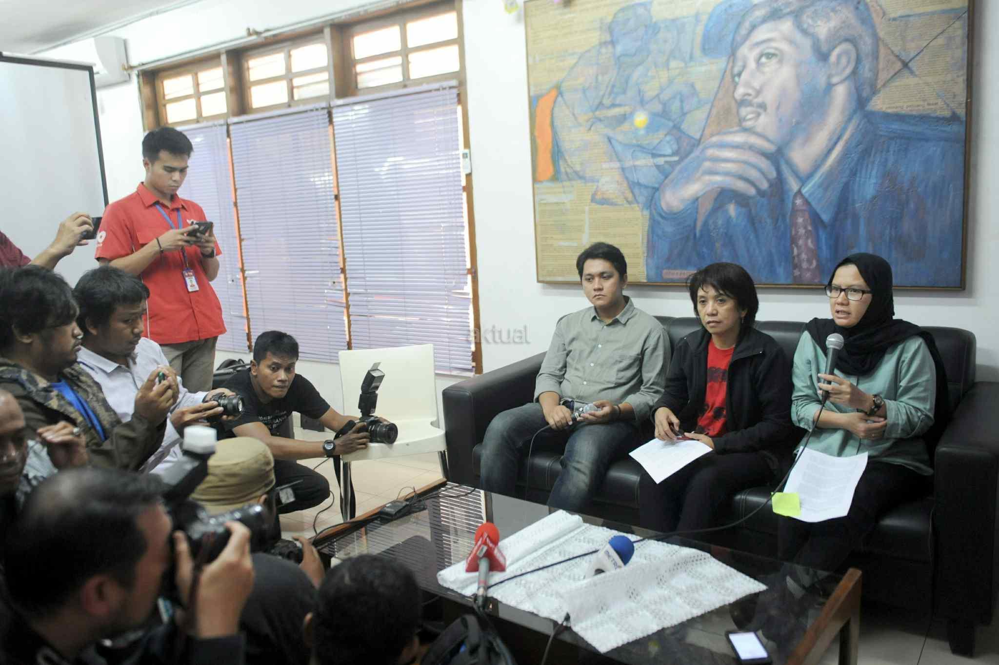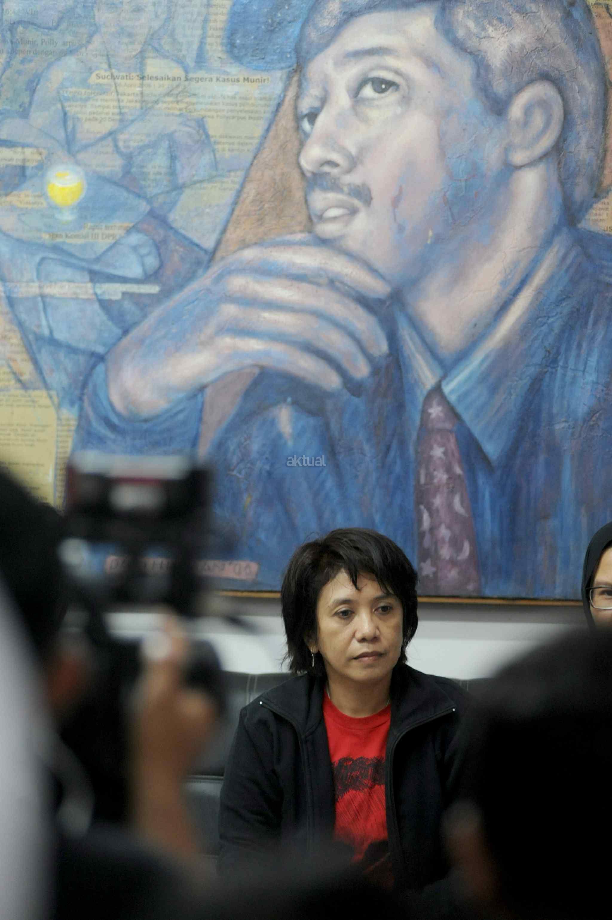 Istri almarhum Munir Said Thalib, Suciwati (tengah) saat mengultimatum Jokowi agar segera membuka dokumen investigasi Tim Pencari Fakta (TPF) kasus pembunuhan Munir di kantor Komisi untuk Orang Hilang dan Korban Tindak Kekerasan (KontraS), Jakarta, Rabu (19/10). KontraS memenangi sengketa informasi dokumen investigasi TPF kasus pembunuhan Munir yang dinyatakan terbuka untuk publik, namun Kementerian Sekretariat Negara yang seharusnya menyimpan dokumen itu mengaku tak menguasainya alias tak memegangnya. AKTUAL/Tino Oktaviano