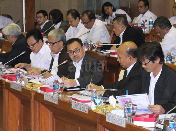 Dirjen Minerba Kementerian ESDM Bambang Gatot Ariyono, saat mengikuti Rapat Kerja (Raker) dengan Komisi VII DPR RI, di Komplek Parlemen, Senayan, Jakarta, Selasa (8/3/2016). Raker tersebut membahas Peraturan Menteri (Permen) no 37 tahun 2015 tentang tata cara penetapan alokasi dan pemanfaatan serta harga gas bumi, Permen no 19 tahun 2015 tentang pembelian tenaga listrik dari PLTA dengan kapasitas sampai 10 MW, Permen no 05 tahun 2016 tentang tata cara persyaratan pembelian rekomendasi pelaksanaan penjualan mineral ke luar negeri dan membahas dana ketahanan energi. Aktual/Junaidi Mahbub