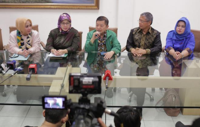Plt Ketua Umum Partai Persatuan Pembangunan (PPP) Suharso Monoarfa bersama jajaran pengurus PPP usai memberikan keterangan pers mengenai penunjukan plt ketum di Kantor DPP PPP, Jakarta, Sabtu (16/3). Suharso Monoarfa ditunjuk sebagai Plt Ketua Umum PPP menggantikan Romahurmuziy yang diberhentikan dari jabatannya. AKTUAL/Tino Oktaviano