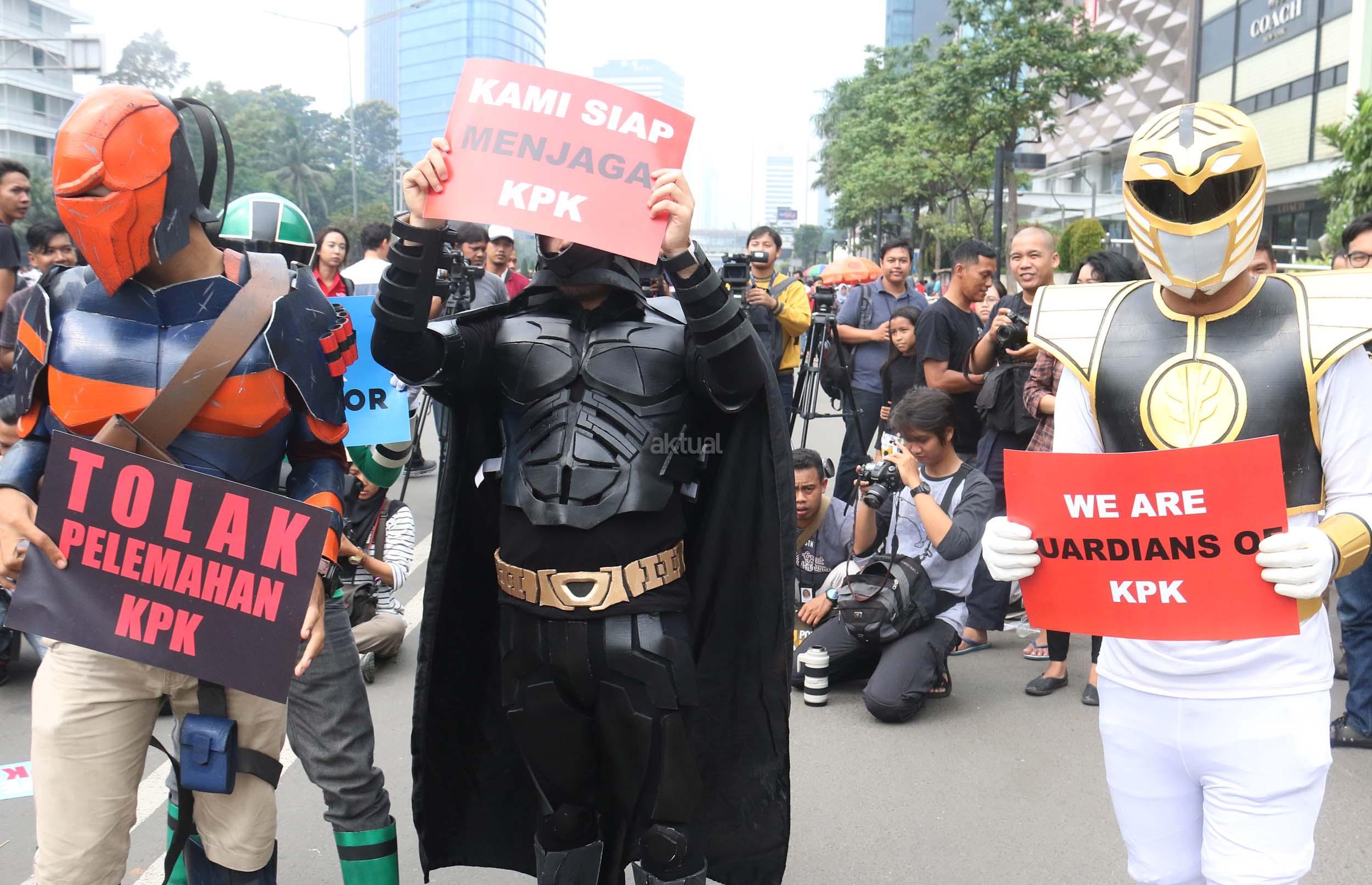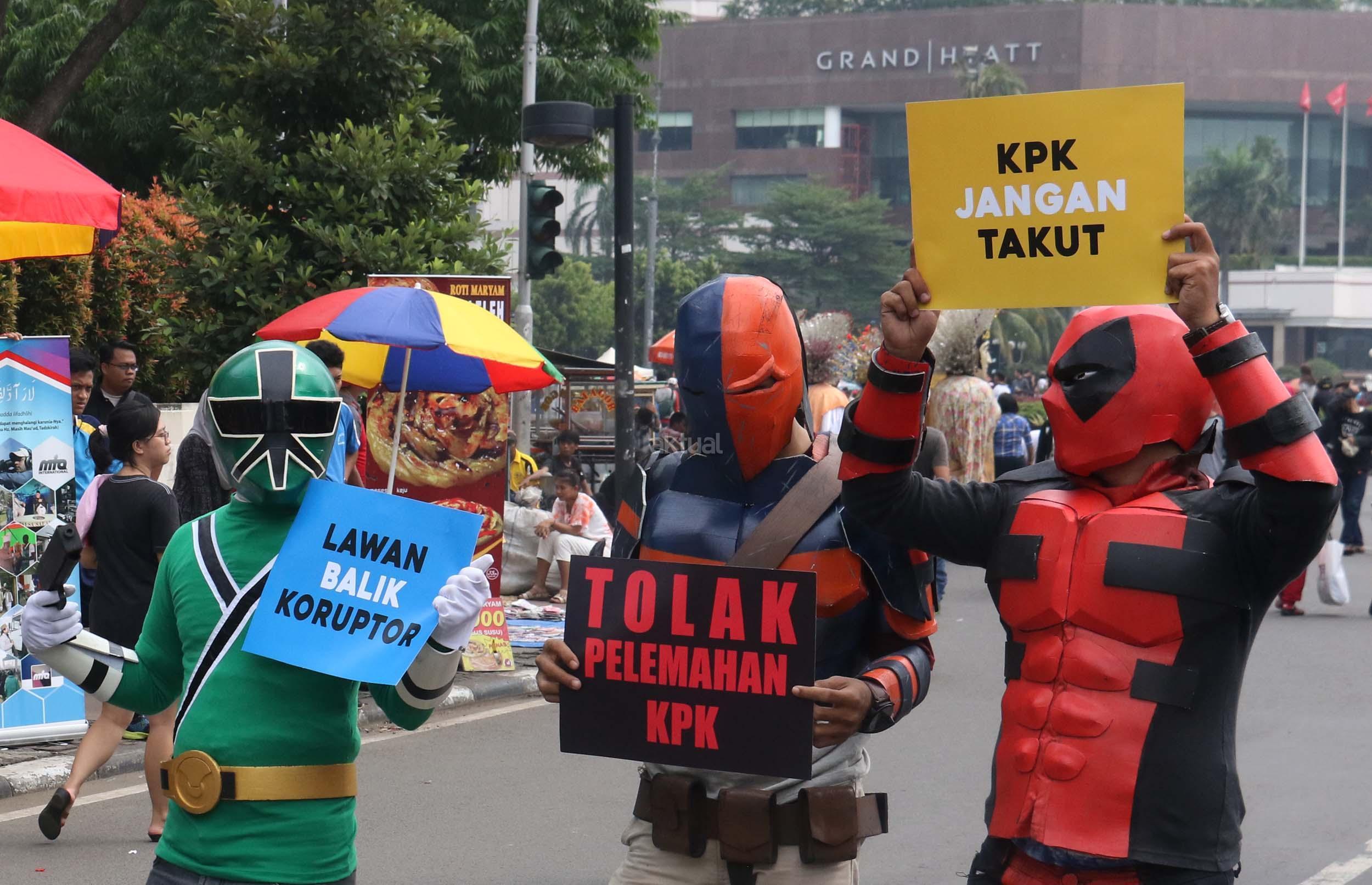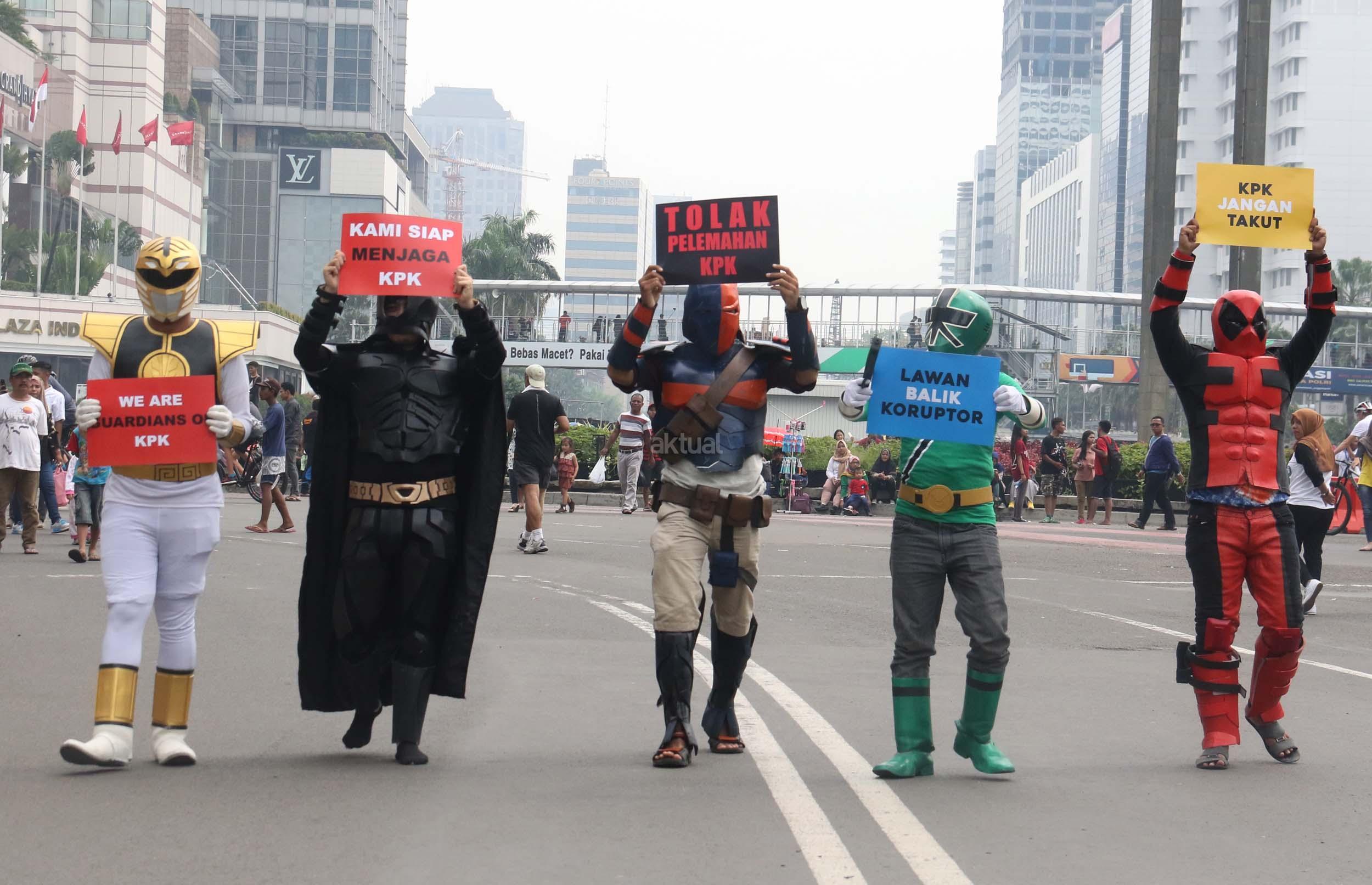 Sejumlah aktivis yang tergabung dalam Koalisi Save KPK menggelar aksi teaterikal dengan memakai kostum super hero di Kawasan Bundaran HI, Jakarta, Minggu (16/4/2017). Aksi ‘Guardians of KPK’ dilakukan untuk menyikapi tindak kekerasan yang diterima salah satu penyidik KPK, Novel Baswedan, sekaligus mengajak masyarakat ikut menjaga dan memberi dukungan kepada KPK. AKTUAL/Munzir