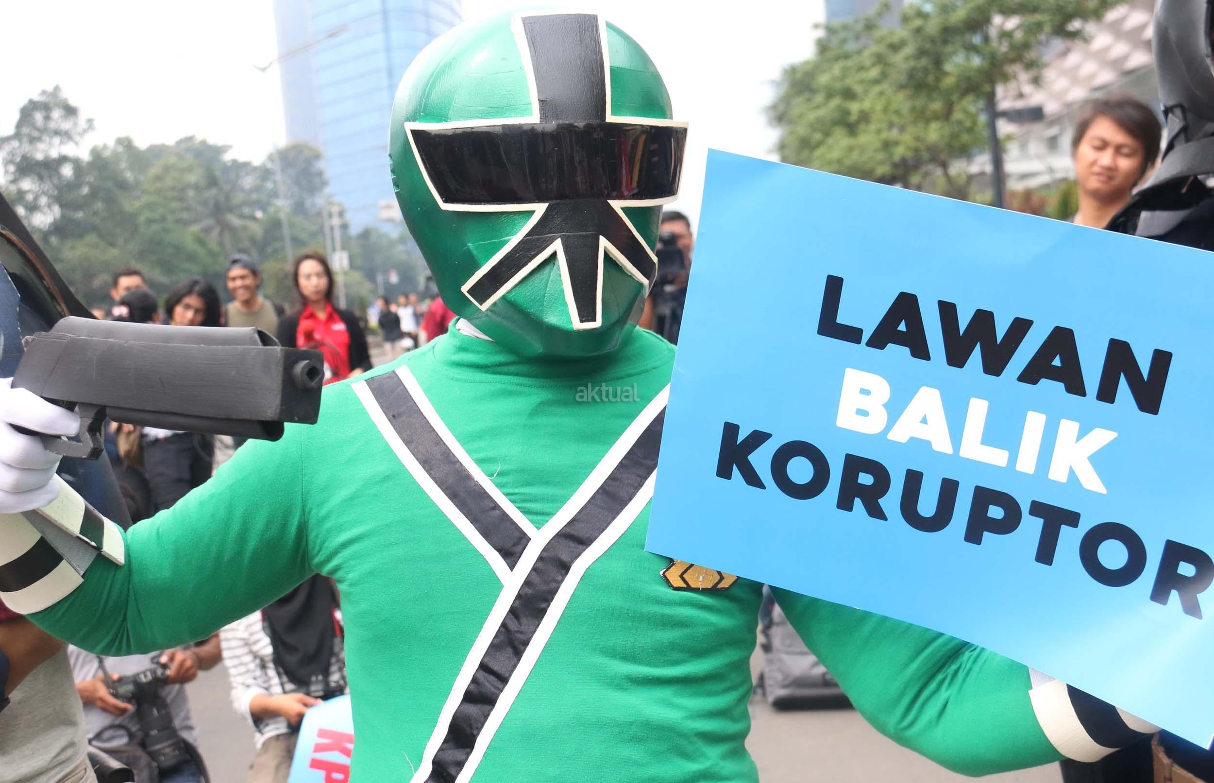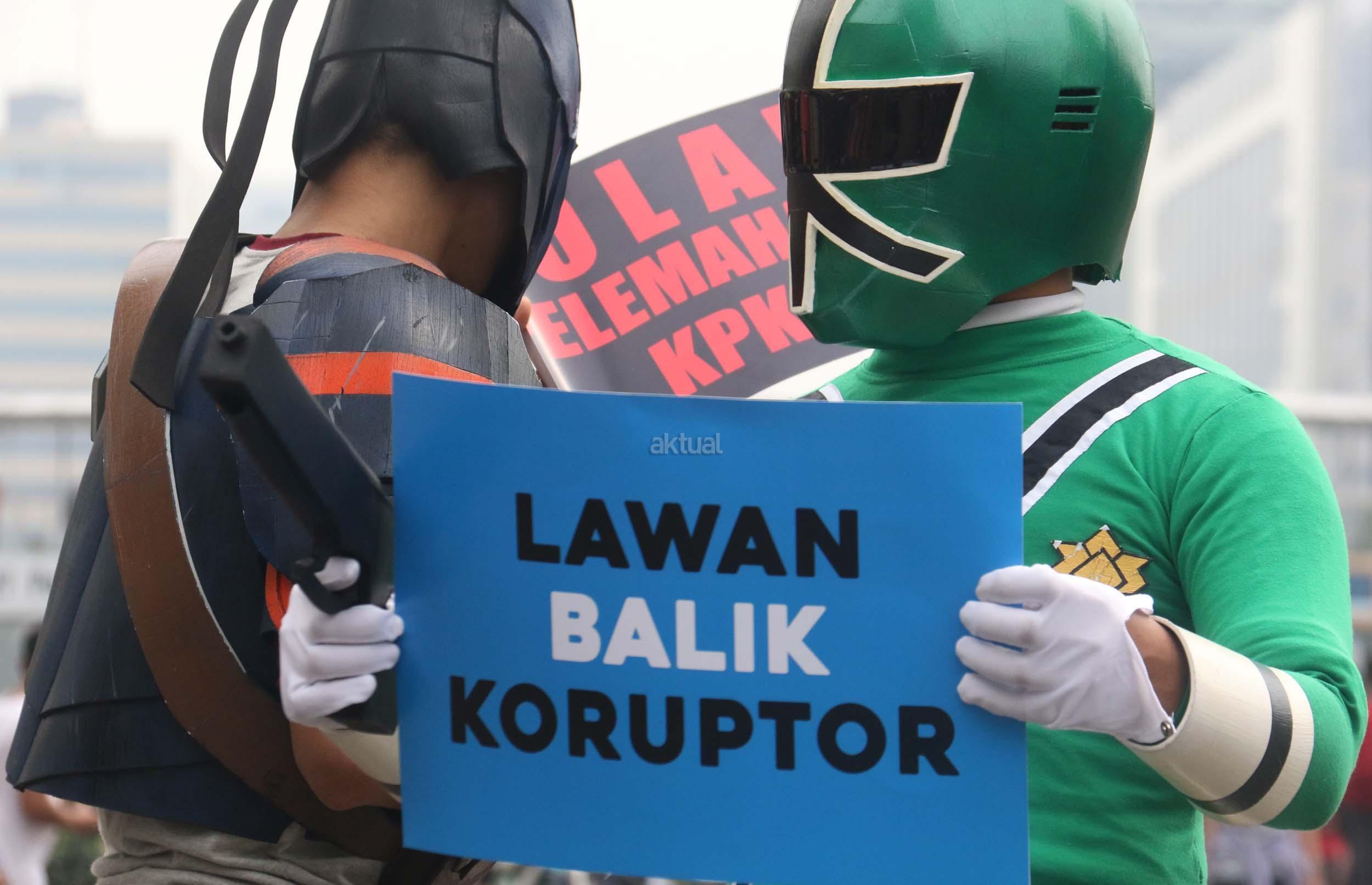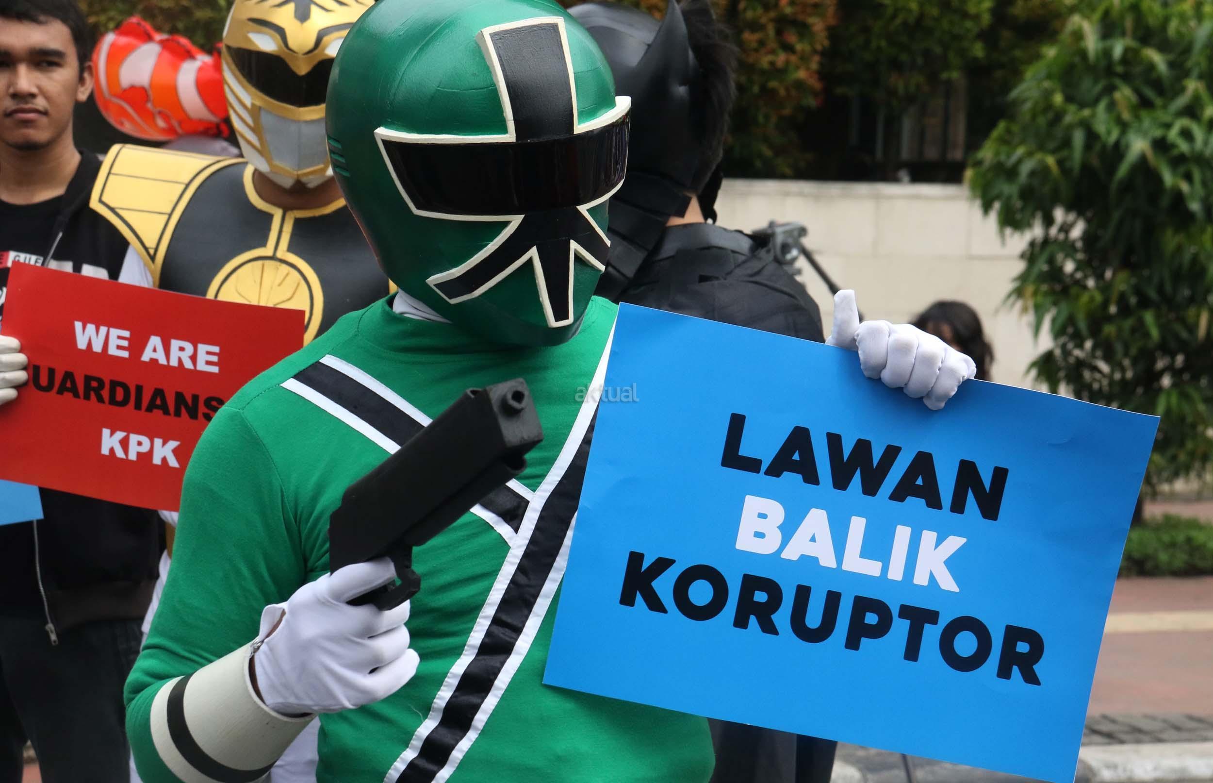 Sejumlah aktivis yang tergabung dalam Koalisi Save KPK menggelar aksi teaterikal dengan memakai kostum super hero di Kawasan Bundaran HI, Jakarta, Minggu (16/4/2017). Aksi ‘Guardians of KPK’ dilakukan untuk menyikapi tindak kekerasan yang diterima salah satu penyidik KPK, Novel Baswedan, sekaligus mengajak masyarakat ikut menjaga dan memberi dukungan kepada KPK. AKTUAL/Munzir