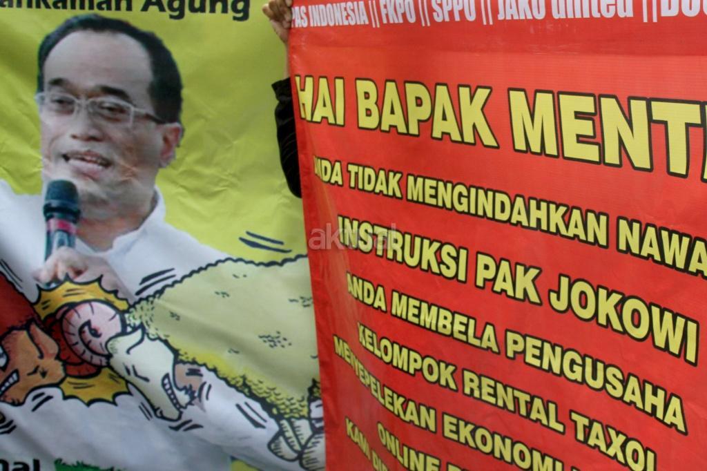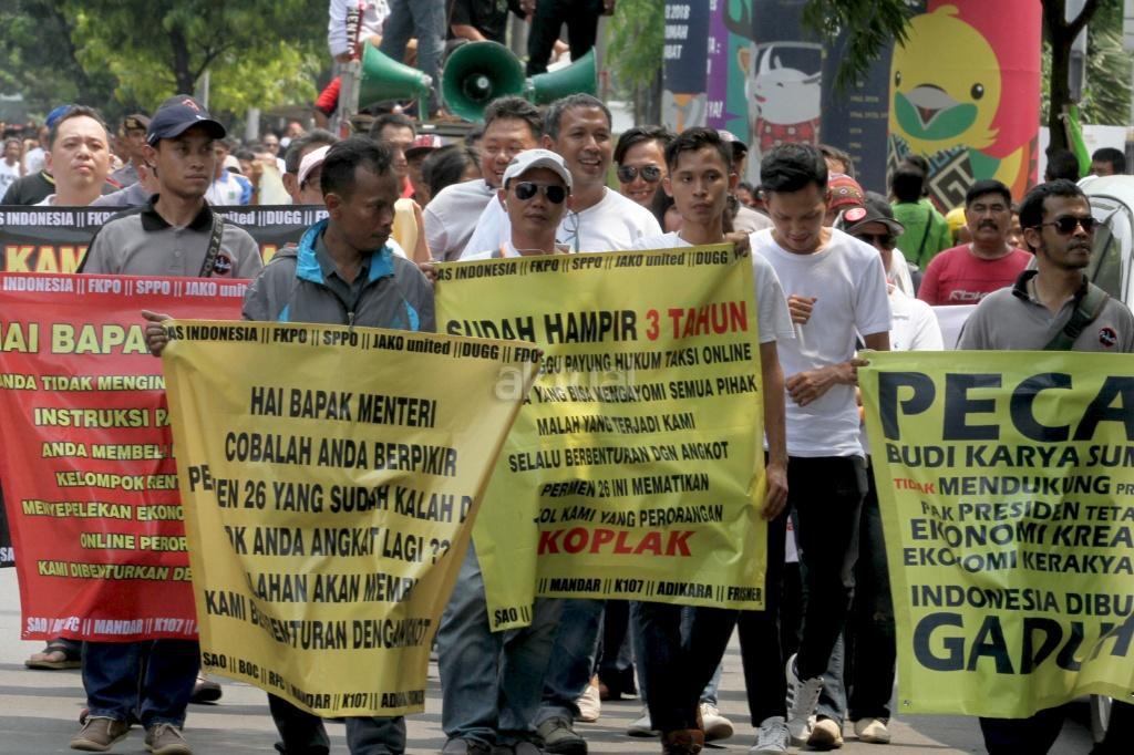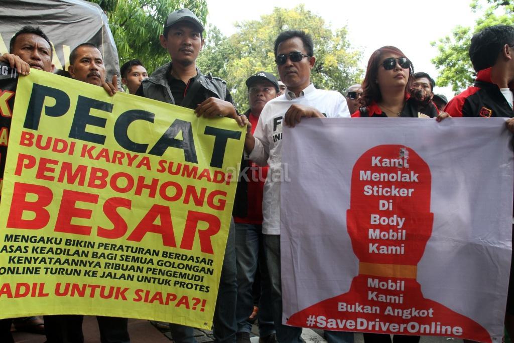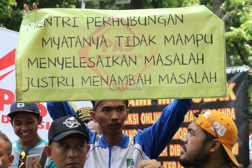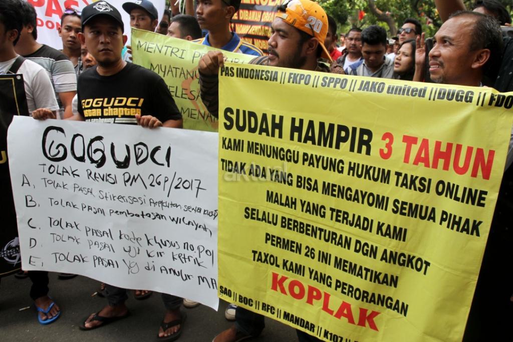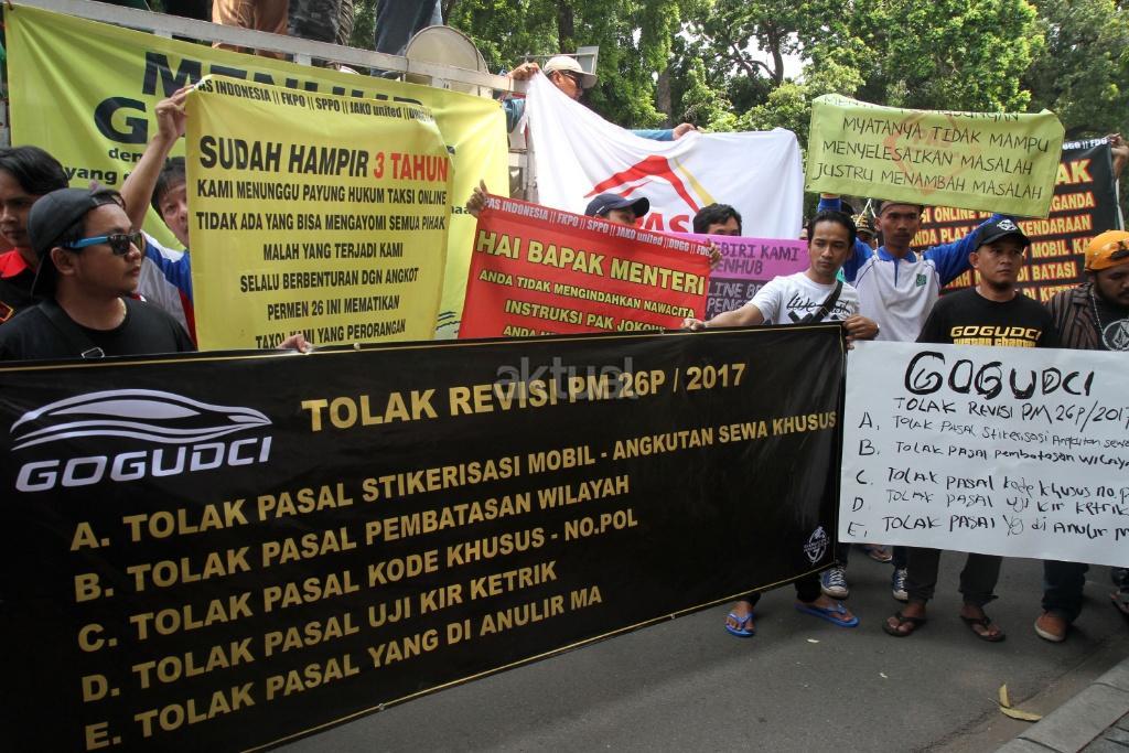 Sejumlah pengemudi ojek ‘online’ melakukan aksi di depan kantor Kemenhub, Jakarta, Rabu (25/10/2017). Mereka menuntut agar penggunaan stiker pada kendaraan sewa berbasis ‘online’ tidak diberlakukan dan menolak revisi Peraturan Menteri Perhubungan Nomor 26 tahun 2017 yang mengatur transportasi ‘online’. AKTUAL/Munzir