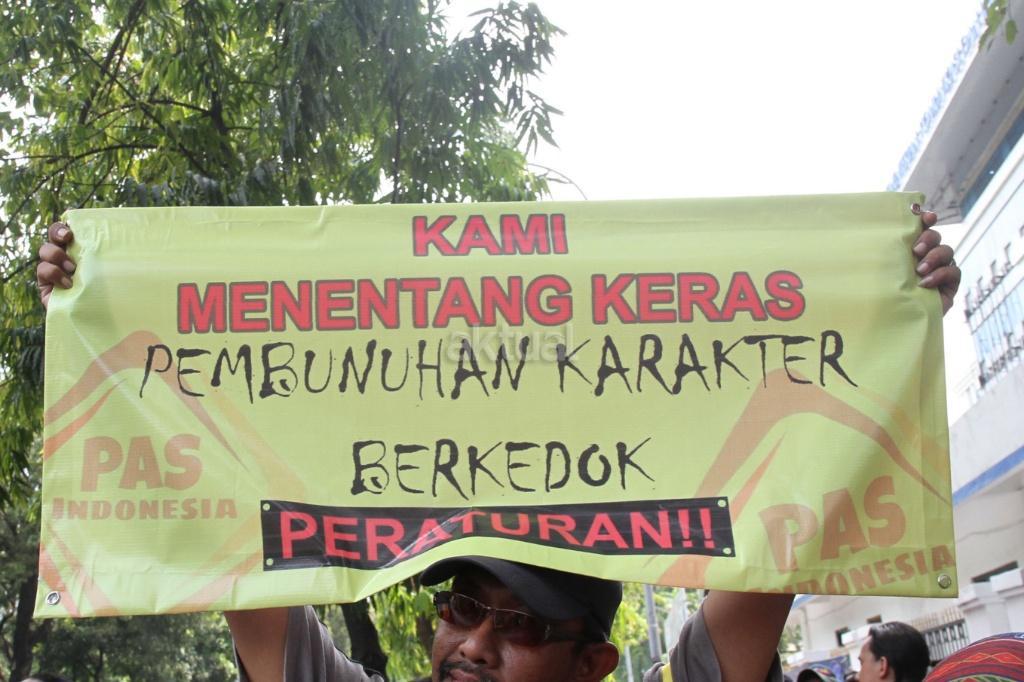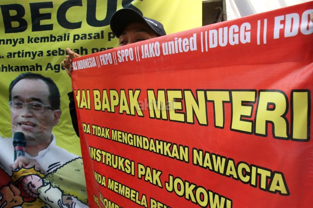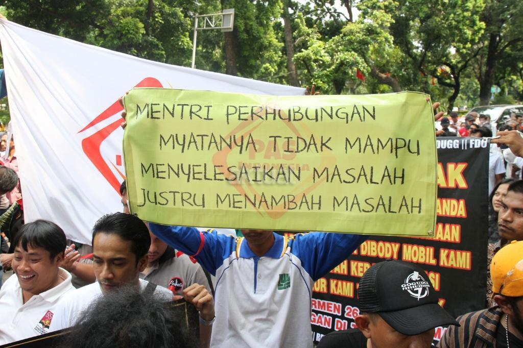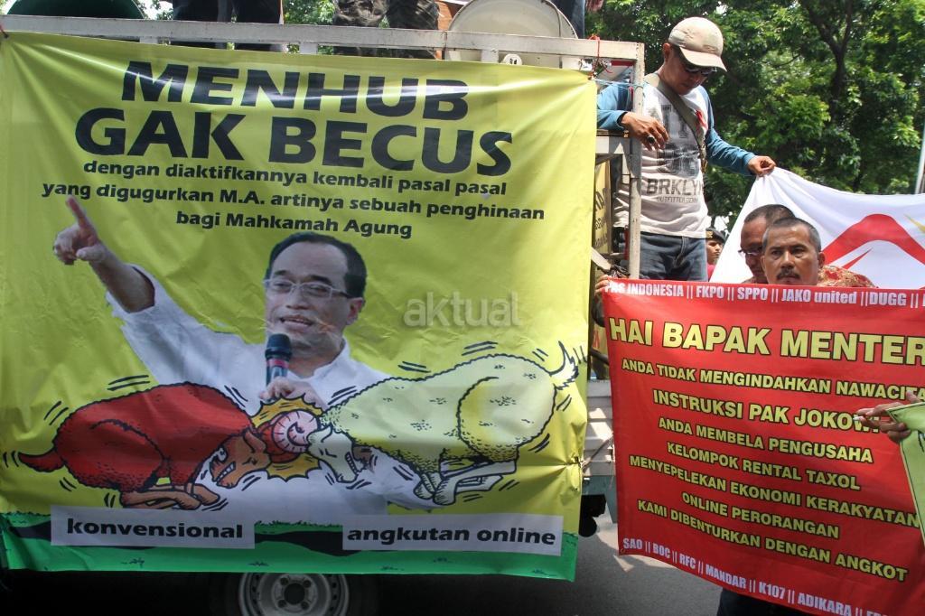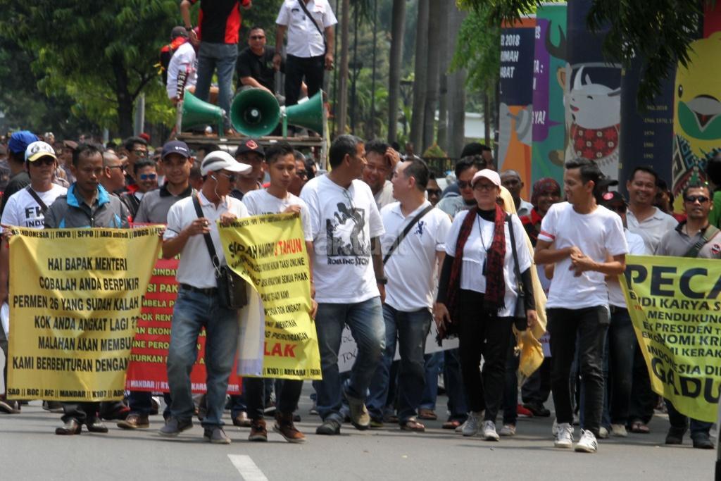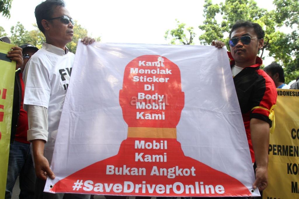 Sejumlah pengemudi ojek ‘online’ melakukan aksi di depan kantor Kemenhub, Jakarta, Rabu (25/10/2017). Mereka menuntut agar penggunaan stiker pada kendaraan sewa berbasis ‘online’ tidak diberlakukan dan menolak revisi Peraturan Menteri Perhubungan Nomor 26 tahun 2017 yang mengatur transportasi ‘online’. AKTUAL/Munzir