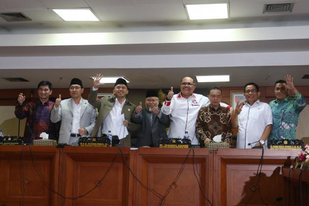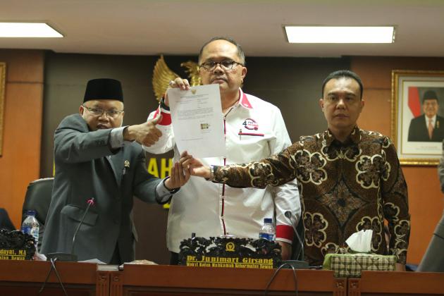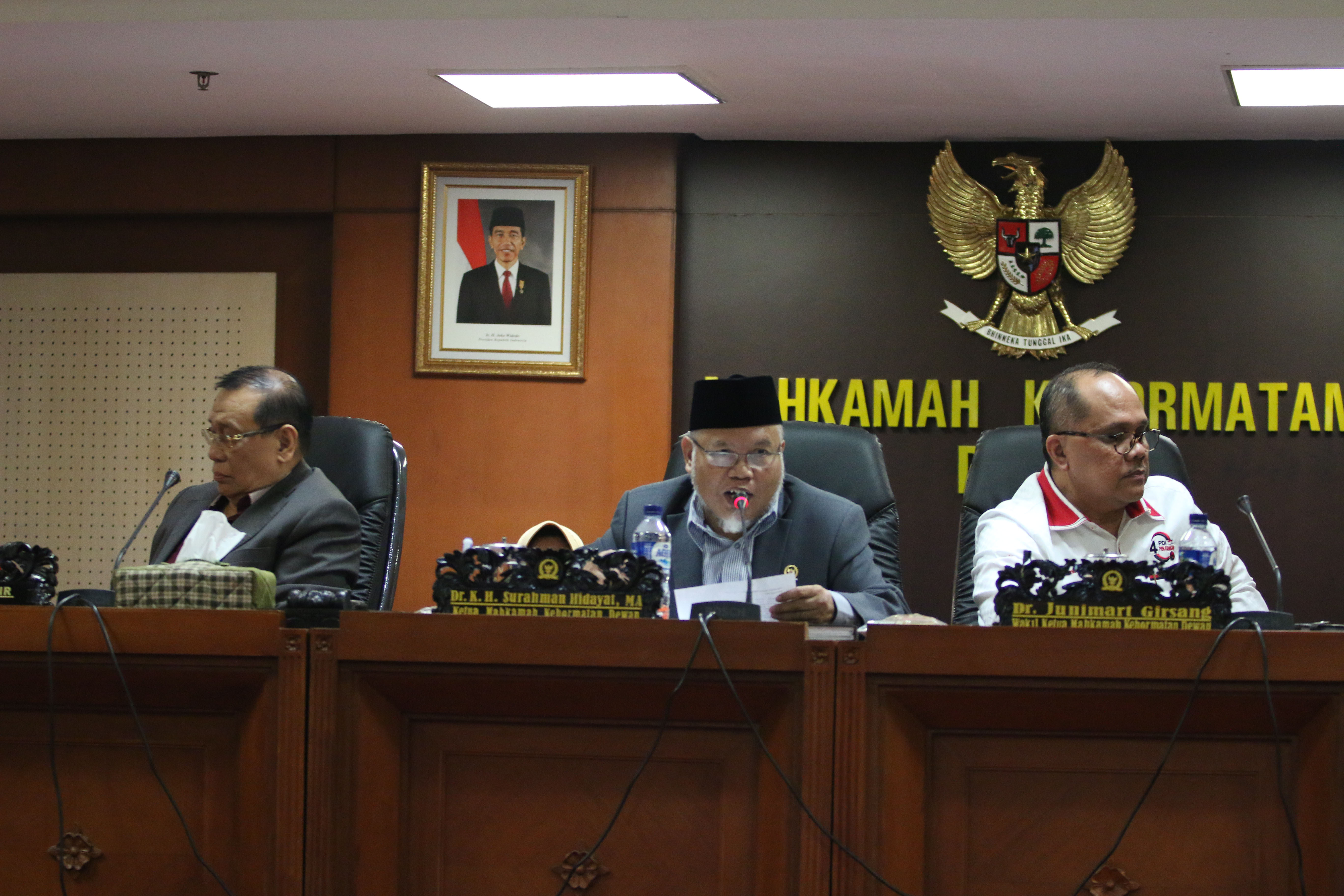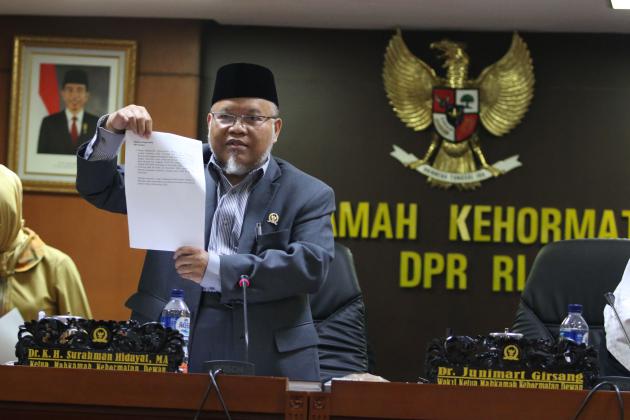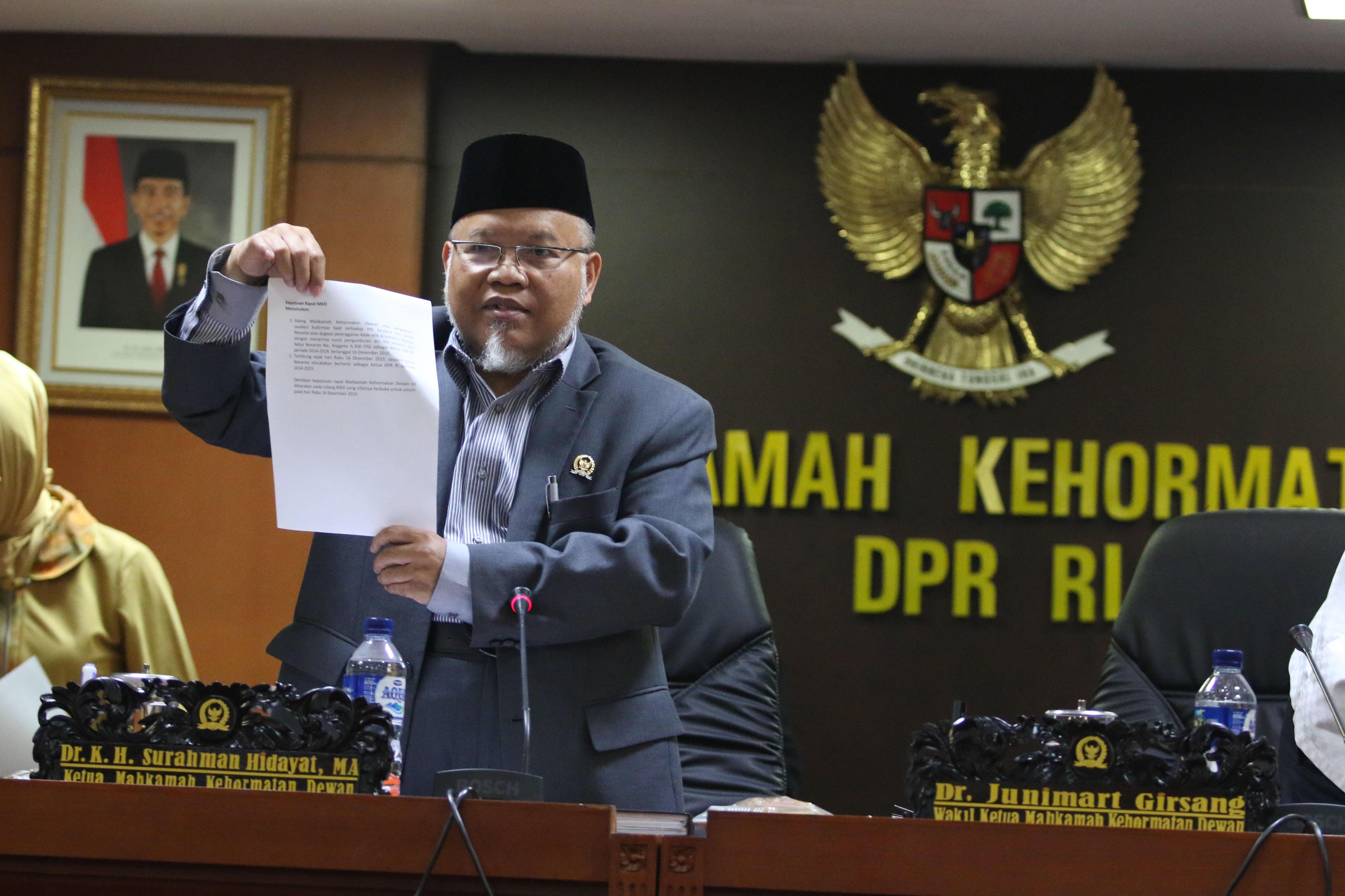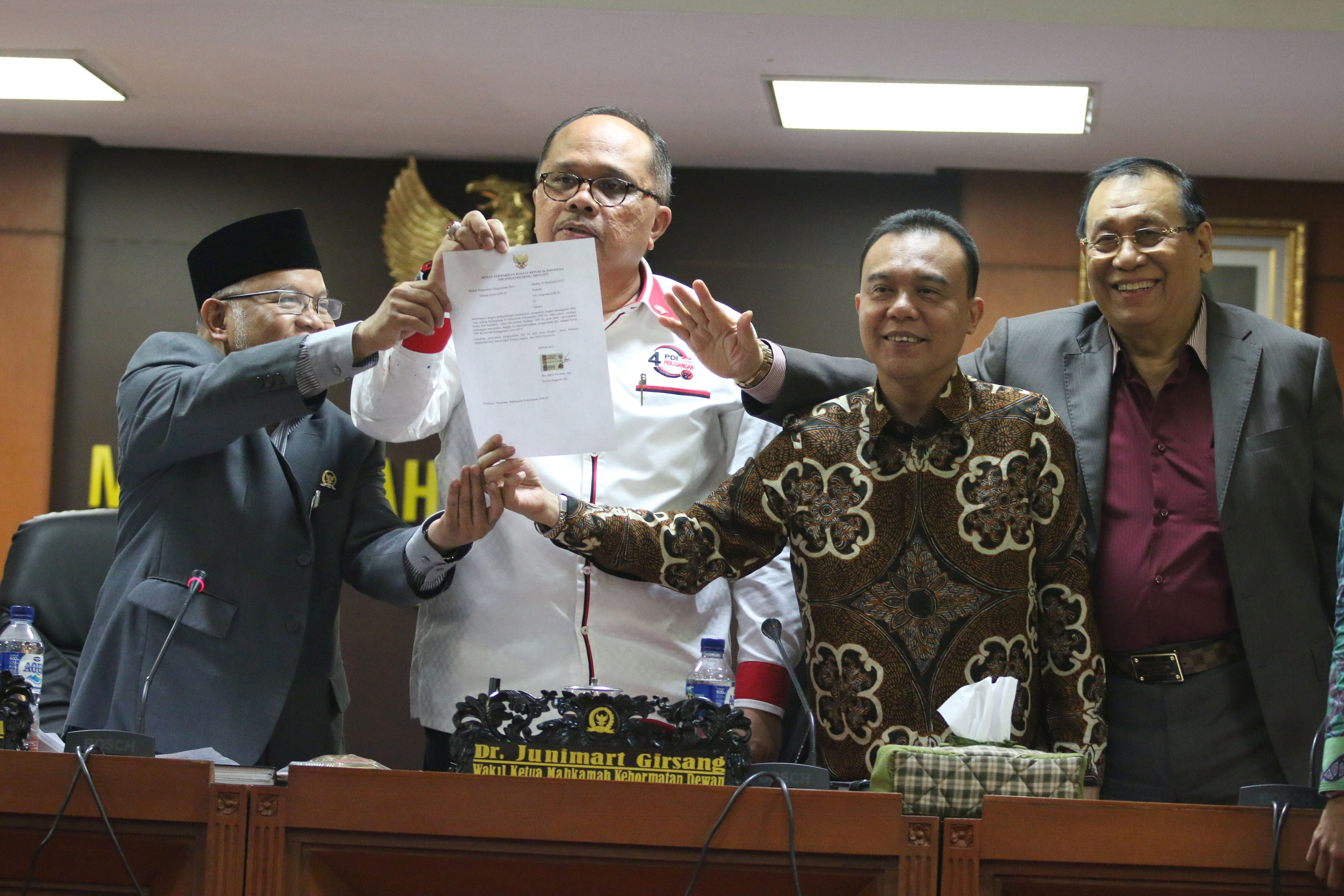 Pimpinan Majelis Kehormatan Dewan (MKD) Surahman Hidayat (tengah) bersama sejumlah Anggota MKD mengangkat tangan usai membacakan surat pengunduran diri di sidang MKD Komplek Parlemen Senayan, Jakarta, Rabu (16/12/2015) malam. Demi menciptakan ketenangan masyarakat maka dengan ini saya menyatakan mengundurkan diri sebagai Ketua DPR RI periode masa bakti 2014-2019, sebagian bunyi surat pengunduran diri setnov. sementara 10 anggota MKD memutuskan Novanto melakukan pelanggaran ringan sementara 7 anggota MKD melakukan pelanggaran berat. AKTUAL/Junaidi Mahbub