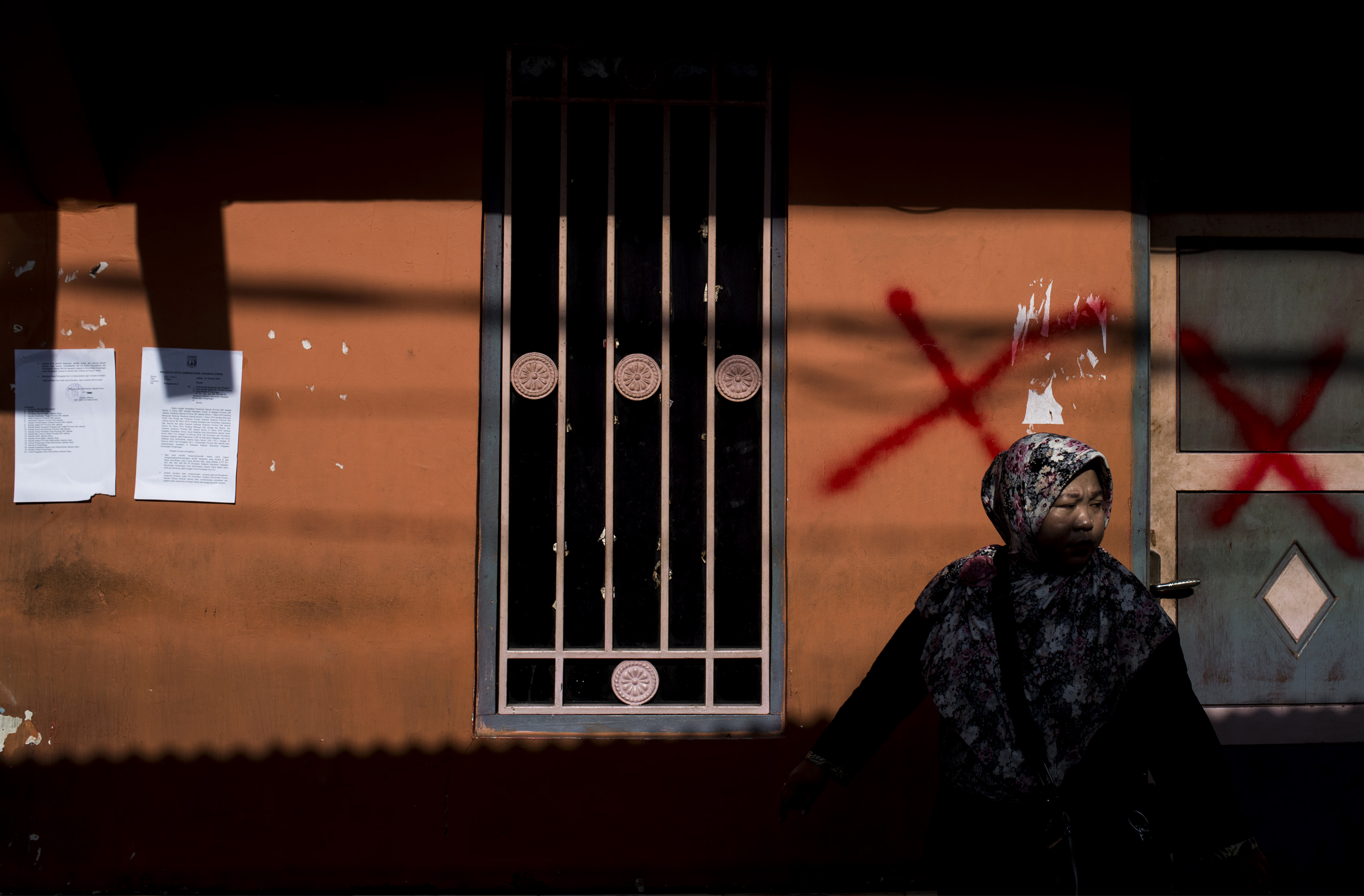 Warga melintas di depan bangunan cafe yang telah ditinggal pemiliknya di Kalijodo, Jakarta, Kamis (25/2). Pemerintah Kota Jakarta Barat dan Jakarta Utara telah menggeluarkan surat peringatan kedua (SP2) kepada warga Kalijodo untuk segera mengosongkan dan meninggalkan kawasan itu dalam waktu tiga hari ke depan. ANTARA FOTO/Sigid Kurniawan/foc/16.