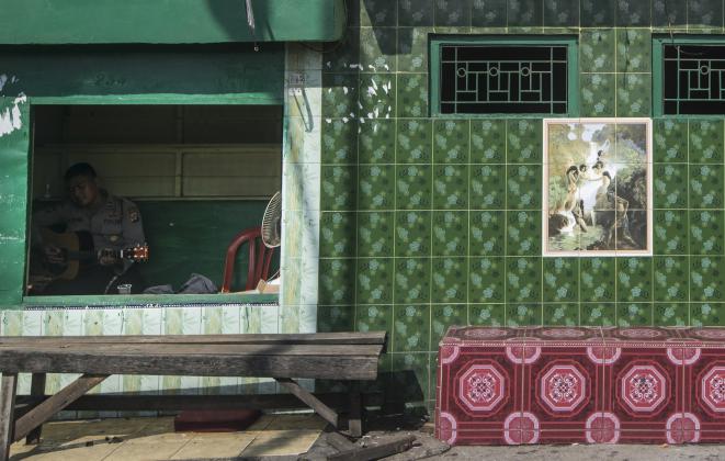 Seorang polisi bermain gitar di salah satu bangunan cafe yang telah ditinggal pemiliknya di Kalijodo, Jakarta, Kamis (25/2). Pemerintah Kota Jakarta Barat dan Jakarta Utara telah menggeluarkan surat peringatan kedua (SP2) kepada warga Kalijodo untuk segera mengosongkan dan meninggalkan kawasan itu dalam waktu tiga hari ke depan. ANTARA FOTO/Sigid Kurniawan/foc/16.