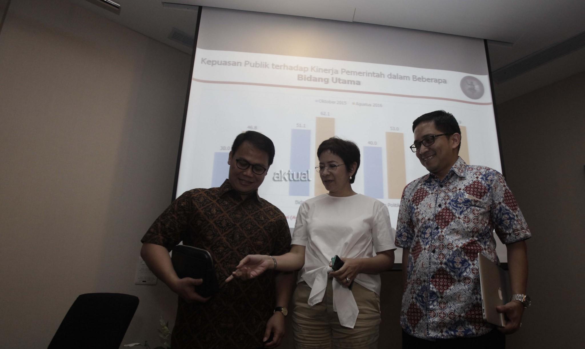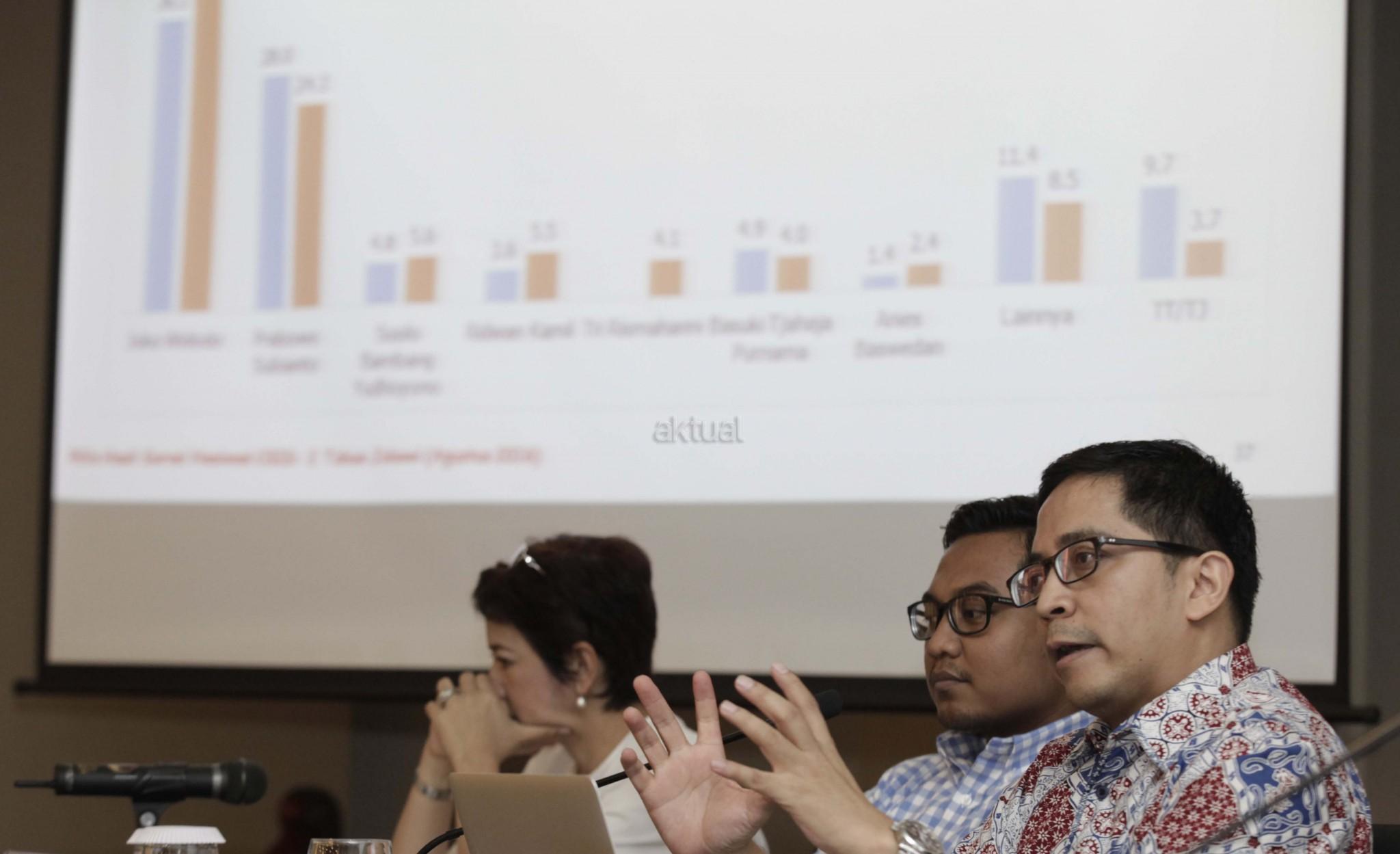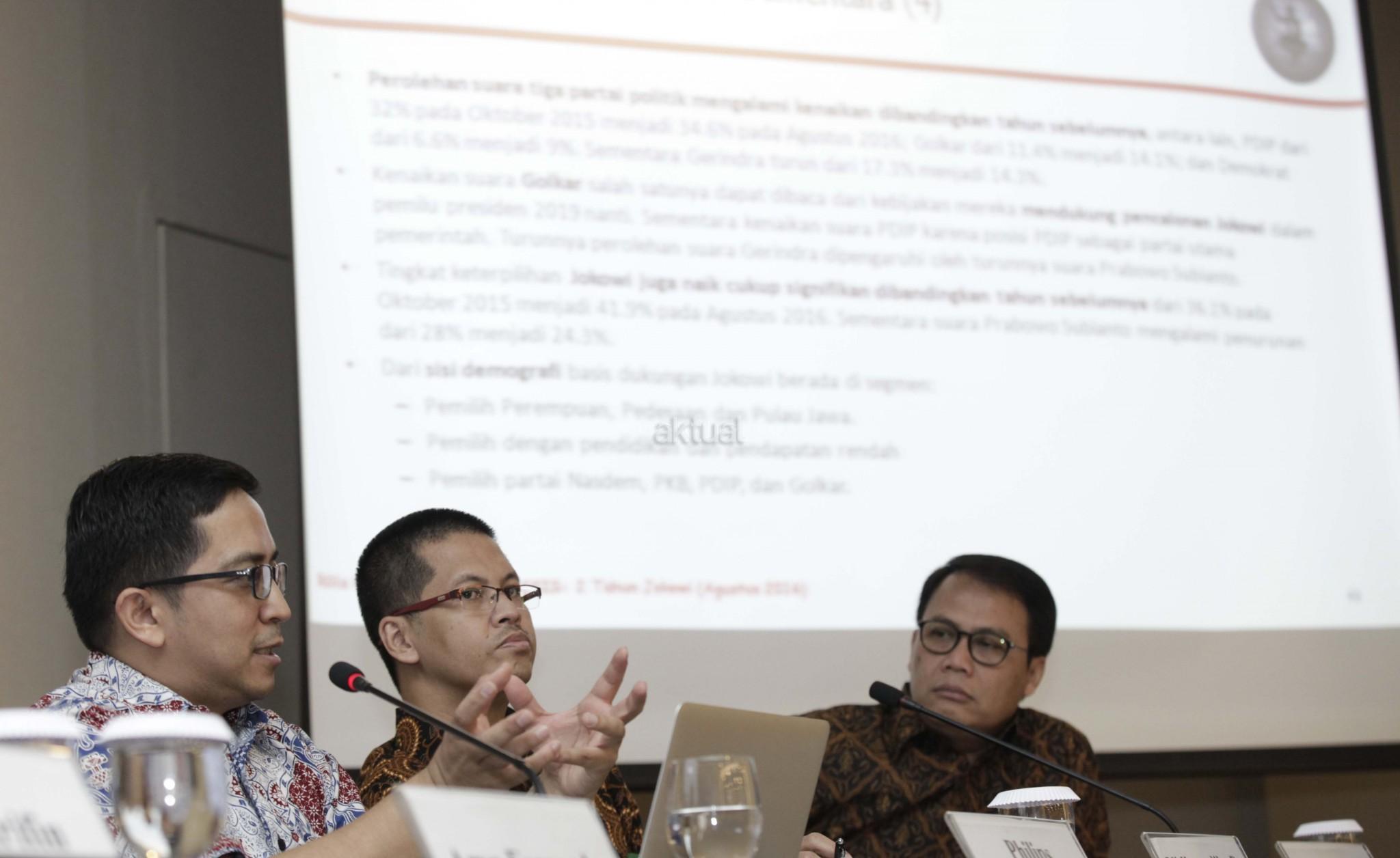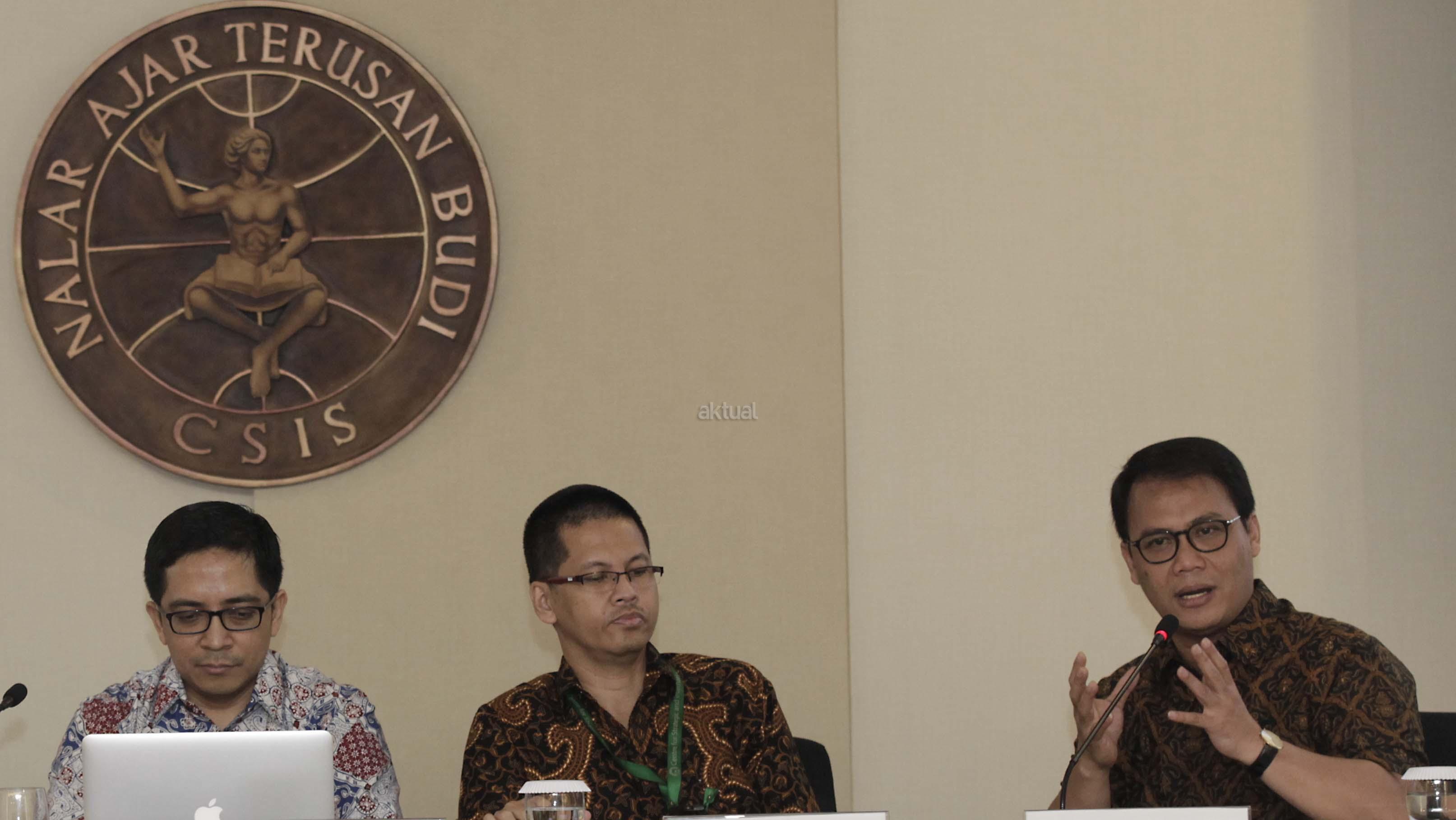 Dari kanan ke kiri, Politisi PDIP Ahmad Basarah, Ketua Departemen Politik dan Hubungan International CSIS Vidhyandika Perkasa, Direktur Eksekutif CSIS Philips J Vermonte, Peneliti CSIS Arya Vernandes dan Politisi Partai Golkar Nurul Arifin saat menjadi pembicara rilis hadil survei dua tahun pemerintahan Jokowi-JK dan Konsolidasi Kekuasaan serta Dinamika Elektoral di Jakarta, Selasa (13/9). Masyarakat berpendidikan tinggi dinilai banyak yang tak puas dengan kinerja pemerintah Joko Widodo – Jusuf Kalla. Secara umum, tingkat ketidakpuasan masyarakat sebesar 32,8 persen. AKTUAL/TINO OKTAVIANO