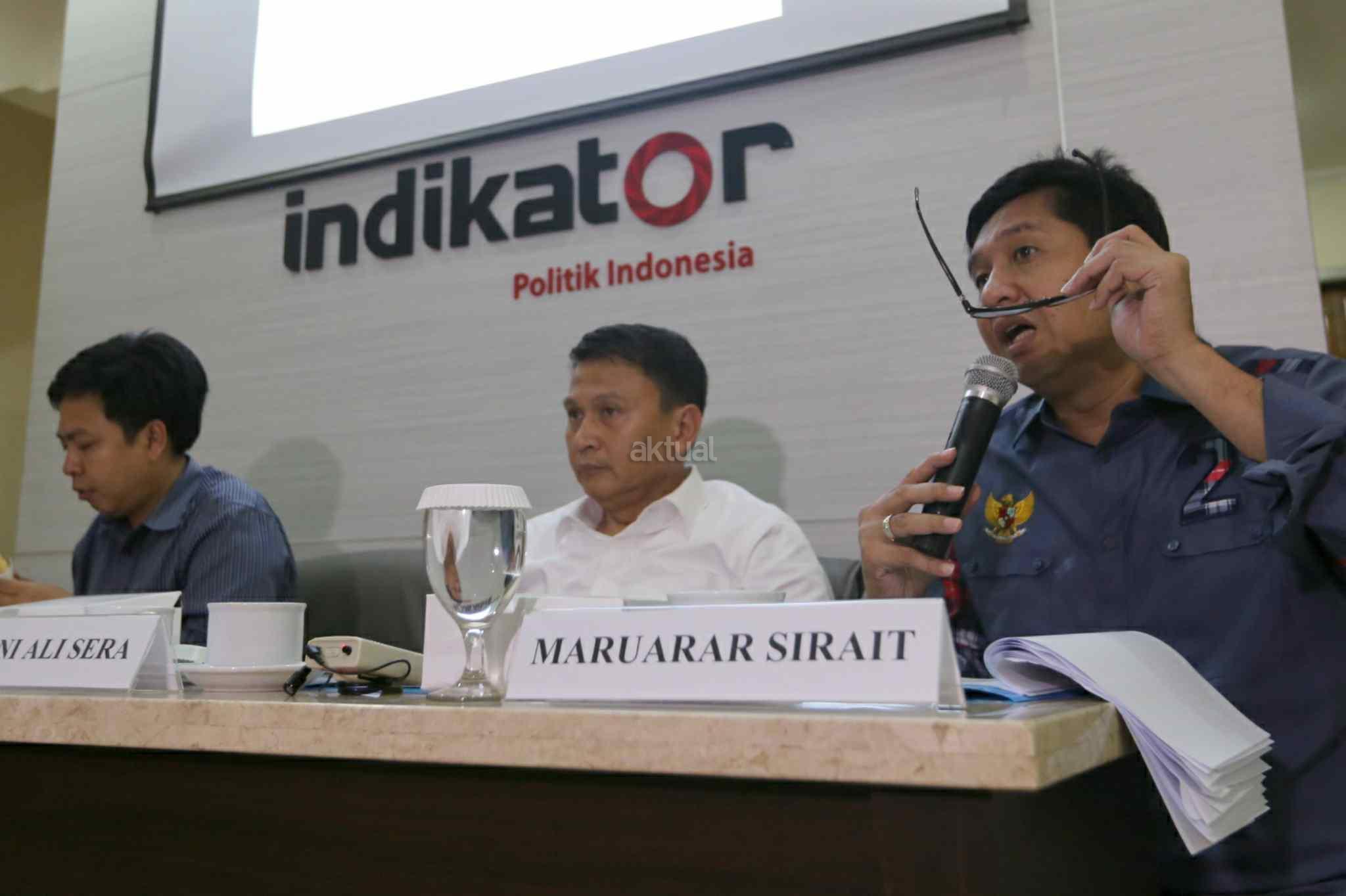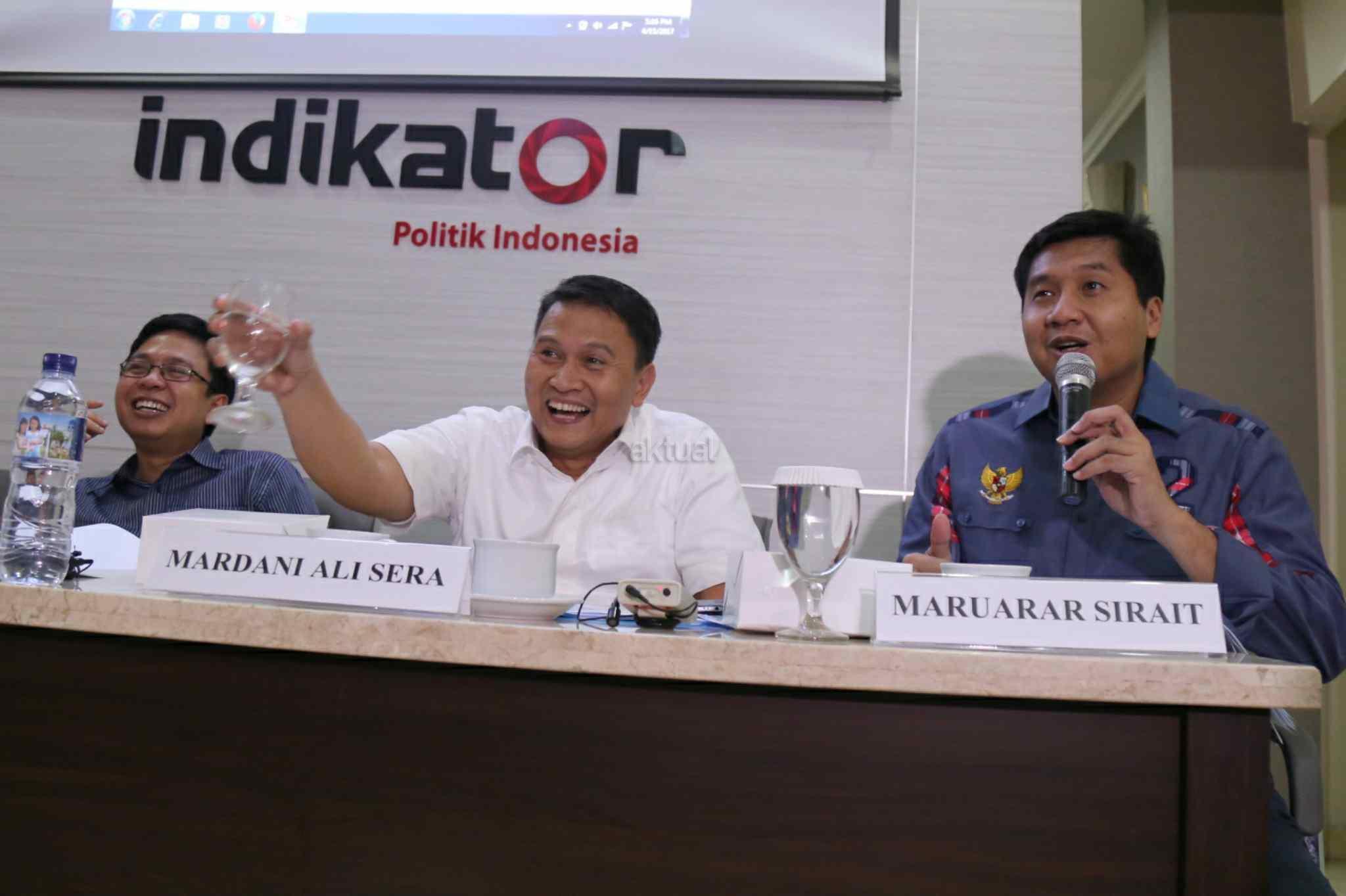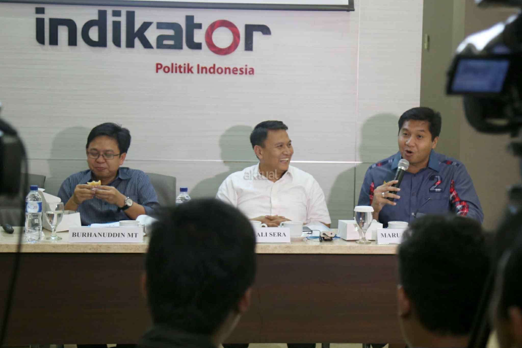 Ketua Tim Pemenangan Anies-Sandi, Mardani Ali Sera, Ketua Tim Pemenangan Ahok-Djarot, Maruarar Sirait dan Direktur Eksekutif Indikator Politik Indonesia, Burhanuddin Muhtadi saat konpres di kantor Indikator, Cikini, Jakarta Pusat, Sabtu (15/4/2017). Lembaga survei Indikator memaparkan hasil elektabilitas Cagub-Cawagub DKI jelang pencoblosan. Hasilnya, Anies Baswedan-Sandiaga Uno memperoleh 48,2 persen dan Basuki Tjahaja Purnama (Ahok)-Djarot Saiful Hidayat 47,4 persen. Survei dilakukan pada 12-14 April 2017 menggunakan metode stratified systematic sampling. Awalnya survei ini menargetkan 1.000 orang. Namun yang berhasil diwawancara hanya sebanyak 495 responden. AKTUAL/Tino Oktaviano