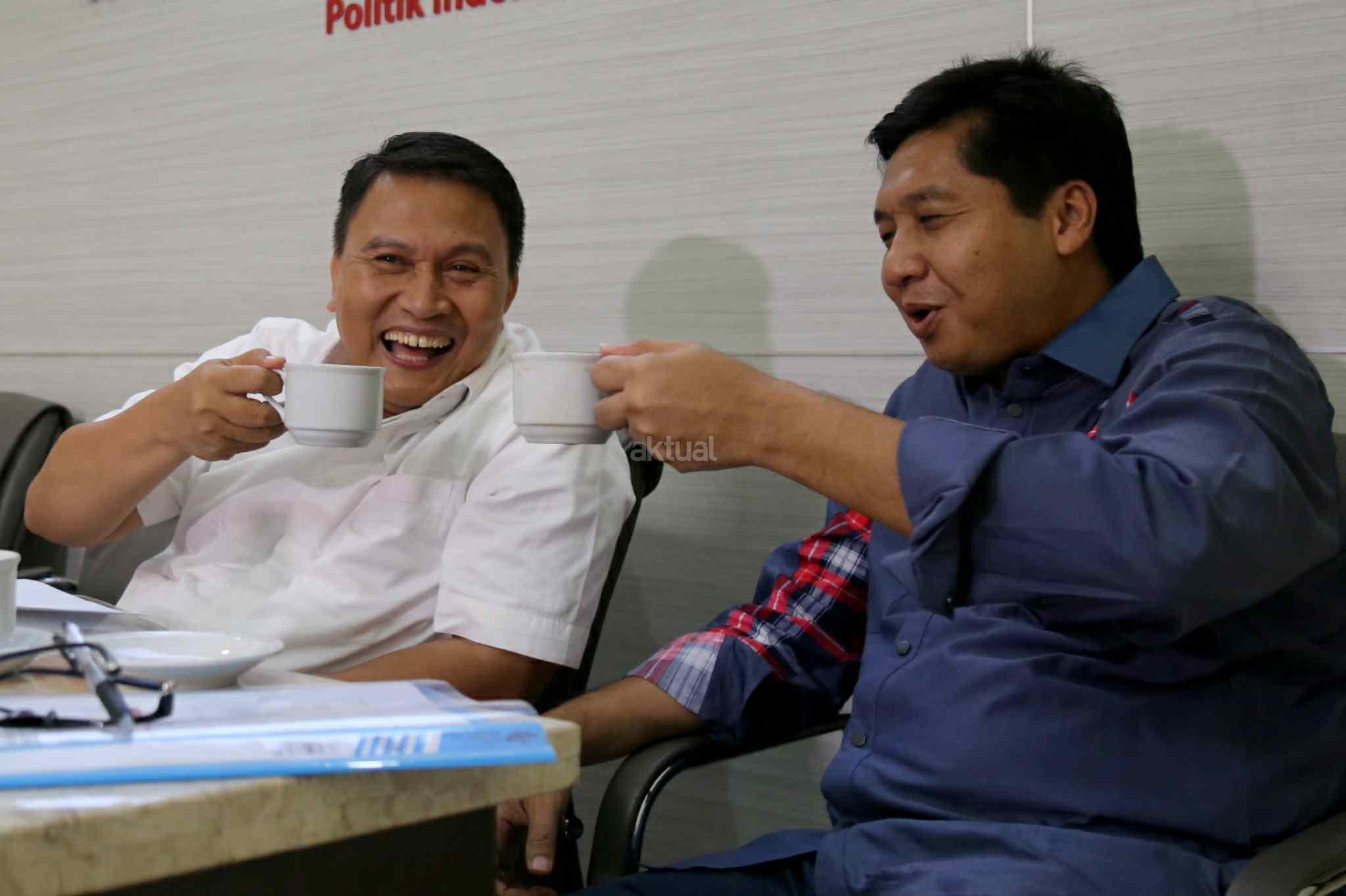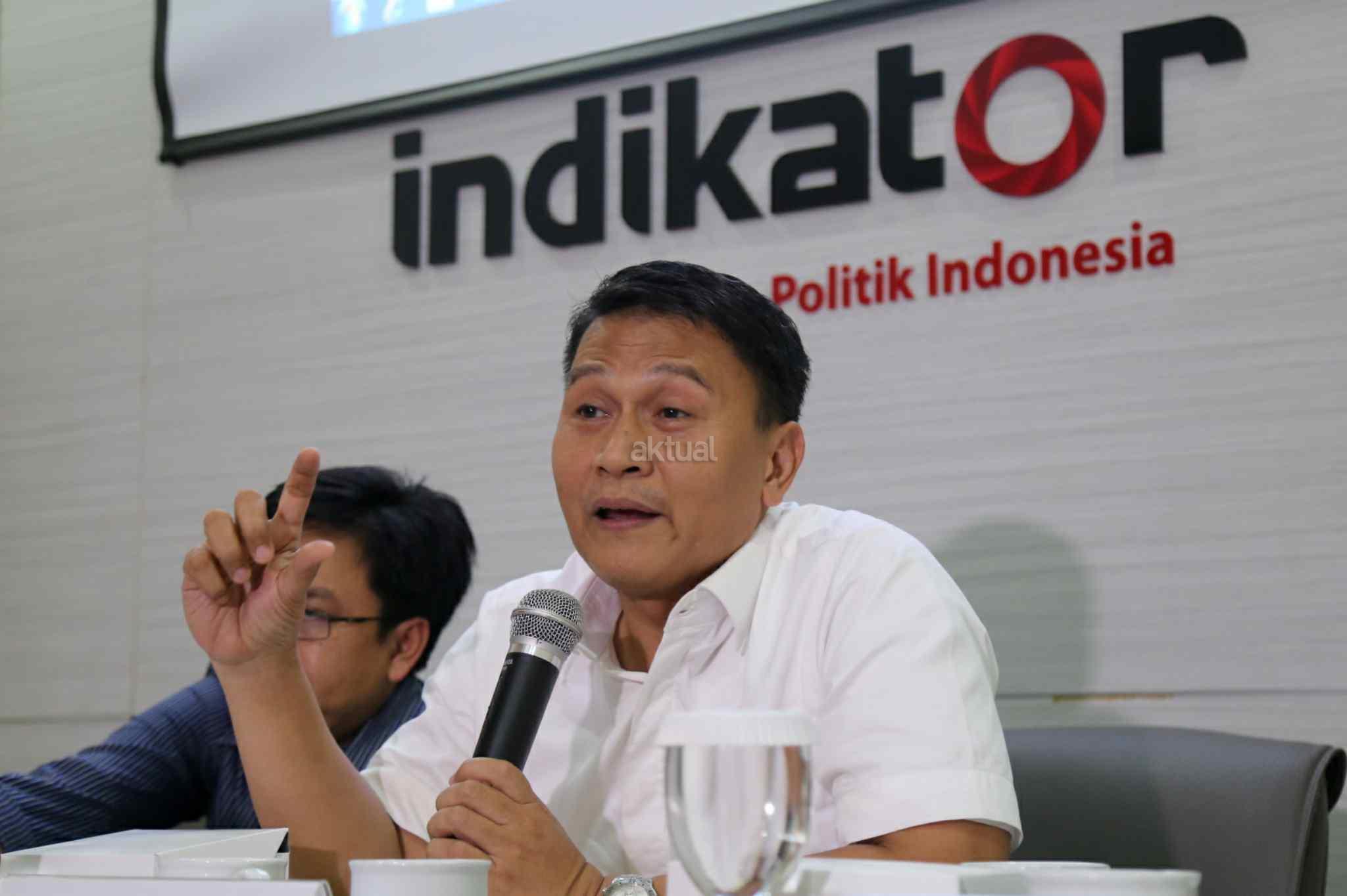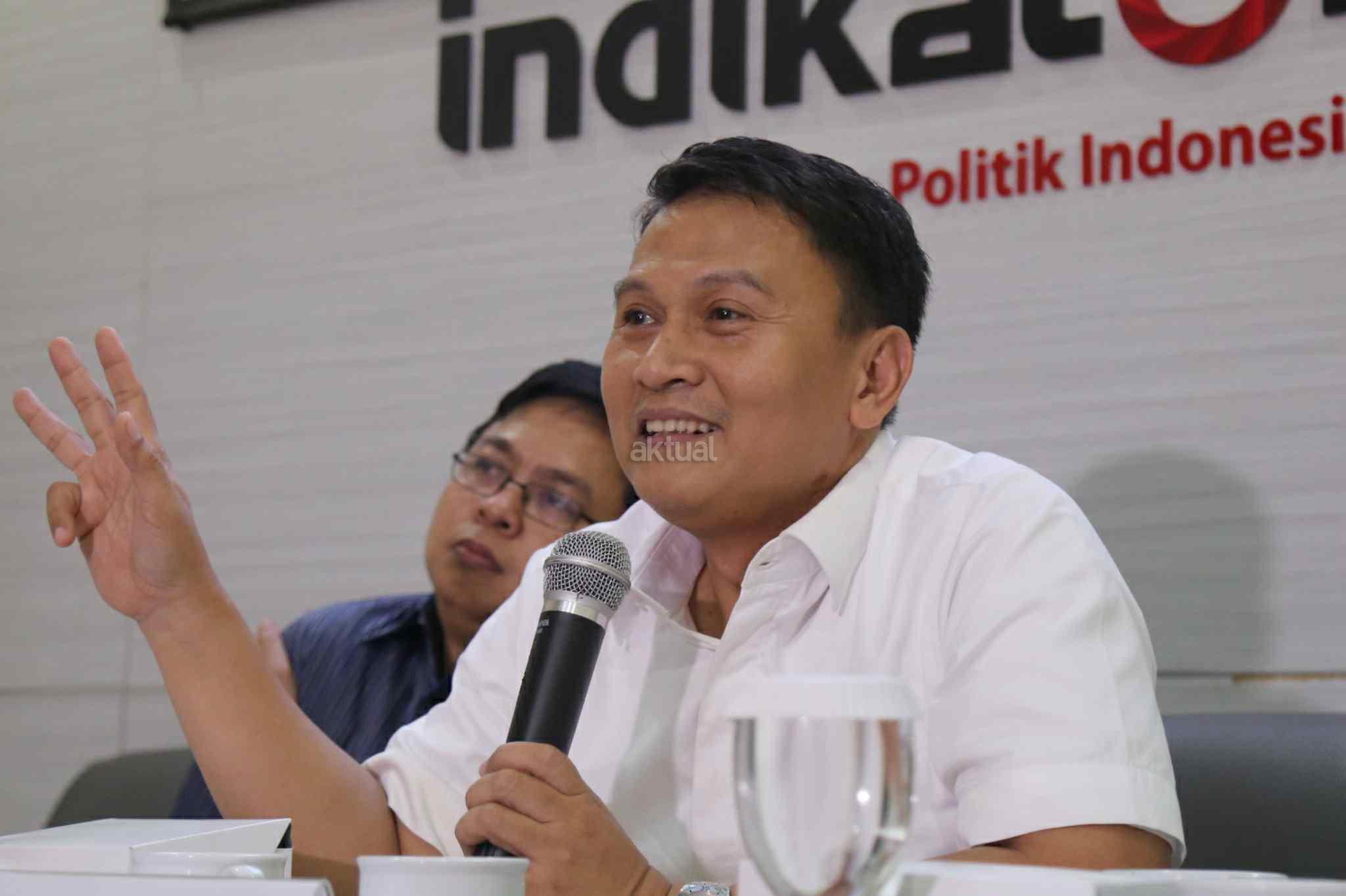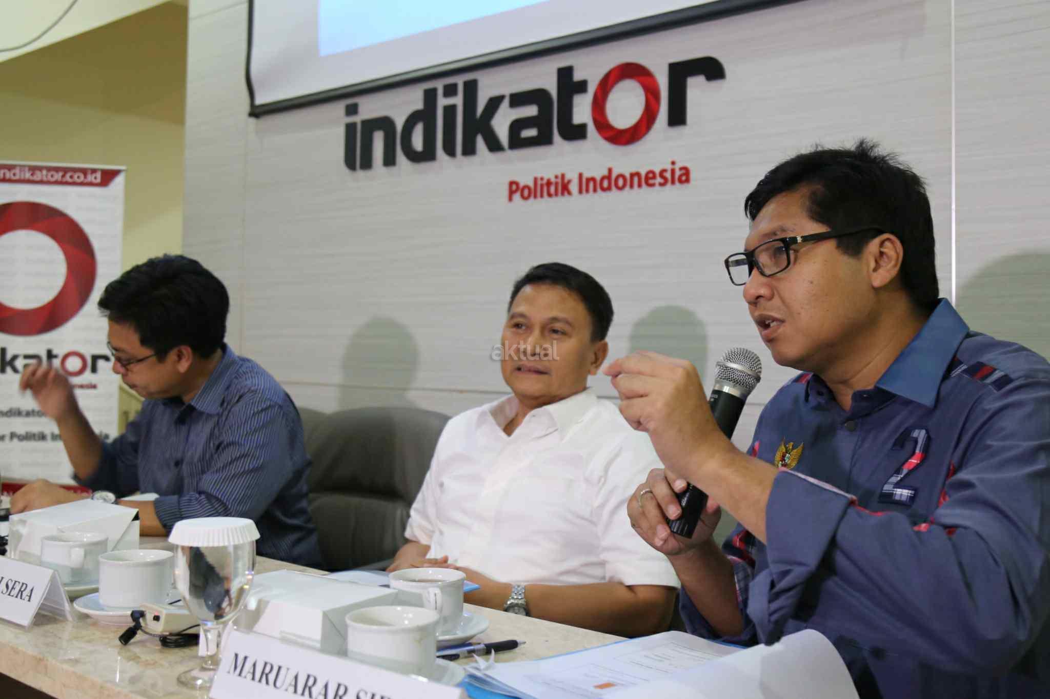 Ketua Tim Pemenangan Anies-Sandi, Mardani Ali Sera, Ketua Tim Pemenangan Ahok-Djarot, Maruarar Sirait dan Direktur Eksekutif Indikator Politik Indonesia, Burhanuddin Muhtadi saat konpres di kantor Indikator, Cikini, Jakarta Pusat, Sabtu (15/4/2017). Lembaga survei Indikator memaparkan hasil elektabilitas Cagub-Cawagub DKI jelang pencoblosan. Hasilnya, Anies Baswedan-Sandiaga Uno memperoleh 48,2 persen dan Basuki Tjahaja Purnama (Ahok)-Djarot Saiful Hidayat 47,4 persen. Survei dilakukan pada 12-14 April 2017 menggunakan metode stratified systematic sampling. Awalnya survei ini menargetkan 1.000 orang. Namun yang berhasil diwawancara hanya sebanyak 495 responden. AKTUAL/Tino Oktaviano