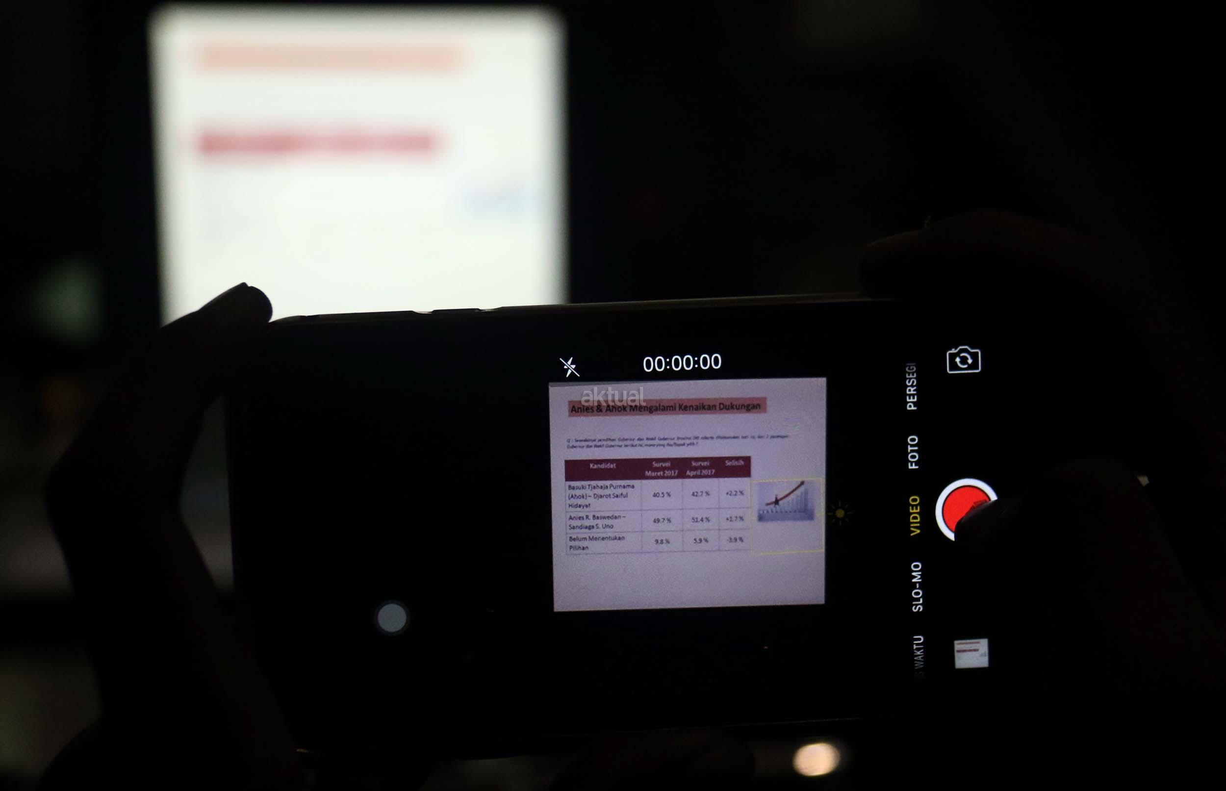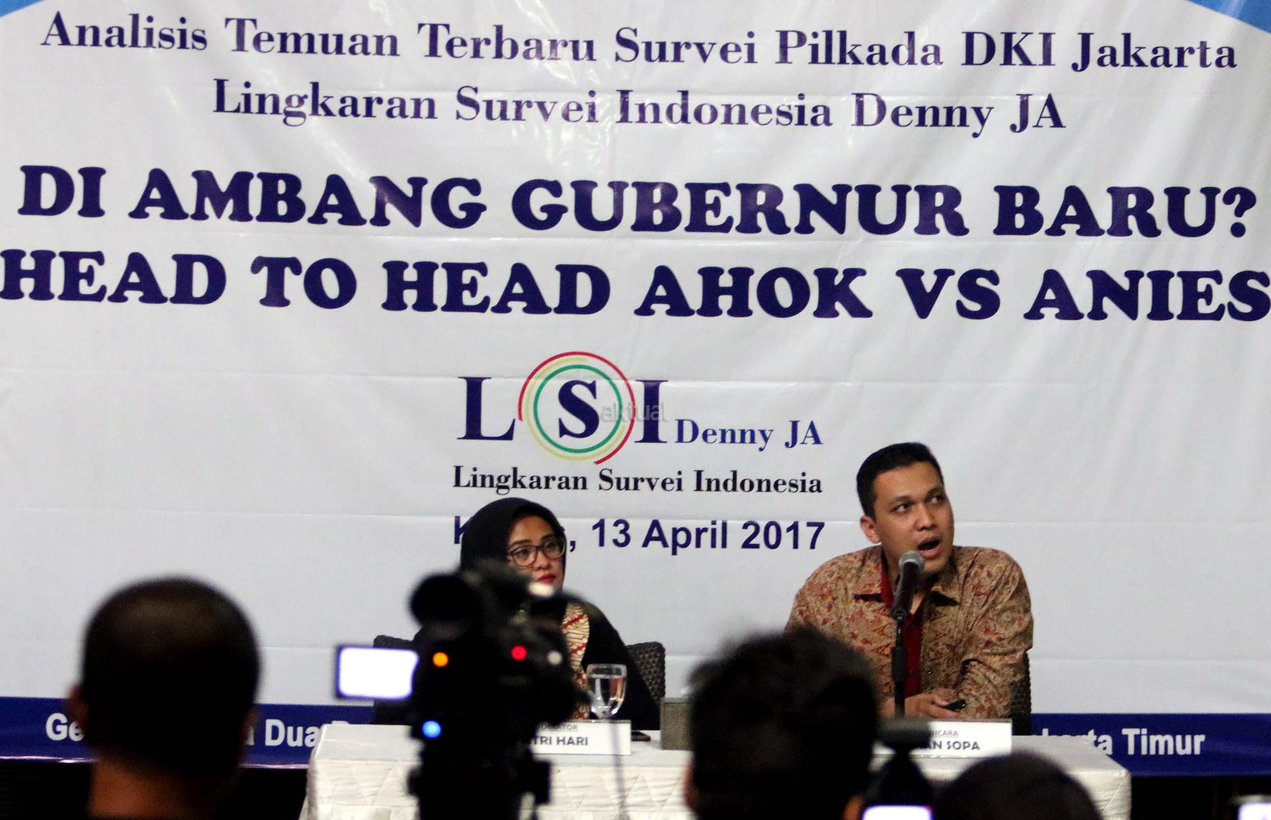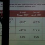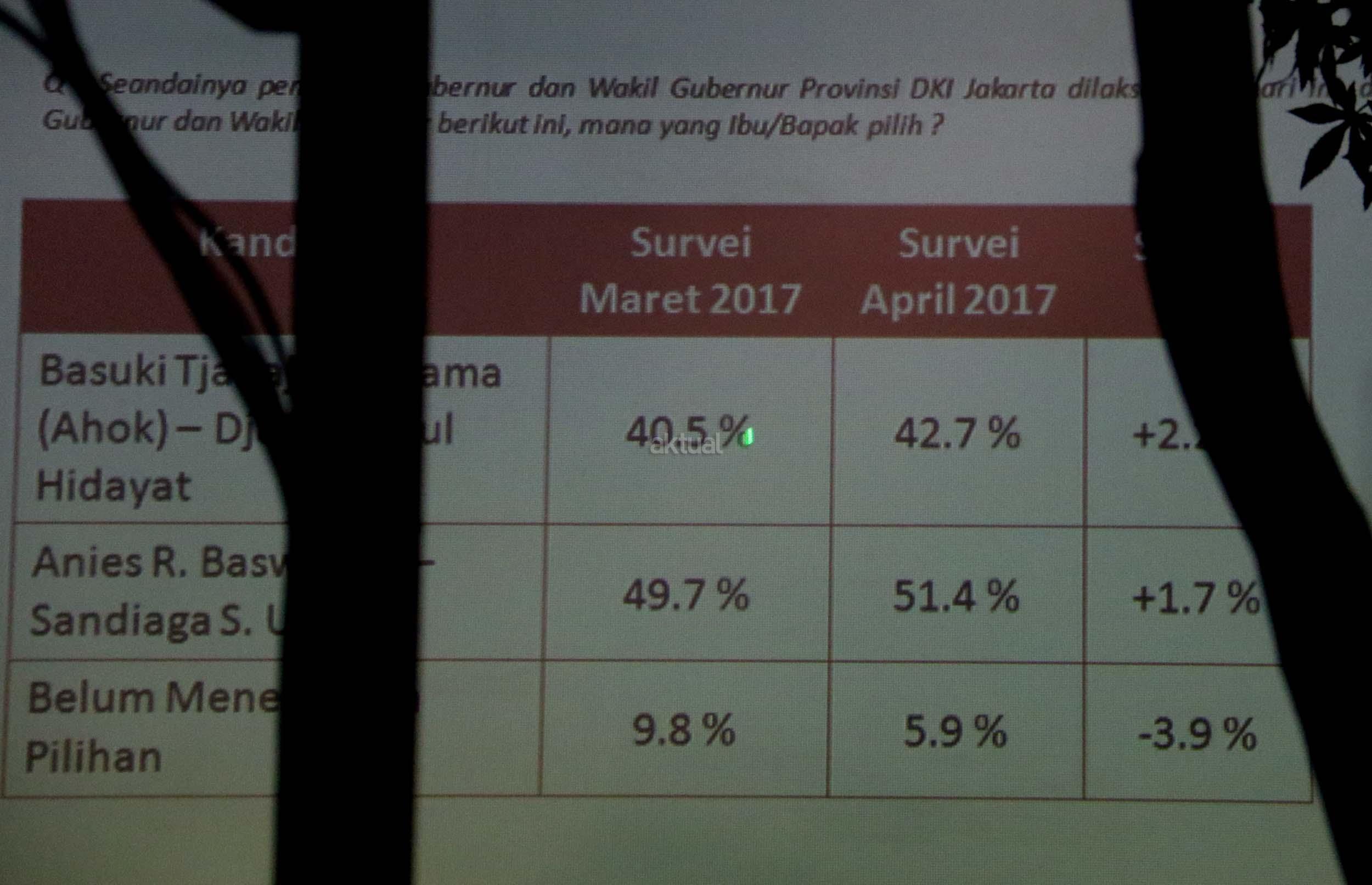 Berdasarkan survei LSI terhadap 440 responden pada 7-10 April 2017, Anies-Sandi mengantongi elektabilitas 51,4 persen dan hasilnya, pasangan Anies-Sandiaga unggul telak atas petahana Ahok-Djarot. AKTUAL/Munzir