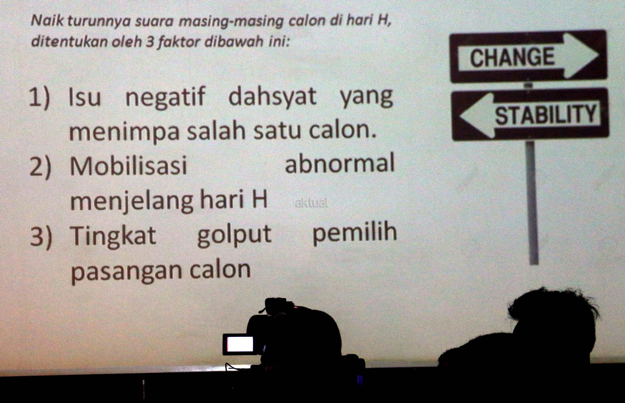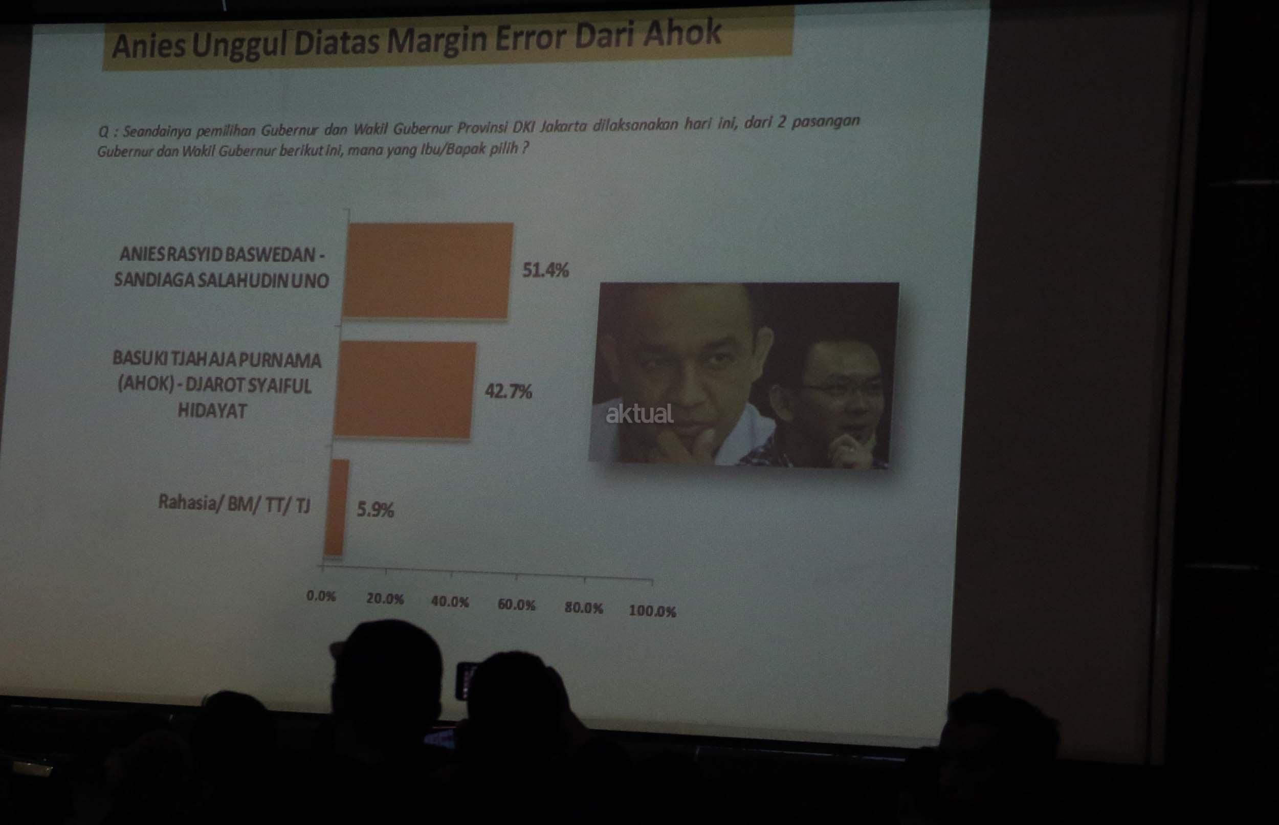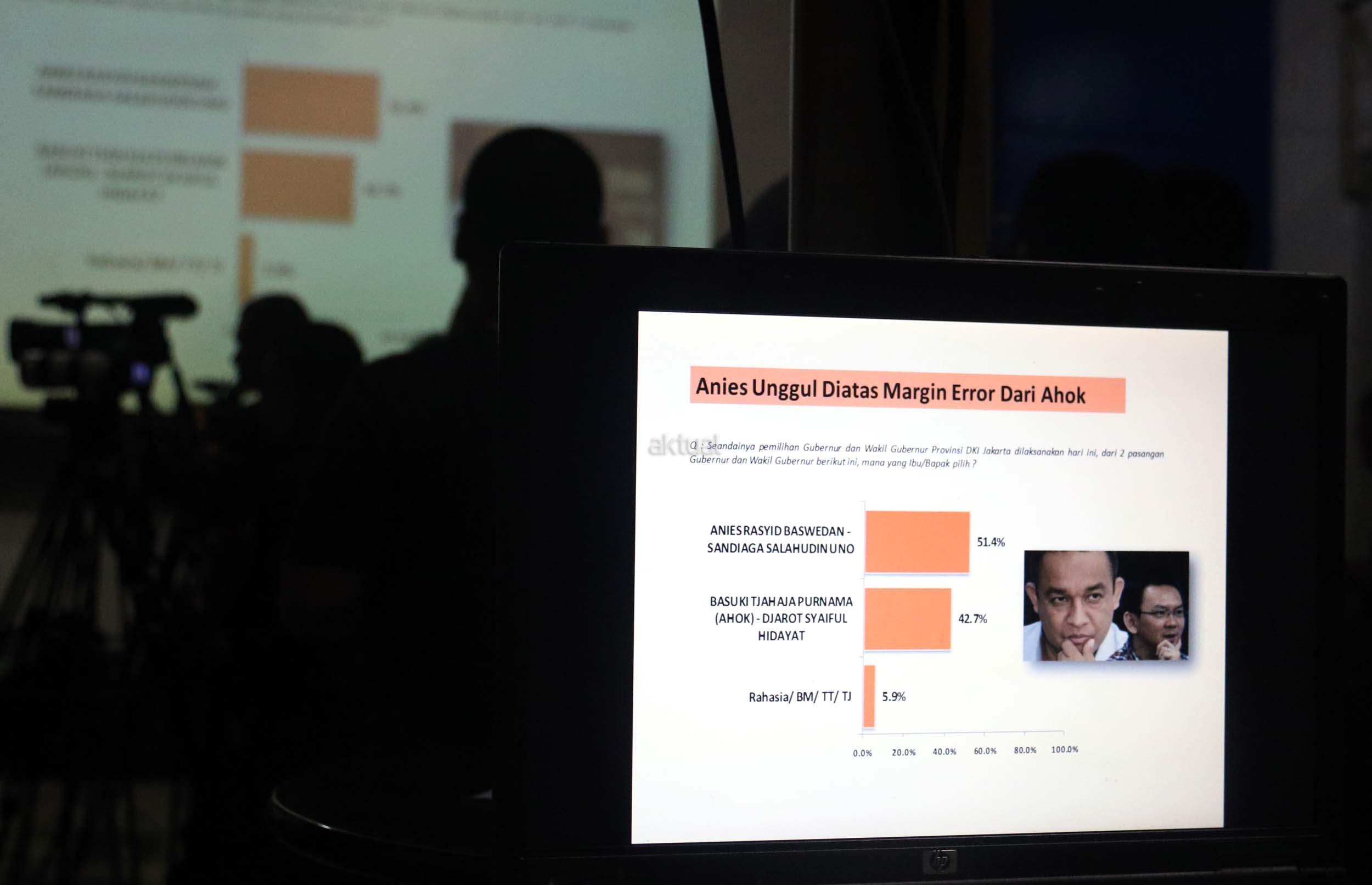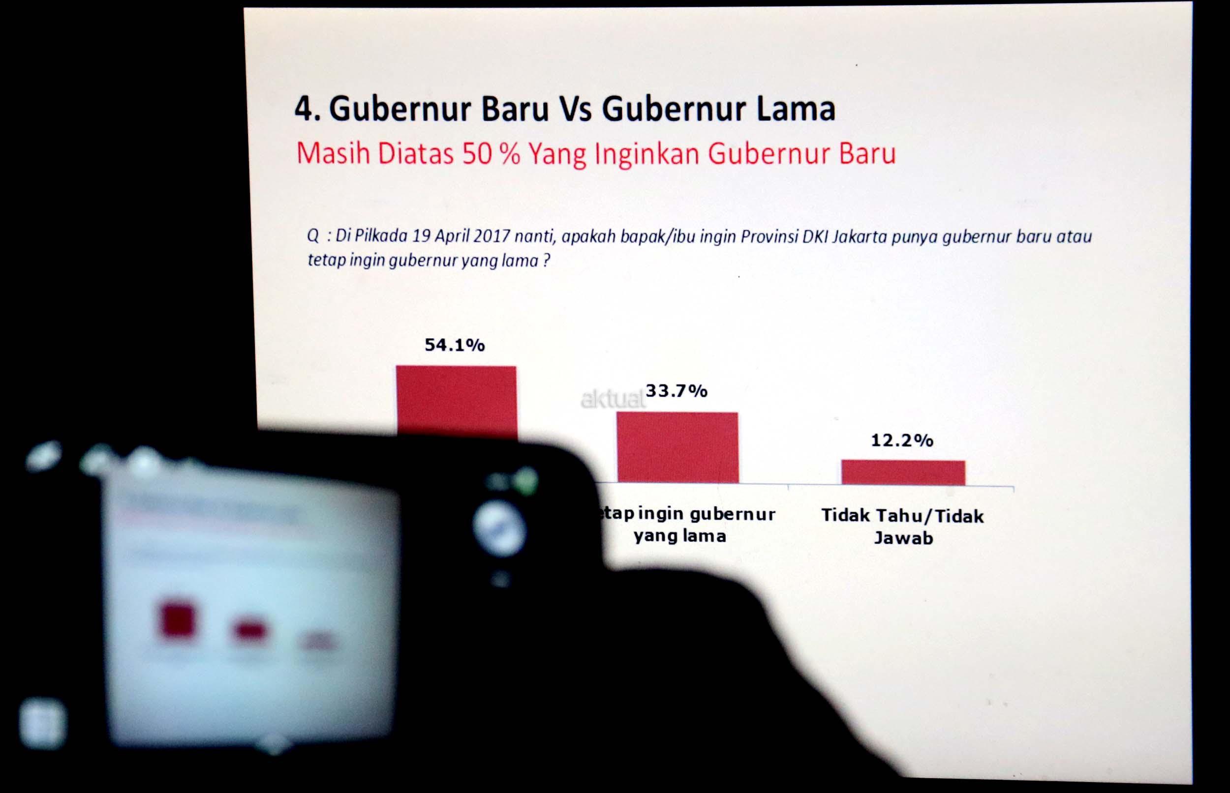 Berdasarkan survei LSI terhadap 440 responden pada 7-10 April 2017, Anies-Sandi mengantongi elektabilitas 51,4 persen dan hasilnya, pasangan Anies-Sandiaga unggul telak atas petahana Ahok-Djarot. AKTUAL/Munzir