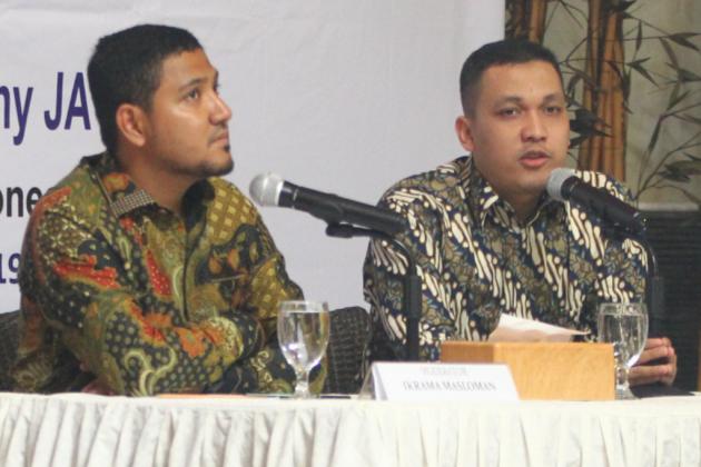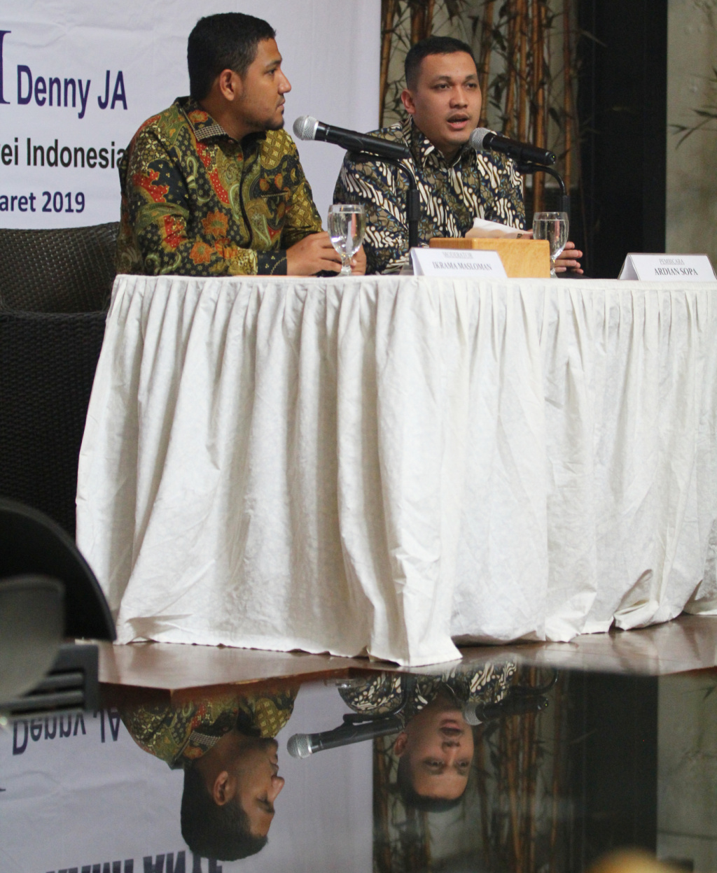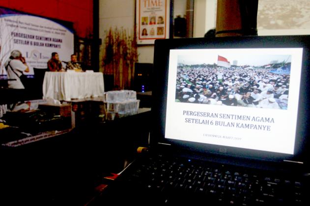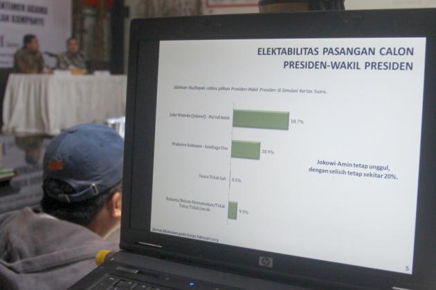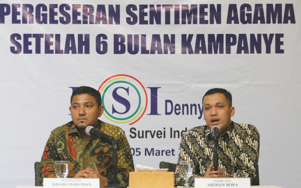 Peneliti LSI Denny JA, Ardian Sopa (kiri) didampingi Ikrama Masloman melansir survei terkini bertajuk 'Pergeseran Sentimen Agama Setelah 6 Bulan Kampanye', di kantor LSI di Rawamangun, Jakarta, Selasa (5/3). Salah satu hasil survei menyebutkan elektabilitas Jokowi-Ma'ruf meraih 58,7 persen, mengungguli Prabowi-Sandiaga Uno yang hanya mendapat 30,9 persen. Sementara suara yang belum memilih sebanyak 9,9 persen. AKTUAL/Tino Oktaviano
