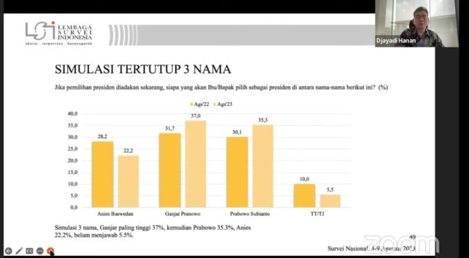 “Simulasi 3 nama, Ganjar paling tinggi 37 persen, kemudian Prabowo 35,3 persen, Anies 22,2 persen dan belum menjawab 5,5 persen,” kata Direktur Eksekutif LSI Djayadi Hanan saat memaparkan hasil surveinya.