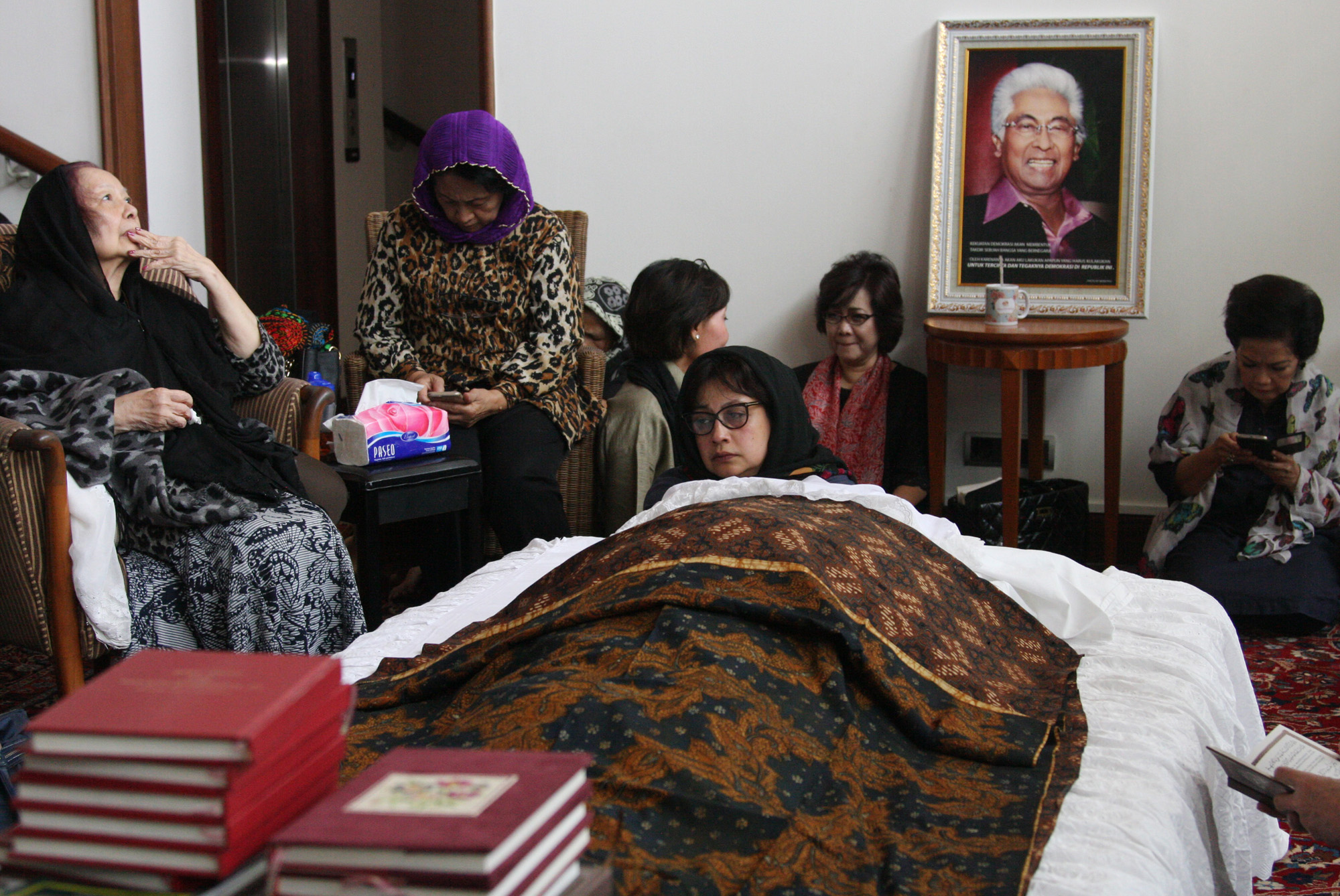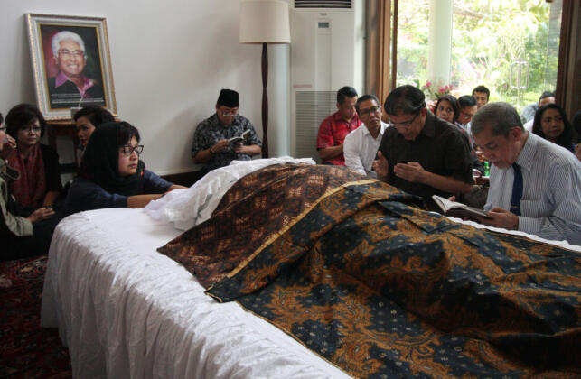 Sejumlah kerabat dan keluarga melayat pengacara senior Adnan Buyung Nasution di rumah duka Jalan Poncol Lestari, Lebak Bulus, Jakarta, Rabu (23/9). Almarhum Adnan Buyung Nasution meninggal dunia akibat sakit pada pukul 10.15 WIB setelah sepekan dirawat di Rumah Sakit Pondok Indah (RSPI). ANTARA FOTO/Reno Esnir/pras/15.