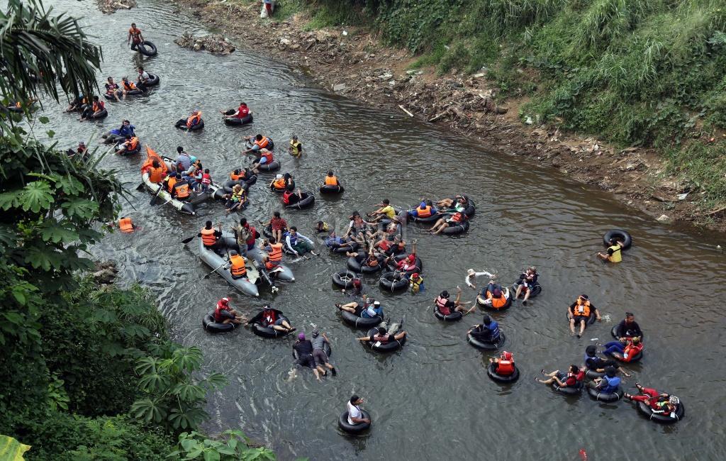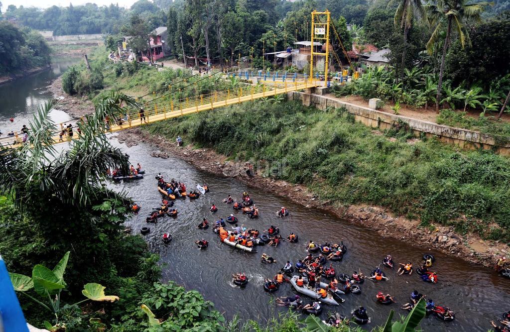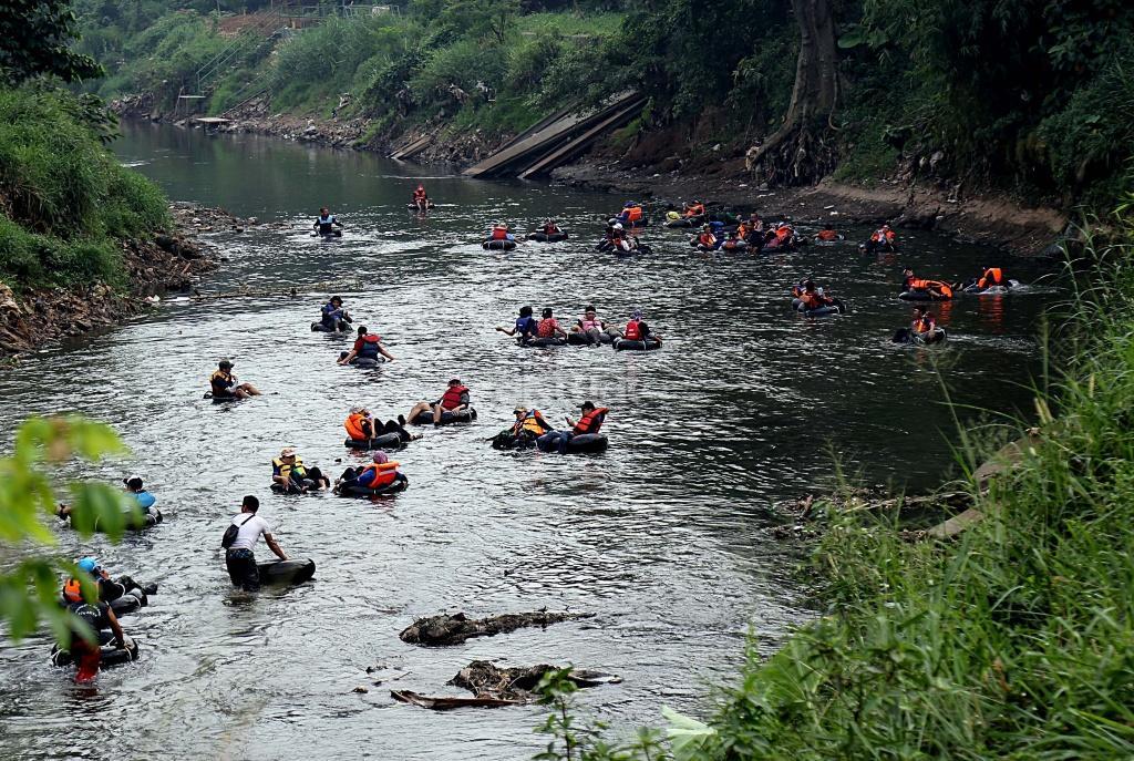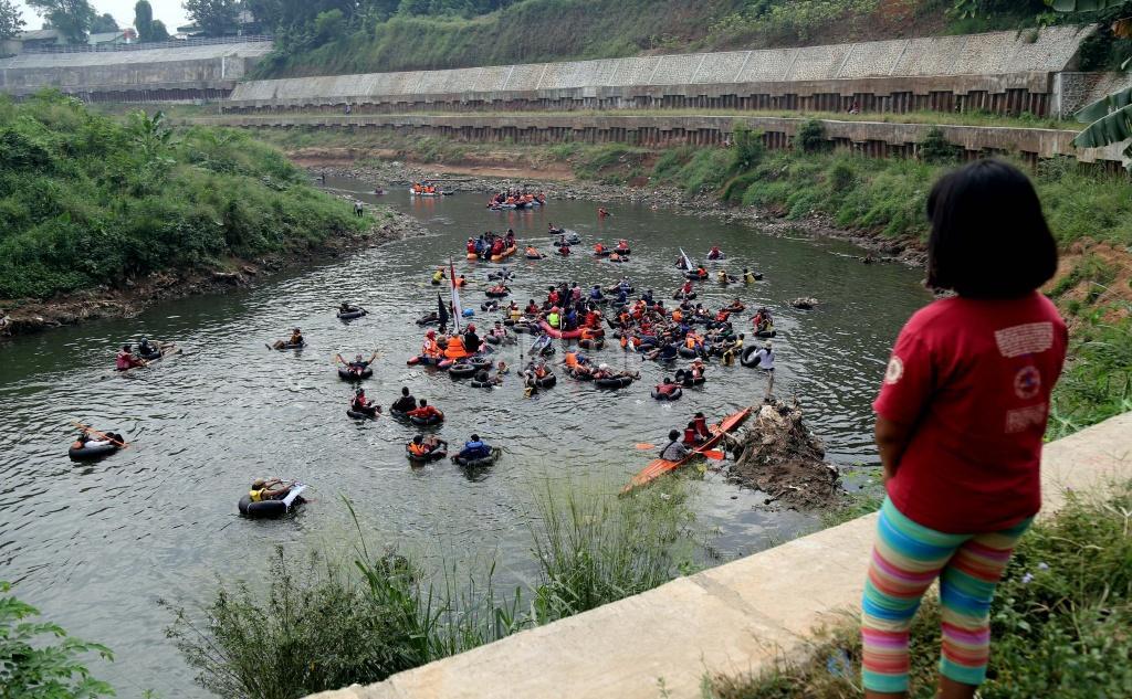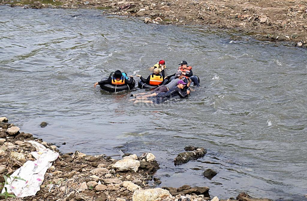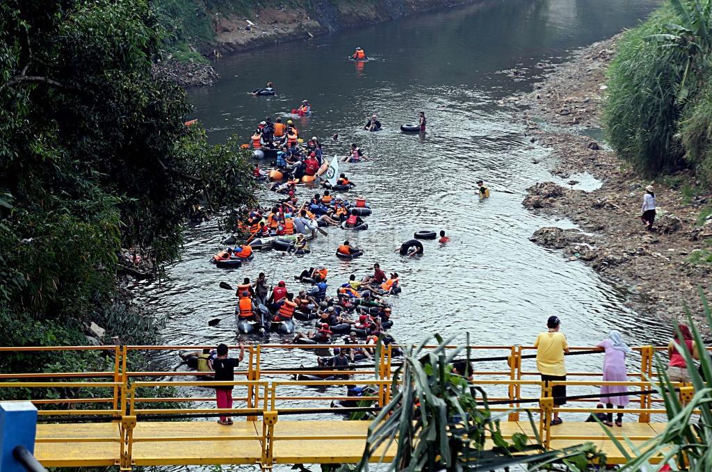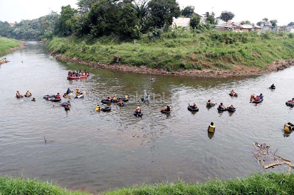 Puluhan warga menggunakan ban karet mengapung melintasi Sungai Ciliwung, Jakarta, Sabtu (26/8). Untuk pertama kalinya warga Jakarta mencicipi langsung eksotisme Sungai Ciliwung lewat Susur Sungai Ciliwung 2017 menempuh jarak sejauh tujuh kilometer dari Jembatan Jalan TB Simatupang ke kawasan Tanjungan di Condet, Jakarta Timur. Acara yang dihelat komunitas Tjondet ini diharapkan mampu menjadi salah satu alternatif wisata alam untuk masyarakat urban. AKTUAL/Tino Oktaviano