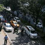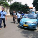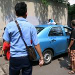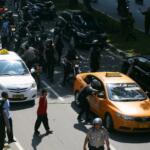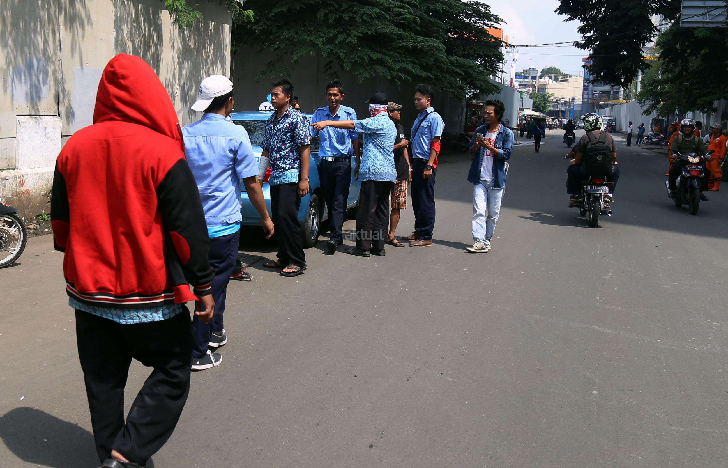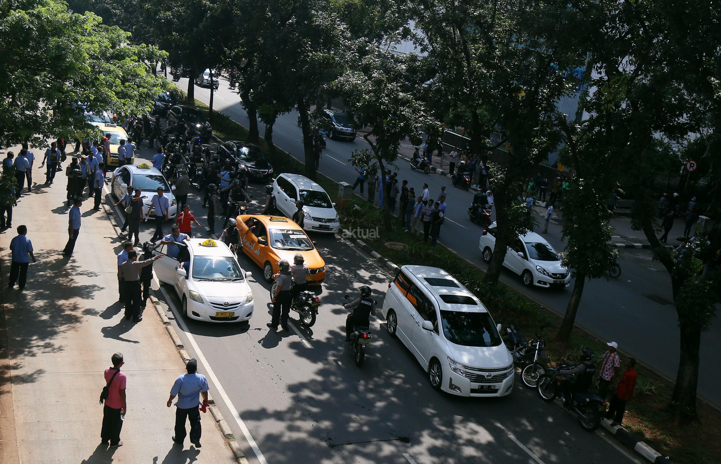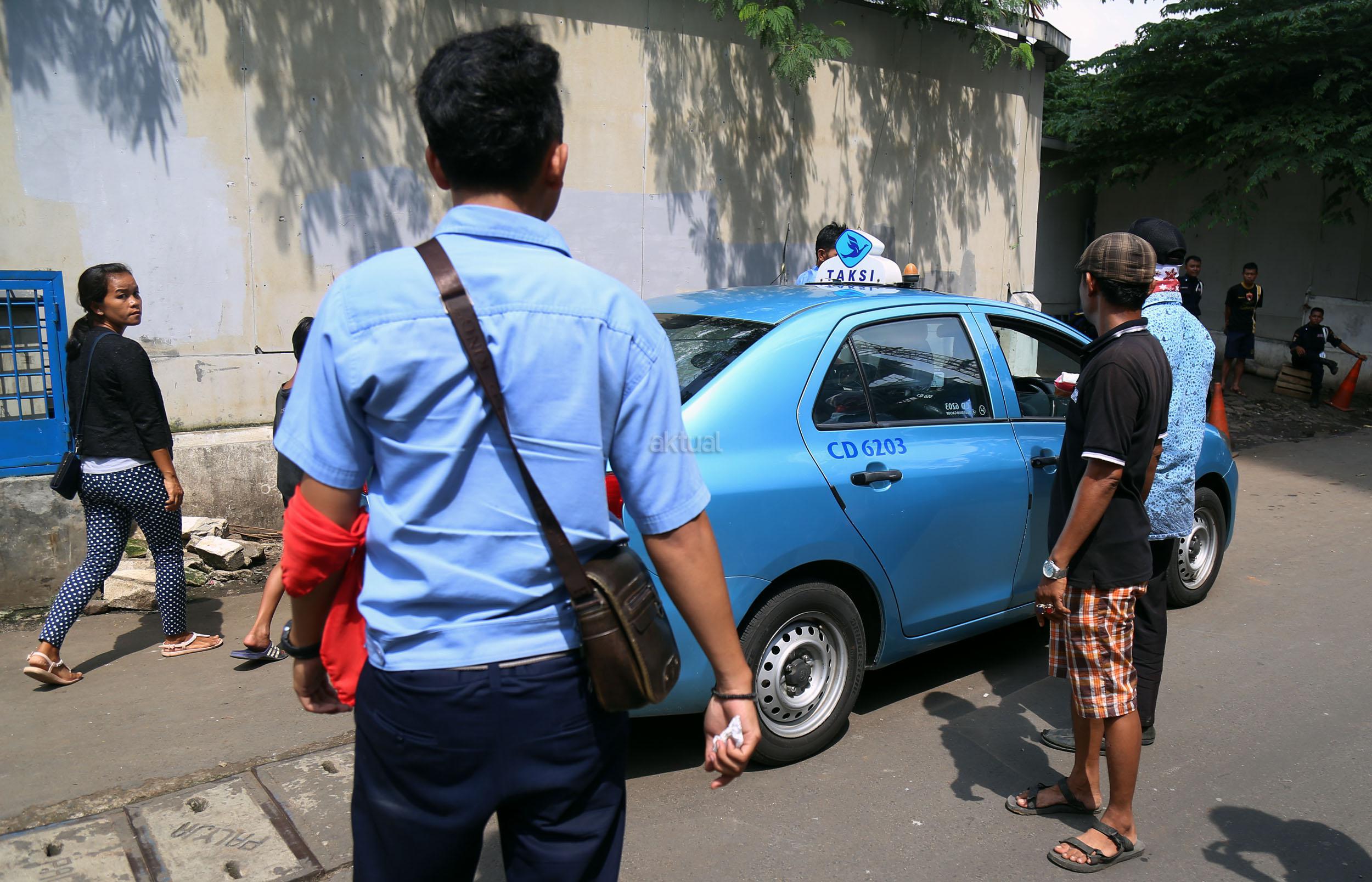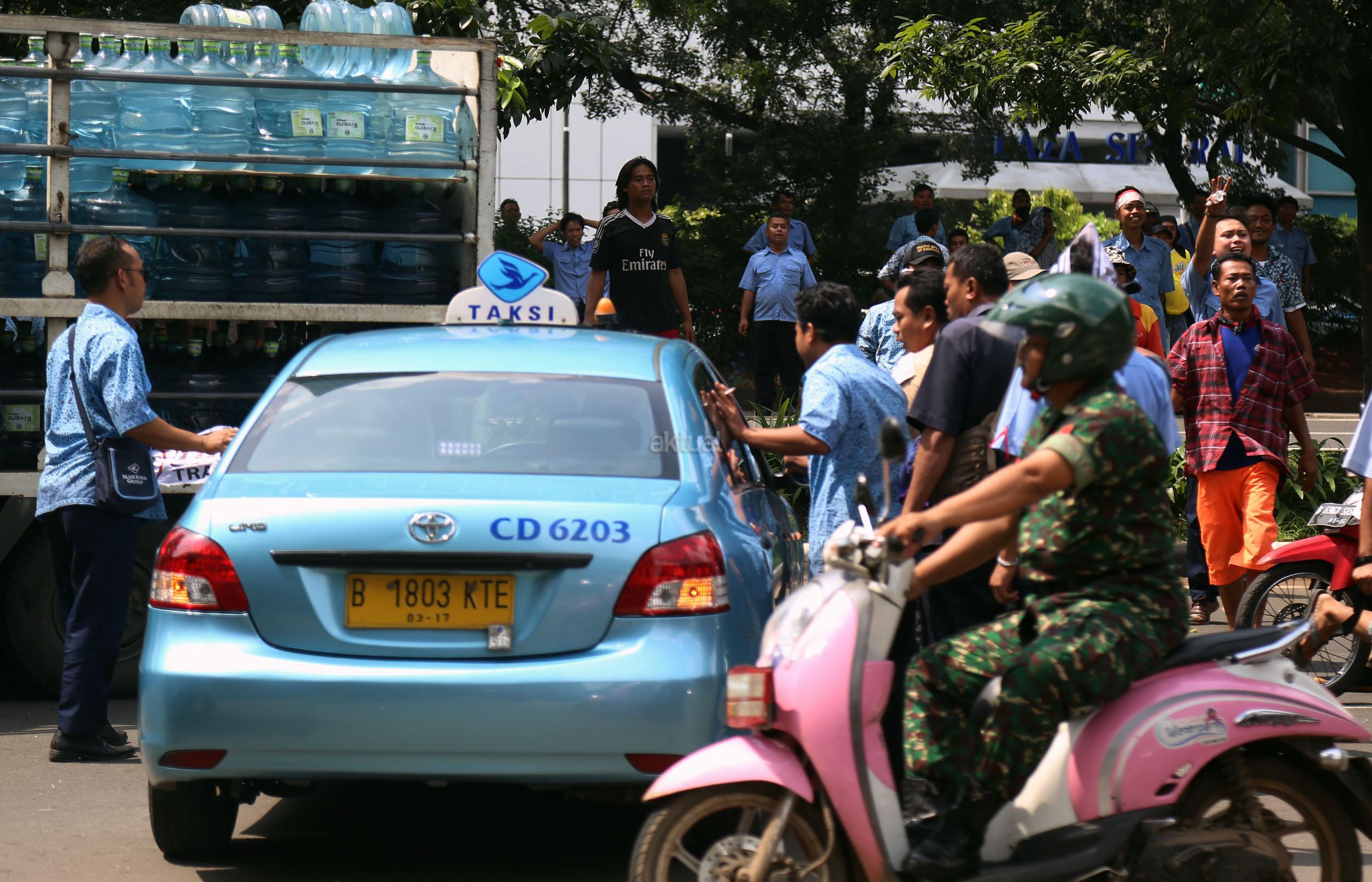 Terlihat para supir angkutan umum melakukan sweeping taksi di Bendungan Hilir, Jakarta, Selasa (22/3/2016). Tak hanya berdemo, massa juga melakukan sweeping terhadap sejumlah angkutan lain yang diketahui masih beroperasi dan massa juga menghentikan sejumlah bajaj maupun taksi yang ketahuan masih beroperasi, mereka juga memaksa penumpangnya turun.