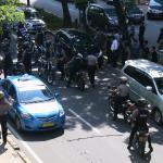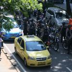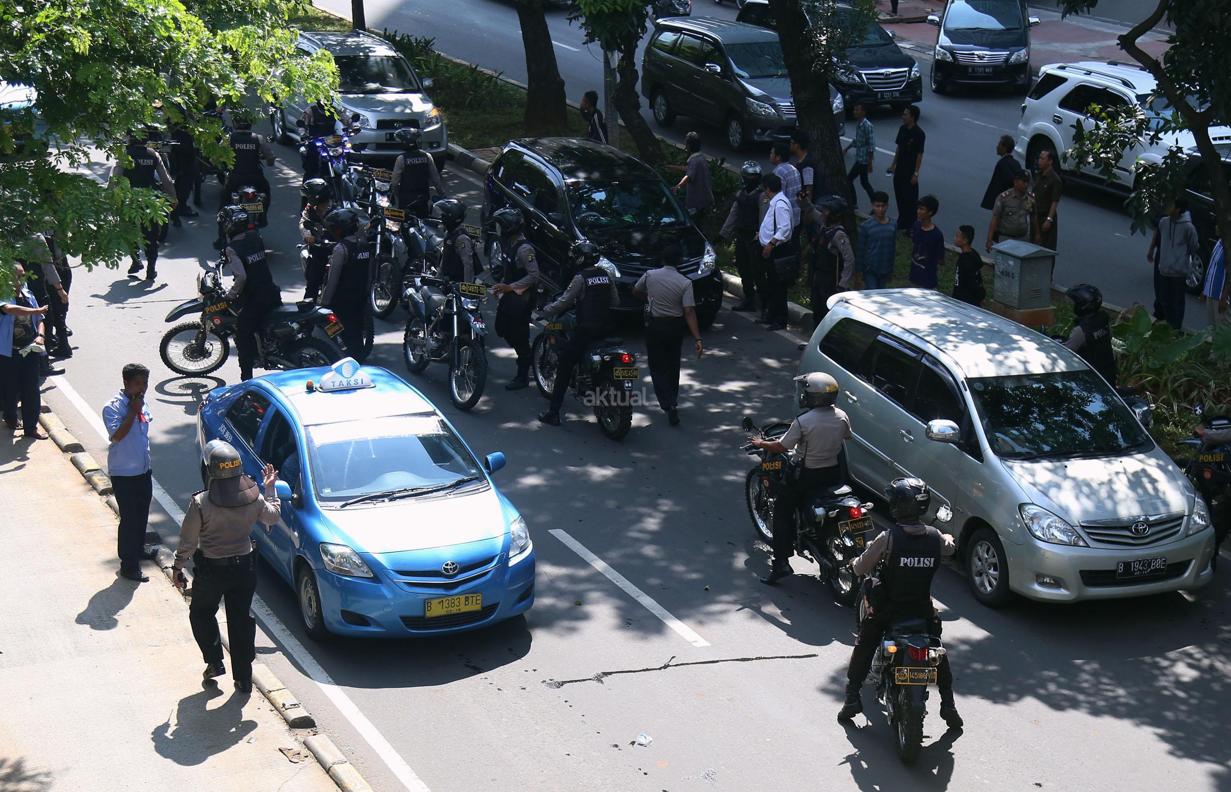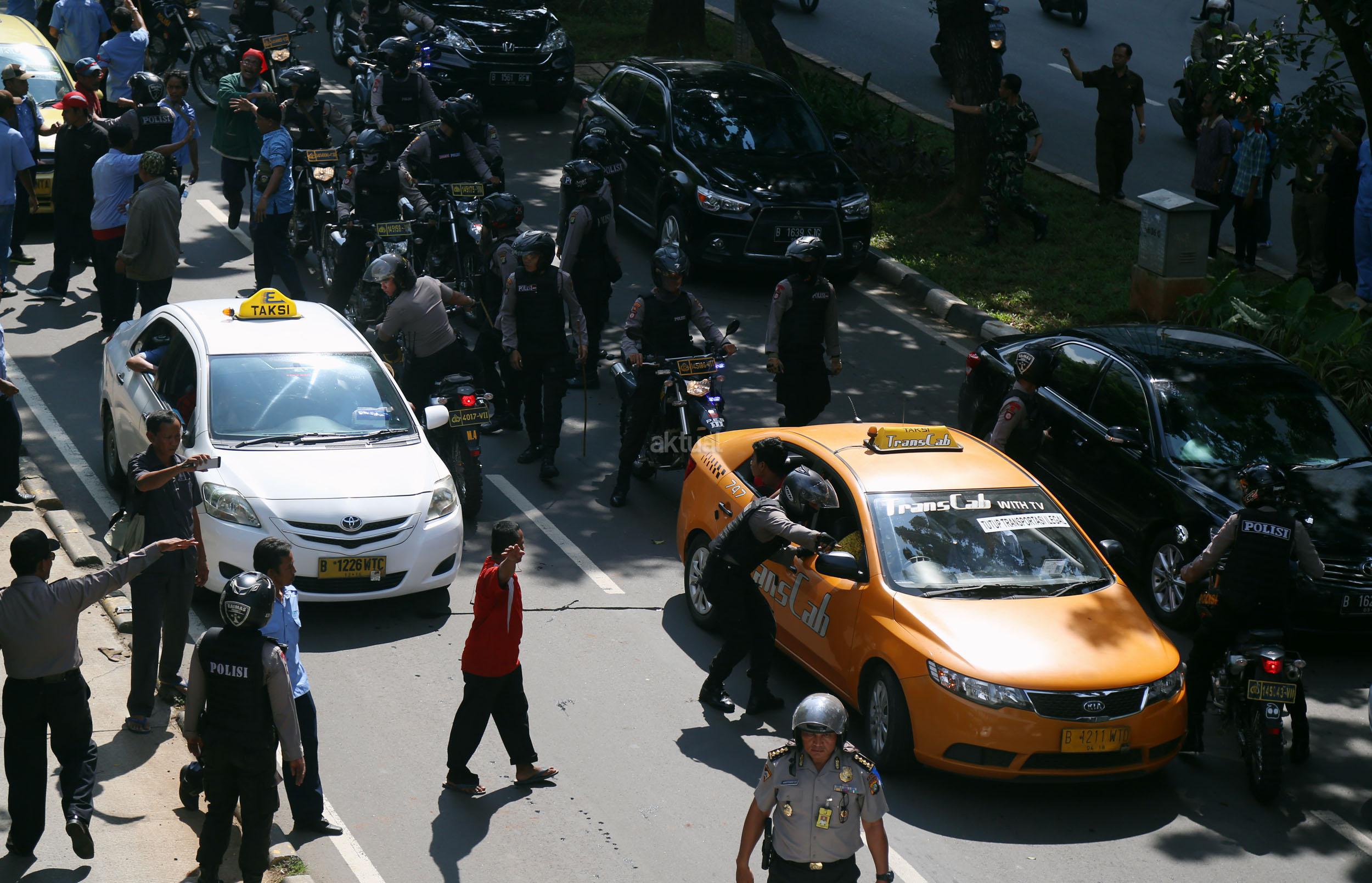 Terlihat para anggota Kepolisian menghalangi para supir untuk tidak melakukan sweeping di Bendungan Hilir, Jakarta, Selasa (22/3/2016). Tak hanya berdemo, massa juga melakukan sweeping terhadap sejumlah angkutan lain yang diketahui masih beroperasi dan massa juga menghentikan sejumlah bajaj maupun taksi yang ketahuan masih beroperasi, mereka juga memaksa penumpangnya turun.
