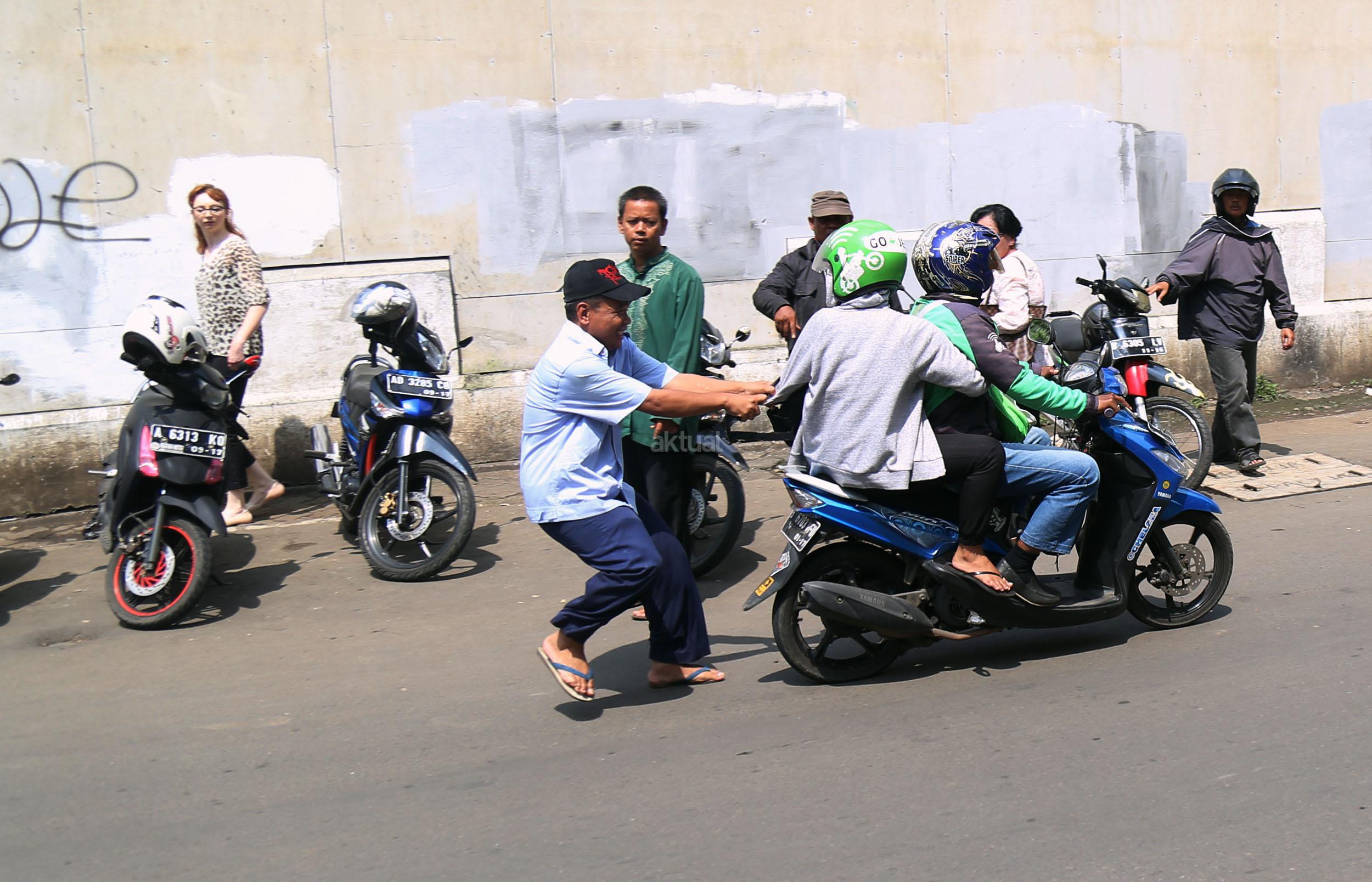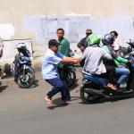 Para supir angkutan umum melakukan sweeping terhadap ojek online di Bendungan Hilir, Jakarta, Selasa (22/3/2016). Tak hanya berdemo, massa juga melakukan sweeping terhadap sejumlah angkutan lain yang diketahui masih beroperasi dan massa juga menghentikan sejumlah bajaj maupun taksi yang ketahuan masih beroperasi, mereka juga memaksa penumpangnya turun.