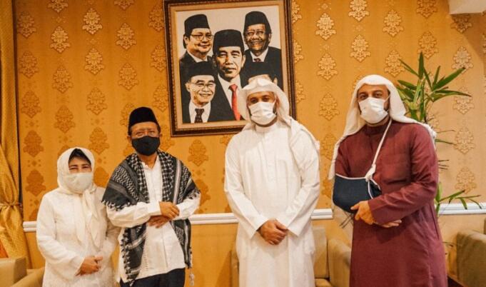 Syekh Ali Jaber datang bersama ayah dan adik kandungnya. Mereka diterima oleh Menko Mahfud MD bersama istri dan staf khusus.